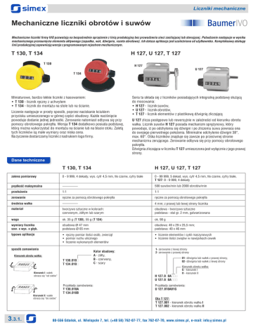 Liczniki mechaniczne Mechaniczne liczniki obrotów i suwów Mechaniczne liczniki firmy IVO pozwalają na bezpośrednie sprzężenie z linią produkcyjną bez prowadzenia sieci zasilającej lub sterującej. Pobudzanie następuje w wyniku mechanicznego przesunięcia elementu aktywnego (zapadka, wał, dźwignia, rozeta obrotowa). Ich dalsza aplikacja jest uzależniona od użytkownika. Kompleksową obsługę linii produkcyjnej zapewniają wersje z programowanym rejestrem mechanicznym. T 130, T 134 H 127, U 127, T 127 T 130 H 127 U 127 T 134 Miniaturowe, bardzo lekkie liczniki z kasowaniem: w T 130 - licznik ręczny z uchwytem w T 134 - licznik do montażu na stole lub na ścianie. Liczenie następuje w prosty sposób, poprzez naciskanie kciukiem przycisku umieszczonego w górnej części obudowy. Każde naciśnięcie powoduje dodanie jednej jednostki. Zerowanie natomiast odbywa się przy pomocy obrotowego pokrętła. Wersja T 134 dodatkowo posiada podstawę, którą można wykorzystać do montażu na ścianie lub na blacie stołu. Zaletą tych liczników są małe wymiary oraz niska cena. Na życzenie dostarczamy liczniki z nadrukiem logo firmy. Seria ta składa się z liczników posiadających integralną podstawę służącą do mocowania: w H 127 - licznik suwów, w U 127 - licznik obrotów, w T 127 - licznik elementów z plastikową dźwignią zliczającą U 127 zlicza postępowo lub rewersyjnie w zależności od kierunku obrotu wałka. Licznik suwów H 127 posiada mechanizm sprężynowy, który powoduje, iż po odchyleniu się dźwigni i po zliczeniu suwu powraca ona do swojego pierwotnego położenia. Minimalne odchylenie dźwigni 38°, max. 60°. Ośka liczników znajduje się zawsze po przeciwnej stronie mechanizmu zerującego. Zerowanie odbywa się przy pomocy obrotowego pokrętła. Dźwignia zliczająca w liczniku T 127 umieszczona jest wyłącznie z jego prawej strony. Dane techniczne zakres pomiarowy T 130, T 134 H 127, U 127, T 127 0 - 9 999, 4 dekady, wys. cyfr 4,5 mm, tło czarne, cyfry białe 0 - 99 999, 5 dekad, wys. cyfr 4,5 mm, tło czarne, cyfry białe, T 127: 0 - 9 999, 4 dekady 500 suwów/min lub 2000 obrotów/min prędkość maksymalna przełożenie 1:1 1:1 zerowanie ręczne za pomocą obrotowego pokrętła ręczne za pomocą obrotowego pokrętła średnica wałka 4 mm; z prawej lub lewej strony licznika materiał tworzywo sztuczne w kolorach: czerwonym, żółtym lub szarym obudowa - tworzywo sztuczne podstawa - stal gr. 2 mm, galwanizowana waga ok. 35 g (T 130), 55 g (T 134) ok. 90 g wymiary licznika szer. x wys. x głęb. obudowa Ø 47 mm podstawa Ø 65 mm obudowa: 40 x 29 x 25,5 mm; podstawa: 40 x 46 mm typowe aplikacje w ręczny pomiar ilości osób, zwierząt w pomiar ruchu ulicznego w liczenie wykonanych elementów w liczenie elementów i cykli maszynowych w liczenie ilości zwojów w nawijarkach cewek sposób zamawiania Kierunek obrotu wałka: T 130.010đ T 134.010đ 54321 Kierunek I: wałek obraca się “od siebie” 54321 Kierunek II: wałek obraca się “do siebie” 3.3.1. Kolor obudowy: A - żółty, B - czerwony, C - szary 1- zerowanie z lewej strony 2- zerowanie z prawej strony 01- dźwignia lub wałek z prawej strony, 02- dźwignia lub wałek z lewej strony H 127.0đ0Ađđđ U 127.0đ0Ađđđ Przykłady zamówienia: T 130.010A T 134.010B Kierunek obrotu wałka: G - kierunek I H - kierunek II Przykłady zamówienia: U 127.010A01G Dla T 127: T 127.001 - kierunek obrotu wałka I T 127.002 - kierunek obrotu wałka II 80-556 Gdańsk, ul. Wielopole 7, tel. (+48 58) 762-07-77, fax 762-07-70, www.simex.pl, e-mail: [email protected]
