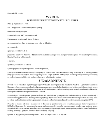 Sygn. akt I C 1551/11 WYROK W IMIENIU RZECZYPOSPOLITEJ POLSKIEJ Dnia 31 stycznia 2014 roku Sąd Okręgowy w Gdańsku I Wydział Cywilny w składzie następującym: Przewodniczący: SSO Mariusz Bartnik Protokolant: st. sekr. sąd. Aneta Graban po rozpoznaniu w dniu 21 stycznia 2014 roku w Gdańsku na rozprawie sprawy z powództwa T. S. przeciwko Skarbowi Państwa - Dyrektorowi Zakładu Karnego w S., zastępowanemu przez Prokuratorię Generalną Skarbu Państwa w Warszawie o zapłatę, 1)oddala powództwo w całości, 2)odstępuje od obciążenia powoda kosztami procesu, 3)zasądza od Skarbu Państwa - Sąd Okręgowy w Gdańsku na rzecz Kancelarii Radcy Prawnego A. J. kwotę 3.600 zł ( trzy tysiące sześćset złotych 00/100 ), powiększoną o 23 % podatku VAT tytułem kosztów pomocy prawnej udzielonej powodowi z urzędu, które nie zostały opłacone w całości ani w części. UZASADNIENIE Powód - T. S. wniósł do Sądu Okręgowego w Gdańsku pozew przeciwko Skarbowi Państwa - Dyrektorowi Zakładu Karnego w S., wnosząc o zasądzenie od pozwanego na rzecz powoda kwoty 150.000 zł tytułem zadośćuczynienia wraz z ustawowymi odsetkami od dnia wydania wyroku do dnia zapłaty. Jednocześnie powód wniósł o zwolnienie od kosztów sądowych i ustanowienie pełnomocnika z urzędu. Uzasadniając żądanie pozwu powód wskazał na niewłaściwe postępowanie funkcjonariuszy służby więziennej z korespondencją kierowaną do niego z Europejskiego Trybunału Praw Człowieka w Strasburgu w dniu 20 maja 2011 r., w tym na kradzież części korespondencji, przez co pozbawiony został możliwości wniesienia skargi do ETPC. Ponadto w okresie od dnia 1 marca 2010 r. do dnia 13 października 2011 r. funkcjonariusze służby więziennej w Zakładzie Karnym w S., wykorzystując zaburzenia osobowości powoda, poprzez negatywną i wrogą postawę wobec niego dążyli do wywołania u powoda postaw agresywnych i patologicznych, a następnie wywołali u powoda obniżony nastrój, depresję i głębokie poczucie doświadczonej krzywdy. (pozew, k. 2-3; pisma procesowe powoda z dnia 16 i 23.01.2012 r., k. 23, 30) W odpowiedzi na pozew pozwany - Skarb Państwa wniósł o oddalenie powództwa oraz o zasądzenie od powoda na rzecz Skarbu Państwa - Prokuratorii Generalnej Skarbu Państwa kosztów procesu, w tym kosztów zastępstwa procesowego według norm przepisanych. W uzasadnieniu odpowiedzi na pozew pozwany podniósł, że powód w żaden sposób nie wykazał domniemanej szkody, jej wysokości, jak i normalnego związku przyczynowego. Jednocześnie pozwany zaprzeczył wszystkim twierdzeniom powoda. Wskazał również, że nie znaleziono potwierdzenia złożenia przez powoda skarg, które dotyczyłyby domniemanej kradzieży jego korespondencji. Nadto, powód nie wskazał sposobu wyliczenia wysokości dochodzonego roszczenia i niezależnie od tego uznać je należy za rażąco wygórowane. (odpowiedź na pozew, k. 65-71) Postanowieniem z dnia 10 stycznia 2012 r. Sądu Okręgowego w Gdańsku powód został zwolniony od kosztów sądowych w części, tj. w zakresie opłaty od pozwu. (k. 19) Natomiast postanowieniem z dnia 9 sierpnia 2012 r. Sądu Okręgowego w Gdańsku ustanowiono dla powoda radcę prawnego z urzędu. (k. 228) W toku procesu, na rozprawie w dniu 17 października 2012 r. pełnomocnik powoda ograniczył żądanie pozwu w ten sposób, że podtrzymał żądanej zapłaty kwoty 50.000 zł, a w pozostałym zakresie cofnął pozew wraz ze zrzeczeniem się roszczenia. Wobec powyższego, postanowieniem z dnia 17 października 2012 r. Sąd umorzył postępowanie co do kwoty przekraczającej 50.000 zł. (k. 252, 255) Sąd ustalił następujący stan faktyczny: Powód - T. S. przebywał w Zakładzie Karnym w S. okresach od dnia 31 marca 2010 r. do dnia 6 maja 2010 r., od dnia 28 maja 2010 r. do dnia 13 czerwca 2011 r. oraz do dnia 20 lipca 2011 r. do dnia 13 października 2011 r. [okoliczność bezsporna] W dniach od 5 maja 2011 r. do 12 lipca 2011 r. do sekretariatu Zakładu Karnego w S. wpłynęły 3 listy urzędowe kierowane do powoda, których nadawcą był Europejski Trybunał Praw Człowieka w Strasburgu. W szczególności odnotowano wpływ takich przesyłek w następujących dniach: 20 maja 2011 r., 6 czerwca 2011 r. oraz 5 lipca 2011 r. Dwie pierwsze przesyłki zostały doręczone powodowi przez funkcjonariuszy Służby Więziennej, natomiast ostatnia została przesłana w ślad za powodem w związku z jego przetransportowaniem do innej jednostki penitencjarnej. Przesyłka doręczona powodowi w dniu 20 maja 2011 r. sklejona została szeroką taśmą przeźroczystą. Jednocześnie posiadała dane adresata umożliwiające jego identyfikację i zawierała pismo z dnia 5 maja 2011 r., do którego załączone zostały: dokument zawierający tekst Konwencji i protokołów dodatkowych oraz urzędowy formularz skargi wraz z informacją dla osób zamierzających wnieść skargę. W takiej postaci została odebrana przez funkcjonariusza Zakładu Karnego w S. i doręczona powodowi. Powód, po doręczeniu mu przedmiotowej korespondencji nie składał skargi dotyczącej stanu przesyłki bądź jej braków. Natomiast podczas pobytu w Areszcie Śledczym w S. powód skarżył się wobec współosadzonego D. Ł. na brak kodów kreskowych w korespondencji otrzymanej z Europejskiego Trybunału Praw Człowieka w Strasburgu, podczas jego pobytu w Zakładzie Karnym w S. - które miały na celu ułatwienie rozpoznania skargi powoda wnoszonej do Trybunału. [Dowód: notatka służbowa z dnia 06.03.2012 r., k. 82; notatka służbowa z dnia 05.03.2012 r., k. 83; ewidencja korespondencji, k. 84; potwierdzenie odbioru pisma, k. 85-86; pismo z dnia 05.05.2011 r., k. 36; zeznania świadka D. Ł., k. 253; zeznania świadka J. K. utrwalone na nośniku CD, k. 380] Powód nie identyfikuje się ze społecznie uznawanymi i cenionymi wartościami, nie podporządkowuje się autorytetom. Biorąc pod uwagę nieprawidłowo ukształt