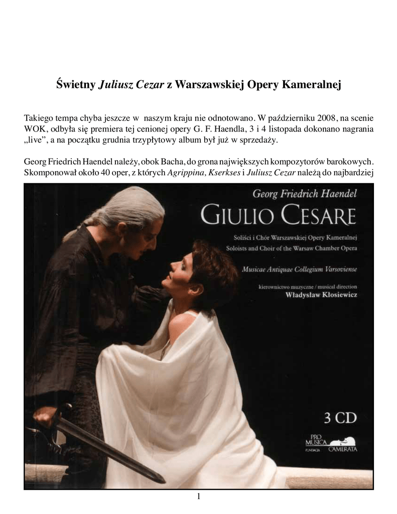 Świetny Juliusz Cezar z Warszawskiej Opery Kameralnej Takiego tempa chyba jeszcze w naszym kraju nie odnotowano. W październiku 2008, na scenie WOK, odbyła się premiera tej cenionej opery G. F. Haendla, 3 i 4 listopada dokonano nagrania „live”, a na początku grudnia trzypłytowy album był już w sprzedaży. Georg Friedrich Haendel należy, obok Bacha, do grona największych kompozytorów barokowych. Skomponował około 40 oper, z których Agrippina, Kserkses i Juliusz Cezar należą do najbardziej 1 znanych. Ta ostatnia opera miała swoją premierę 20 lutego 1724 roku, w Londynie. Jej akcja rozgrywa się w Egipcie w 48 roku p.n.e. i opowiada historię burzliwego związku Juliusza Cezara z Kleopatrą. Dzisiaj Juliusz Cezar należy do grona najczęściej wykonywanych i najbardziej cenionych oper Händla. Jeszcze za życia kompozytora wystawiono ją w Londynie aż 38 razy. Operę odkryto na nowo w Getyndze w 1922 r. i od tego czasu stanowi ona żelazny repertuar światowych scen. Dzisiaj chętnie wystawiają to dzieło wszystkie liczące się sceny. Kompozytor powiększył tu orkiestrę, dołączając do normalnie używanego wtedy składu także rogi, trąbki, flety i harfy. Do najpiękniejszych fragmentów opery zalicza się aria Cezara z towarzyszeniem koncertującego rogu, duet Kornelii i Sekstusa oraz wielka aria Kleopatry. Na uwagę zasługuje też większa niż w innych operach partia chóru. Wszystko to można odnaleźć w omawianym nagraniu, którego gwiazdą jest bez wątpienia zjawiskowa Olga Pasiecznik prezentująca wszystkie walory swojego pięknego dźwięcznego głosu i wielką kulturę muzyczną. Jej Kleopatra zachwyca każdą frazą, wysmakowaną ekspresją i koloraturą. Najpełniej przekonać się o tym można słuchając kapitalnie zaśpiewanej arii Da tempeste il legno infranto (CD 3 śc. 15). Godną jej partnerką jest Anna Radziejewska, która zachwycając pięknie brzmiącym mezzosopranem śpiewa partię Juliusza Cezara, (pierwotnie przeznaczoną dla słynnego kastrata sopranisty Senesiniego). Jednym z najpiękniejszych momentów w jej kreacji są słynne arie Cezara z I aktu Va tacito e nascosto z towarzyszeniem waltorni (CD1 śc.23) oraz z II aktu Se in fiorito ameno prato (CD 2 śc. 5). Finałowy duet Kleopatry z Juliuszem Cezarem w wykonaniu obu pań to prawdziwy majstersztyk. Zresztą tych udanych kreacji wokalnych jest w tym nagraniu naprawdę wiele. Można się zachwycać wspaniałą Dorotą Lachowicz w partii Kornelii, wdowy po Pompejuszu. Podobnie jest w przypadku Jacka Laszczkowskiego obdarzonego fantastycznym męskim sopranem, który z pełnym powodzeniem zaśpiewał forsowną partię Sekstusa, tworząc wyrazistą postać człowieka opętanego rządzą zemsty. Pozostałe partię śpiewają młodzi obiecujący kontratenorzy: Jan Monowid (Tolomeo) i Karol Bartosiński (Nireno) oraz bardziej doświadczeni śpiewacy: Jarosław Bręk (Achilla) i Sławomir Jurczak (Curio). Muzycy Musicae Antiquae Collegium grający na historycznych instrumentach pod dyrekcją Władysława Kłosiewicza okazują się zespołem wytrawnych muzyków prezentujących wysoki poziom muzycznej dyscypliny oraz niezwykłą precyzję i pełną blasku lekkość i przejrzystość brzmienia. iłośnicy opery barokowej powinni bliżej zainteresować się tym albumem. Wydawcą płyty jest Fundacja Pro Musica Camerata 2