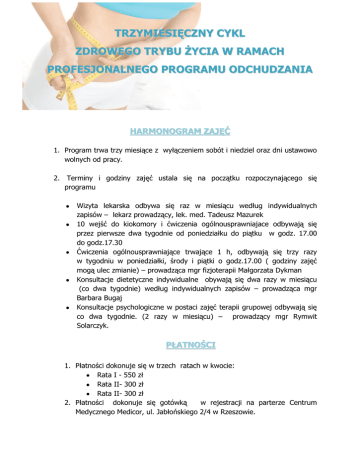 TRZYMIESIĘCZNY CYKL ZDROWEGO TRYBU ŻYCIA W RAMACH PROFESJONALNEGO PROGRAMU ODCHUDZANIA HARMONOGRAM ZAJĘĆ 1. Program trwa trzy miesiące z wyłączeniem sobót i niedziel oraz dni ustawowo wolnych od pracy. 2. Terminy i godziny zajęć ustala się na początku rozpoczynającego się programu Wizyta lekarska odbywa się raz w miesiącu według indywidualnych zapisów – lekarz prowadzący, lek. med. Tadeusz Mazurek 10 wejść do kiokomory i ćwiczenia ogólnousprawniajace odbywają się przez pierwsze dwa tygodnie od poniedziałku do piątku w godz. 17.00 do godz.17.30 Ćwiczenia ogólnousprawniające trwające 1 h, odbywają się trzy razy w tygodniu w poniedziałki, środy i piątki o godz.17.00 ( godziny zajęć mogą ulec zmianie) – prowadząca mgr fizjoterapii Małgorzata Dykman Konsultacje dietetyczne indywidualne obywają się dwa razy w miesiącu (co dwa tygodnie) według indywidualnych zapisów – prowadząca mgr Barbara Bugaj Konsultacje psychologiczne w postaci zajęć terapii grupowej odbywają się co dwa tygodnie. (2 razy w miesiącu) – prowadzący mgr Rymwit Solarczyk. PŁATNOŚCI 1. Płatności dokonuje się w trzech ratach w kwocie: Rata I - 550 zł Rata II- 300 zł Rata II- 300 zł 2. Płatności dokonuje się gotówką w rejestracji na parterze Centrum Medycznego Medicor, ul. Jabłońskiego 2/4 w Rzeszowie. 3. W przypadku braku możliwości udziału w programie w związku z istniejącymi przeciwwskazaniami zdrowotnymi uczestnik ma prawo do zwrotu wpłaconej kwoty pomniejszonej o koszty konsultacji lekarskiej w wysokości 90 zł. 4. Przeciwwskazania zdrowotne muszą być potwierdzone podczas pierwszej wizyty lekarskiej odbytej w ramach Profesjonalnego Programu Odchudzania, natomiast rezygnacja powinna być zgłoszona osobiście lub telefonicznie w ciągu 2 dni od dnia wizyty lekarskiej. INFORMACJE 1. W celu uzyskania jak najlepszych efektów z zabiegów, zaleca się korzystanie z kriokomory codziennie nieprzerwanie od poniedziałku do piątku przez 10 dni, w przypadku 1 do maksymalnie 2 nieobecności, istnieje możliwość odrobienia nieobecnego dnia w wyznaczonym przez pracownika CM Medicor terminie. W przypadku braku możliwości odrobienia przez uczestnika zajęć, zwrotu gotówki za kriokomorę nie przewiduje się. 2. Ze względów bezpieczeństwa przebywanie i ćwiczenia na Sali gimnastycznej mogą odbywać się tylko pod kontrolą osoby prowadzącej zajęcia. 3. Zajęcia odbywają się w małych grupach mieszanych (kobiety i mężczyźni) od 10-15 osób. OBOWIĄZKOWY STRÓJ DO KRIOKOMORY WYSKOKIE SKARPETY ZAKRYWAJĄCE KOLANA (BAWEŁNIANE, WEŁNIANE LUB POLAROWE) SPODENKI LUB LEGINSY ( BAWEŁNIANE LUB POLAROWE) KOSZULKA BAWEŁNIANA ( KRÓTKI RĘKAW LUB BEZ RĘKAWÓW) OPASKA NA USZY LUB CZAPKA BAWEŁNIANA LUB POLAROWA RĘKAWICZKI (BAWEŁNIANE, WEŁNIANE LUB POLAROWE) RĘCZNIK DO WYCIERANIA SKÓRY PRZED WEJŚCIEM DO KRIOKOMORY OBOWIĄZKOWO ZDJĘTA BIŻUTERIA Cały strój do kupienia w Aptece Medicor (parter budynku głównego CM MEDICOR).