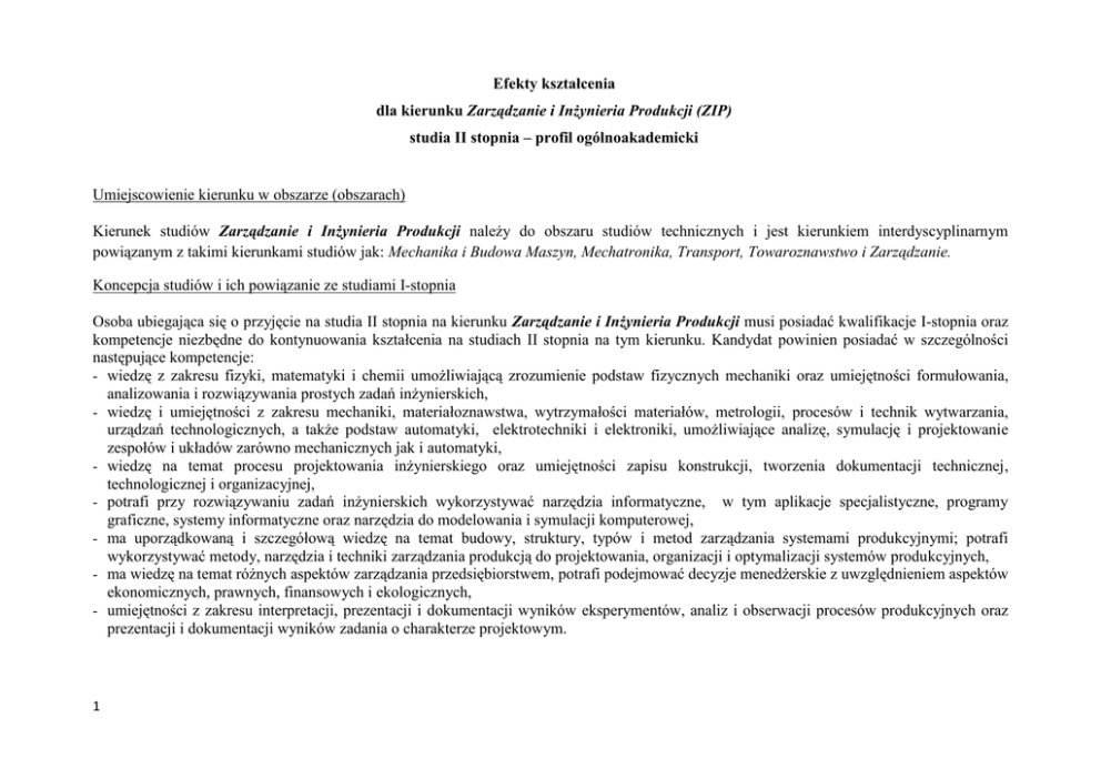 Efekty kształcenia dla kierunku Zarządzanie i Inżynieria Produkcji (ZIP) studia II stopnia – profil ogólnoakademicki Umiejscowienie kierunku w obszarze (obszarach) Kierunek studiów Zarządzanie i Inżynieria Produkcji należy do obszaru studiów technicznych i jest kierunkiem interdyscyplinarnym powiązanym z takimi kierunkami studiów jak: Mechanika i Budowa Maszyn, Mechatronika, Transport, Towaroznawstwo i Zarządzanie. Koncepcja studiów i ich powiązanie ze studiami I-stopnia Osoba ubiegająca się o przyjęcie na studia II stopnia na kierunku Zarządzanie i Inżynieria Produkcji musi posiadać kwalifikacje I-stopnia oraz kompetencje niezbędne do kontynuowania kształcenia na studiach II stopnia na tym kierunku. Kandydat powinien posiadać w szczególności następujące kompetencje: - wiedzę z zakresu fizyki, matematyki i chemii umożliwiającą zrozumienie podstaw fizycznych mechaniki oraz umiejętności formułowania, analizowania i rozwiązywania prostych zadań inżynierskich, - wiedzę i umiejętności z zakresu mechaniki, materiałoznawstwa, wytrzymałości materiałów, metrologii, procesów i technik wytwarzania, urządzań technologicznych, a także podstaw automatyki, elektrotechniki i elektroniki, umożliwiające analizę, symulację i projektowanie zespołów i układów zarówno mechanicznych jak i automatyki, - wiedzę na temat procesu projektowania inżynierskiego oraz umiejętności zapisu konstrukcji, tworzenia dokumentacji technicznej, technologicznej i organizacyjnej, - potrafi przy rozwiązywaniu zadań inżynierskich wykorzystywać narzędzia informatyczne, w tym aplikacje specjalistyczne, programy graficzne, systemy informatyczne oraz narzędzia do modelowania i symulacji komputerowej, - ma uporządkowaną i szczegółową wiedzę na temat budowy, struktury, typów i metod zarządzania systemami produkcyjnymi; potrafi wykorzystywać metody, narzędzia i techniki zarządzania produkcją do projektowania, organizacji i optymalizacji systemów produkcyjnych, - ma wiedzę na temat różnych aspektów zarządzania przedsiębiorstwem, potrafi podejmować decyzje menedżerskie z uwzględnieniem aspektów ekonomicznych, prawnych, finansowych i ekologicznych, - umiejętności z zakresu interpretacji, prezentacji i dokumentacji wyników eksperymentów, analiz i obserwacji procesów produkcyjnych oraz prezentacji i dokumentacji wyników zadania o charakterze projektowym. 1 Kandydat, który w wyniku ukończenia studiów I-stopnia i innych form kształcenia nie uzyskał części ww. kompetencji, może podjąć studia IIstopnia na kierunkuZarządzanie i Inżynieria Produkcji, jeżeli uzupełnienie braków kompetencyjnych może być zrealizowane przez zaliczenie zajęć w wymiarze nieprzekraczającym 30 punktów ECTS. Objaśnienie oznaczeń: K – kierunkowe efekty kształcenia, W – kategoria wiedzy, U – kategoria umiejętności, K (po podkreślniku) - kategoria kompetencji społecznych, T2A – efekty kształcenia dla kwalifikacji II stopnia w obszarze kształcenia odpowiadającym obszarowi nauk technicznych. Na kierunku Zarządzanie i Inżynieria Produkcji (ZIP) prowadzone są cztery specjalności: Organizacja Produkcji(OP), Zarządzanie Jakością (ZJ), Logistyka Stosowana (LS) oraz Production Management(PM). Gdzie: K1xxx – symbol dla kierunku na I stopniu studiów K2xxx – symbol dla kierunku na II stopniu studiów 2 Efekty Kształcenia na II stopniu studiów dla kierunku (ZIP) OPIS KIERUNKOWYCH EFEKTÓW KSZTAŁCENIA Po zakończeniu studiów II stopnia na kierunku ZIP Odniesienie efektów kształcenia dla obszaru nauk technicznych (T), WIEDZA K2ZIP_W01 Ma wiedzę z zakresu sposobów i metod zarządzania projektami, organizacji, planowania i wartościowania pracy w projekcie, zna metody techniczno-ekonomicznej oceny przedsięwzięć innowacyjnych. T2A_W04, T2A_W08, T2A_W09, T2A_W11, K2ZIP_W02 Ma wiedzę na temat metod i technik modelowania graficznego systemów produkcyjnych o charakterze dyskretnym, zna zasady budowy modeli oraz parametry optymalizacyjne. T2A_W04, T2A_W07, K2ZIP_W03 Ma wiedzę na temat modeli i metod prognozowania oraz metod modelowania procesów wytwórczych dyskretnych i ciągłych, zna narzędzia do symulacji procesów dyskretnych oraz podstawowe kryteria optymalizacyjne. T2A_W03, T2A_W07, K2ZIP_W04 Ma wiedzę na temat nowoczesnych metod projektowania, w tym koncepcyjnego i konstrukcyjnego wyrobów oraz technologicznego projektowania prototypów i serii prototypowych zna metody tworzenia wirtualnych i fizycznych modeli nowych produktów oraz wybrane aspekty konstrukcji technicznych. T2A_W02, T2A_W04, T2A_W05, 3 K2ZIP_W05 Ma wiedzę na temat celi zarządzania wiedzą oraz zna zasady zarządzania wiedzą w przedsiębiorstwie jak również wybrane strategie praktycznego wdrażania systemów zarządzania wiedzą do praktyki przemysłowej. T2A_W05, T2A_W08, K2ZIP_W06 Ma podstawową wiedzę na temat najnowszych koncepcji zarządzania strategicznego oraz zna modele strategii przedsiębiorstwa. T2A_W02, T2A_W09, T2A_W11, K2ZIP_W07 Zna pojęcia i metody organizacji systemów produkcyjnych oraz ich projektowania, ma wiedzę na temat form organizacji procesu produkcyjnego z uwzględnieniem powiązań między elementami systemu produkcyjnego. T2A_W03, T2A_W11, K2ZIP_W08 Ma podstawową wiedzę na temat wymagań dotyczących zgodności wyrobów, ze szczególnym uwzględnieniem aspektów bezpieczeństwa maszyn i urządzeń oraz instalacji. T2A_W02, T2A_W06, K2ZIP_W09 Osiąga dodatkowe efekty kształcenia w kategorii wiedza na jednej z czterech następujących specjalności: - Organizacja produkcji (efekty opisano w załączniku 1), - Zarządzanie jakością (efekty opisano w załączniku 2), - Logistyka (efekty opisano w załączniku 3), - Production Management (efekty opisano w załączniku 3). K2ZIP_W10 Ma podstawową wiedzę niezbędną do rozumienia społecznych funkcji komunikowania w działalności inżynierskiej. T2A_W08 K2ZIP_W11 Ma podstawow