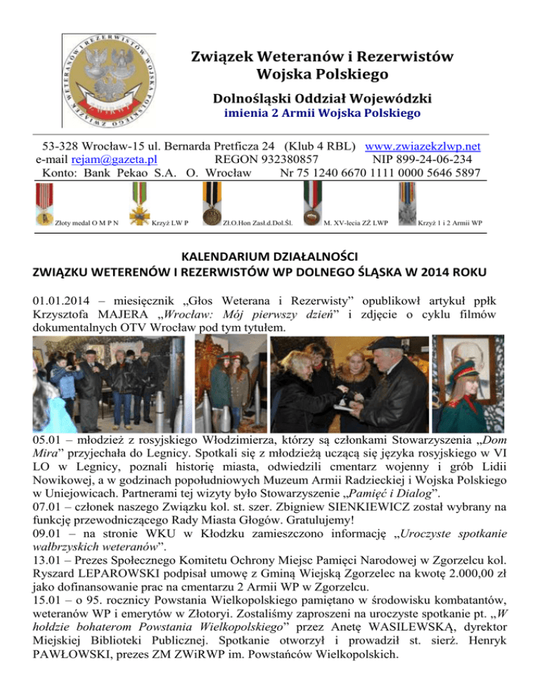 Związek Weteranów i Rezerwistów Wojska Polskiego Dolnośląski Oddział Wojewódzki imienia 2 Armii Wojska Polskiego 53-328 Wrocław-15 ul. Bernarda Pretficza 24 (Klub 4 RBL) www.zwiazekzlwp.net e-mail [email protected] REGON 932380857 NIP 899-24-06-234 Konto: Bank Pekao S.A. O. Wrocław Nr 75 1240 6670 1111 0000 5646 5897 Złoty medal O M P N Krzyż LW P Zł.O.Hon Zasł.d.Dol.Śl. M. XV-lecia ZŻ LWP Krzyż 1 i 2 Armii WP KALENDARIUM DZIAŁALNOŚCI ZWIĄZKU WETERENÓW I REZERWISTÓW WP DOLNEGO ŚLĄSKA W 2014 ROKU 01.01.2014 – miesięcznik „Głos Weterana i Rezerwisty” opublikowł artykuł ppłk Krzysztofa MAJERA „Wrocław: Mój pierwszy dzień” i zdjęcie o cyklu filmów dokumentalnych OTV Wrocław pod tym tytułem. 05.01 – młodzież z rosyjskiego Włodzimierza, którzy są członkami Stowarzyszenia „Dom Mira” przyjechała do Legnicy. Spotkali się z młodzieżą uczącą się języka rosyjskiego w VI LO w Legnicy, poznali historię miasta, odwiedzili cmentarz wojenny i grób Lidii Nowikowej, a w godzinach popołudniowych Muzeum Armii Radzieckiej i Wojska Polskiego w Uniejowicach. Partnerami tej wizyty było Stowarzyszenie „Pamięć i Dialog”. 07.01 – członek naszego Związku kol. st. szer. Zbigniew SIENKIEWICZ został wybrany na funkcję przewodniczącego Rady Miasta Głogów. Gratulujemy! 09.01 – na stronie WKU w Kłodzku zamieszczono informację „Uroczyste spotkanie wałbrzyskich weteranów”. 13.01 – Prezes Społecznego Komitetu Ochrony Miejsc Pamięci Narodowej w Zgorzelcu kol. Ryszard LEPAROWSKI podpisał umowę z Gminą Wiejską Zgorzelec na kwotę 2.000,00 zł jako dofinansowanie prac na cmentarzu 2 Armii WP w Zgorzelcu. 15.01 – o 95. rocznicy Powstania Wielkopolskiego pamiętano w środowisku kombatantów, weteranów WP i emerytów w Złotoryi. Zostaliśmy zaproszeni na uroczyste spotkanie pt. „W hołdzie bohaterom Powstania Wielkopolskiego” przez Anetę WASILEWSKĄ, dyrektor Miejskiej Biblioteki Publicznej. Spotkanie otworzył i prowadził st. sierż. Henryk PAWŁOWSKI, prezes ZM ZWiRWP im. Powstańców Wielkopolskich. Przywitał serdecznie zaproszonych gości w osobach: przewodniczącego Rady Powiatu Zenona BERNACKIEGO, starosty Ryszarda RASZKIEWICZA, przewodniczącego Rady Miasta Złotoryja Romana GORZKOWSKIEGO, sekretarza Urzędu Miejskiego Włodzimierza BAJOŃSKIEGO, wiceprezesa Zarządu Głównego, prezesa Zarządu Dolnośląskiego ZWiRWP ppłk Krzysztofa MAJERA, członka Zarządu Dolnośląskiego ZWiRWP kpt. żegl. Ryszarda ZŁOCIŃSKIEGO, prezesa Towarzystwa Pamięci Powstania Wielkopolskiego w Legnicy Czesława KOWALAKA, prorektora Wyższej Szkoły Medycznej w Legnicy doc. dr Ryszarda PĘKAŁĘ – wnuka powstańca. Spotkanie stało się okazją do podziękowania za popularyzację tradycji i historii Wojska Polskiego, kształtowanie patriotycznych postaw młodzieży i udział w uroczystościach patriotyczno-religijnych w miejscach pamięci narodowej, za co Zarząd Główny ZWiRWP wyróżnił: Srebrną Odznaką Zasłużony dla ZWiRWP – szer. Ireneusza ZAWADZKIEGO; Krzyżem Zasługi dla ZWiRWP st. sierż. Ryszarda RASZKIEWICZA – srebrnym, st. sierż. Henryka PAWŁOWSKIEGO, kpr. Jana WĘGRZYNA – brązowym; Medalem XX-lecia ZWiRWP – kpt. Stanisława MIKUSA, szer. Zbigniewa SZYBIAKA; Medalem 70-lecia Chrztu Bojowego 1 Dywizji Piechoty – płk Jerzego PESZKO, st. sierż. Henryka PAWŁOWSKIEGO, szer. Jana GŁOWACKIEGO, kpr. Jana WĘGRZYNA, szer. Władysława DĄBROWSKIEGO. Następnie prezes Czesław KOWALAK z ogromną swadą przedstawił swoje poszukiwania popularno-naukowe na rzecz dokumentowania pamięci o Powstaniu Wielkopolskim, a zwłaszcza losów powstańców. Jak przystało na emerytowanego nauczyciela historii swój wykład bogato ilustrował. Pewnie nie wszyscy wiedzą, że do Legnicy pod II wojnie światowej losy rzuciły prawie czterdziestu powstańców wielkopolskich. Przygotowuje do druku kolejny artykuł o powstańcach. Podkreślił, iż jednym z nich jest złotoryjanin ppor. Andrzej FIKSA który na swym grobie ma wyryty krzyż powstańczy. Posługując się albumem rodzinnym Roman GORZKOWSKI zaprezentował patriotycze kartki i zdjęcia. Jako ciekawostkę pokazał kartki wysłane pocztą polową w czasie I wojny światowej z lazaretu w ówczesnym Goldberg, przez Polaków do rodzin w Poznańskiem. Kolejną atrakcją był montaż słowno-muzyczny o powstaniu, który pod wodzą Bożeny GMEREK z ogromnym zaangażowaniem i przejęciem przygotowali oraz przedstawili członkowie Klubu Seniora w Złotoryi. Pani Helena KMIECIK zaś recytowała swój wiersz, który specjalnie napisała na tą uroczystość. Ostatnim elementem spotkania była projekcja fabularyzowanego filmu dokumentalnego red. BogusławaWOŁOSZAŃSKIEGO o powstaniu. Warto podkreślić, że dzięki ogromnemu zaangażowaniu prezesa Czesława KOWALAKA pamięć o powstaniu i powstańcach jest ciągle żywa. Corocznie uczniowie Szkoły Podstawowej Nr 1 im. Powstańców Wielkopolskich wraz z władzami miasta Legnicy, zapalają znicze i składają kwiaty na grobach powstańców w rocznicę jego wybuchu 27 grudnia. Zaś złotoryjski oddział ZWiRWP jako jedyny w kraju przyjął imię Powstańców Wielkopolskich. 16.01 – w siedzibie Zarządu Okręgowego ZWI RP we Wrocławiu odbyło sie doroczne spotkanie prezesów porozumienia związków, które reprezentowali: Związek Kombatantów RP i BWP – kpt. Konstanty IGNACZAK, prezes DZW, Związek Żołnierzy WP – płk Marian DĄBROWSKI, prezes ZW, Towarzystwo Wiedzy Obronnej – płk Aleksander PODOLSKI, sekretarz Zarządu Okręgowego, Stowarzyszenie Tradycji i Myśli Obronnej – płk dr Władysław TKACZEW, prezes, Związek Inwalidów Wojennych RP – płk Wojciech OLENDREK, prezes ZO i płk Stefan KOZIARA, redaktor naczelny „Biuletynu”, Oddział IBN im. gen. Edwina Rozłubirskiego – płk dr Andrzej KOTLIŃSKI, prezes, ZWiRWP – ppłk Krzysztof MAJER – wiceprezes ZG. Zebranie prowadził kol. Krzysztof MAJE