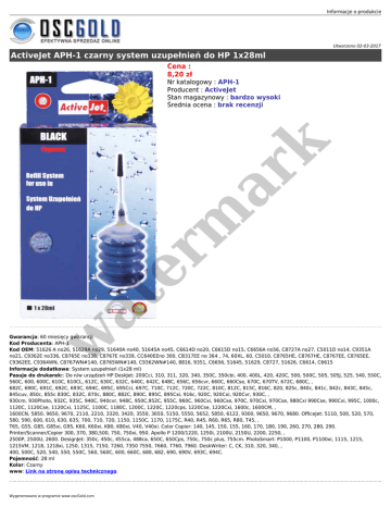 Informacje o produkcie Utworzono 02-03-2017 ActiveJet APH-1 czarny system uzupełnień do HP 1x28ml Cena : 8,20 zł w at er m ar k Nr katalogowy : APH-1 Producent : ActiveJet Stan magazynowy : bardzo wysoki Średnia ocena : brak recenzji Gwarancja: 60 miesięcy gwarancji Kod Producenta: APH-1 Kod OEM: 51626 A no26, 51629A no29, 51640A no40, 51645A no45, C6614D no20, C6615D no15, C6656A no56, C8727A no27, C5011D no14, C9351A no21, C9362E no336, C8765E no338, C8767E no339, CC640EEno 300, CB317EE no 364 , 74, 60XL, 60, C5010, C8765HE, C8767HE, C8767EE, C8765EE, C9362EE, C9364WN, C8767WN#140, C8765WN#140, C9362WN#140, 8816, 9351, C6656, 51645, 51629, C8727, 51626, C6614, C6615 Informacje dodatkowe: System uzupełnień (1x28 ml) Pasuje do drukarek:: Do n/w urządzeń HP DeskJet: 200Cci, 310, 311, 320, 340, 350C, 350cbi, 400, 400L, 420, 420C, 500, 500C, 505, 505J, 525, 540, 550C, 560C, 600, 600C, 610C, 610CL, 612C, 630C, 632C, 640C, 642C, 648C, 656C, 656cvr, 660C, 660Cse, 670C, 670TV, 672C, 680C, , 682C, 690C, 691C, 692C, 693C, 694C, 695C, 695Cci, 697C, 710C, 712C, 720C, 722C, 810C, 812C, 815C, 816C, 820, 825c, 840c, 841c, 842c, 843C, 845c, 845cuv, 850c, 855c 830C, 832C, 870c, 880C, 882C, 890C, 895C, 895Cxi, 916c, 920C, 920Cxi, 920Cvr, 930C, , 930cm, 930Photo, 932C, 935C, 940C, 940cvr, 948C, 950C,952C, 955C, 960C, 960Cxi, 960Cse, 970C, 970Cxi, 970Cse, 980Cxi 990Cse, 990Cxi, 995C, 1000c, 1120C, 1120Cse, 1120Cxi, 1125C, 1100C, 1180C, 1200C, 1220C, 1220cps, 1220Cse, 1220Cxi, 1600c, 1600CM, , 1600CN, 5850, 9650, 9670, 2110, 2210, 3320, 3420, 3550, 3650, 5150, 5550, 5652, 5850, 6122, 9300, 9650, 9670, 9680. OfficeJet: 5110, 500, 520, 570, 580, 590, 600, 610, 630, 635, 700, 710, 720, 1150, 1150C, 1170, 1175C, R40, R45, R60, R65, R80, T45, , T65, G55, G85, G85xi, G95, K60, K60xi, K80, K80xi, V40, V40xi. Color Copier: 140, 145, 150, 155, 160, 170, 180, 190, 260, 270, 280, 290. Printer/Scanner/Copier 300, 370, 380,500, 750, 750xi, 950. Apollo P 1200/1220, 1250i, 2100U, 2150U, 2200, 2250, , 2500P, 2500U, 2600. DesignJet: 350c, 450c, 455ca, 488ca, 650C, 650Cps, 750c, 750c plus, 755cm. PhotoSmart: P1000, P1100, P1100xi, 1115, 1215, 1215VM, 1218, 1218xi, 1250, 1315, 7150, 7260, 7350 7550, 7660, 7760, 7960. DeskWriter: C, CK, 310, 320, 340, , 400, 500C, 520, 540, 550, 550C, 560, 560C, 600, 660C, 680, 682, 690, 690V, 693C, 694C. Pojemność: 28 ml Kolor: Czarny www: Link na stronę opisu technicznego Wygenerowano w programie www.oscGold.com