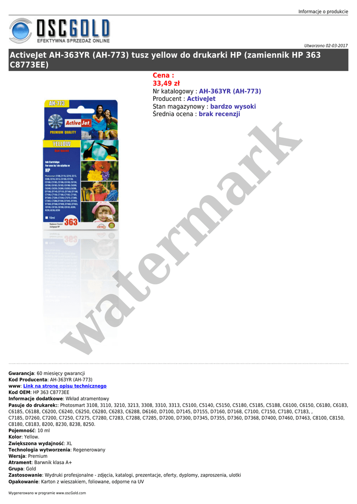 Informacje o produkcie Utworzono 02-03-2017 ActiveJet AH-363YR (AH-773) tusz yellow do drukarki HP (zamiennik HP 363 C8773EE) Cena : 33,49 zł w at er m ar k Nr katalogowy : AH-363YR (AH-773) Producent : ActiveJet Stan magazynowy : bardzo wysoki Średnia ocena : brak recenzji Gwarancja: 60 miesięcy gwarancji Kod Producenta: AH-363YR (AH-773) www: Link na stronę opisu technicznego Kod OEM: HP 363 C8773EE Informacje dodatkowe: Wkład atramentowy Pasuje do drukarek:: Photosmart 3108, 3110, 3210, 3213, 3308, 3310, 3313, C5100, C5140, C5150, C5180, C5185, C5188, C6100, C6150, C6180, C6183, C6185, C6188, C6200, C6240, C6250, C6280, C6283, C6288, D6160, D7100, D7145, D7155, D7160, D7168, C7100, C7150, C7180, C7183, , C7185, D7260, C7200, C7250, C7275, C7280, C7283, C7288, C7285, D7200, D7300, D7345, D7355, D7360, D7368, D7400, D7460, D7463, C8100, C8150, C8180, C8183, 8200, 8230, 8238, 8250. Pojemność: 10 ml Kolor: Yellow. Zwiększona wydajność: XL Technologia wytworzenia: Regenerowany Wersja: Premium Atrament: Barwnik klasa A+ Grupa: Gold Zastosowanie: Wydruki profesjonalne - zdjęcia, katalogi, prezentacje, oferty, dyplomy, zaproszenia, ulotki Opakowanie: Karton z wieszakiem, foliowane, odporne na UV Wygenerowano w programie www.oscGold.com er m ar k at w