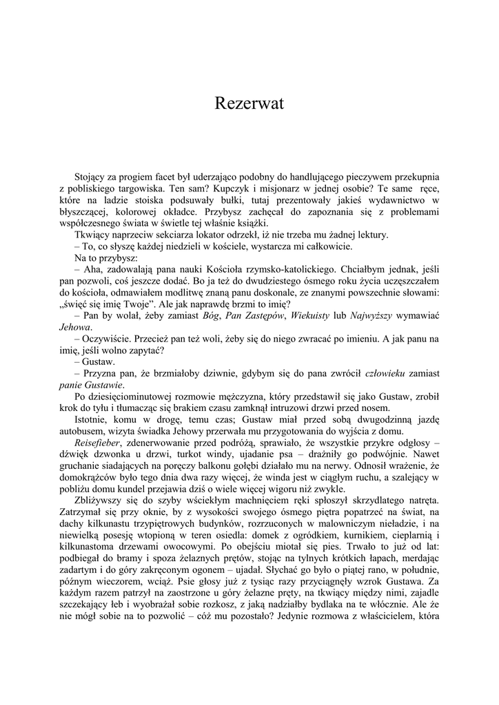 Rezerwat Stojący za progiem facet był uderzająco podobny do handlującego pieczywem przekupnia z pobliskiego targowiska. Ten sam? Kupczyk i misjonarz w jednej osobie? Te same ręce, które na ladzie stoiska podsuwały bułki, tutaj prezentowały jakieś wydawnictwo w błyszczącej, kolorowej okładce. Przybysz zachęcał do zapoznania się z problemami współczesnego świata w świetle tej właśnie książki. Tkwiący naprzeciw sekciarza lokator odrzekł, iż nie trzeba mu żadnej lektury. – To, co słyszę każdej niedzieli w kościele, wystarcza mi całkowicie. Na to przybysz: – Aha, zadowalają pana nauki Kościoła rzymsko-katolickiego. Chciałbym jednak, jeśli pan pozwoli, coś jeszcze dodać. Bo ja też do dwudziestego ósmego roku życia uczęszczałem do kościoła, odmawiałem modlitwę znaną panu doskonale, ze znanymi powszechnie słowami: „święć się imię Twoje”. Ale jak naprawdę brzmi to imię? – Pan by wolał, żeby zamiast Bóg, Pan Zastępów, Wiekuisty lub Najwyższy wymawiać Jehowa. – Oczywiście. Przecież pan też woli, żeby się do niego zwracać po imieniu. A jak panu na imię, jeśli wolno zapytać? – Gustaw. – Przyzna pan, że brzmiałoby dziwnie, gdybym się do pana zwrócił człowieku zamiast panie Gustawie. Po dziesięciominutowej rozmowie mężczyzna, który przedstawił się jako Gustaw, zrobił krok do tyłu i tłumacząc się brakiem czasu zamknął intruzowi drzwi przed nosem. Istotnie, komu w drogę, temu czas; Gustaw miał przed sobą dwugodzinną jazdę autobusem, wizyta świadka Jehowy przerwała mu przygotowania do wyjścia z domu. Reisefieber, zdenerwowanie przed podróżą, sprawiało, że wszystkie przykre odgłosy – dźwięk dzwonka u drzwi, turkot windy, ujadanie psa – drażniły go podwójnie. Nawet gruchanie siadających na poręczy balkonu gołębi działało mu na nerwy. Odnosił wrażenie, że domokrążców było tego dnia dwa razy więcej, że winda jest w ciągłym ruchu, a szalejący w pobliżu domu kundel przejawia dziś o wiele więcej wigoru niż zwykle. Zbliżywszy się do szyby wściekłym machnięciem ręki spłoszył skrzydlatego natręta. Zatrzymał się przy oknie, by z wysokości swojego ósmego piętra popatrzeć na świat, na dachy kilkunastu trzypiętrowych budynków, rozrzuconych w malowniczym nieładzie, i na niewielką posesję wtopioną w teren osiedla: domek z ogródkiem, kurnikiem, cieplarnią i kilkunastoma drzewami owocowymi. Po obejściu miotał się pies. Trwało to już od lat: podbiegał do bramy i spoza żelaznych prętów, stojąc na tylnych krótkich łapach, merdając zadartym i do góry zakręconym ogonem – ujadał. Słychać go było o piątej rano, w południe, późnym wieczorem, wciąż. Psie głosy już z tysiąc razy przyciągnęły wzrok Gustawa. Za każdym razem patrzył na zaostrzone u góry żelazne pręty, na tkwiący między nimi, zajadle szczekający łeb i wyobrażał sobie rozkosz, z jaką nadziałby bydlaka na te włócznie. Ale że nie mógł sobie na to pozwolić – cóż mu pozostało? Jedynie rozmowa z właścicielem, która oczywiście pomogła jak umarłemu kadzidło. Starszy jegomość dziwił się, że szczekanie wzbudza czyjąś irytację. Przecież to sielanka! Można się poczuć, jakby się mieszkało na wsi! Właścicielowi kawalerki nie wystarczyło uważne przekręcenie kluczem. Dla upewnienia się, że drzwi są solidnie zamknięte, trzeba było jeszcze parę razy poruszyć klamką. Winda zwiozła go na dół. Z torbą na ramieniu ruszył w stronę autobusowego przystanku pocieszając się: „Przynajmniej trzy, cztery dni z dala od tej bestii, dobre i to.” Patrząc przez okno autobusu wiozącego go w stronę Warszawy starał się omijać wzrokiem ohydne reklamy. Z umieszczonego nad głową głośniczka sączyło się muzyczne pitolenie i tu już pasażer był bezradny. Tego nie dało się „ominąć słuchem”. Niczym ćmienie zęba była ta podróż z Legionowa do Pruszkowa. Ze zmarszczonymi brwiami, znamionującymi paskudne samopoczucie, przeprawiał się z prawego na lewy brzeg Wisły, by po dwumiesięcznej rozłące wylądować w mieszkaniu kobiety, którą pomimo rozwodu wciąż nazywał swoją żoną. Zastał ją robiącą porządek w swoich szufladach. Zwykłym tonem, jakby widzieli się nie dalej niż wczoraj: – Przeczytaj, ojciec – powiedziała podając mu arkusz papieru. – To powinno cię zainteresować. Było to pismo do prezydenta miasta, kopia rękopisu wysłanego przed dwoma miesiącami i opatrzonego nader szczegółową datą: „4.04.95 r., godz. 2,20 w nocy”. Gustawowi patrzącemu na pochyłe liternictwo żony wydało się, że słyszy jej głos: „Zwracam się z uprzejmą prośbą o użycie radykalnych środków w celu zapewnienia nam, mieszkańcom ul. B. Prusa, nocnego spokoju. Usilnie proszę o powierzenie tej sprawy odpowiednim służbom naszego miasta. Przy ul. B. Prusa, na odcinku między Ceramiczną a Wyspiańskiego znajdują się cztery obiekty przemysłowe i usługowe: Zakład Ceramiki, targowisko Manhattan, płatny parking i Przedsiębiorstwo Robót Wiertniczych. W każdym z tych obiektów jest zatrudniony dozorca nocny, każdy z nich ma specjalne pomieszczenie przy bramie. Niestety praca tych osób polega wyłącznie na przebywaniu w pomieszczeniach. Jest to najwyraźniej praca urzędnicza, podczas gdy pracę fizyczną wykonują psy wilczury, które regularnie w środku nocy są wypuszczane do skontrolowania obiektów. Rozpoczyna się wtedy przeraźliwe szczekanie na różne tony; trwające godzinę, czasem dwie. Mieszkam po drugiej stronie ulicy i wielokrotnie w takich sytuacjach, zbudzona ze snu, obserwuję, co się dzieje. Nie dzieje się nic; nikt nie kręci się przy targowisku, żaden spóźniony samochód nie wjeżdża na parking. Panowie dozorcy także nie pojawiają się w polu widzenia, które – gdy się mieszka, tak jak ja, na czwartym piętrze – jest rozległe. Na tych dobrze oświet