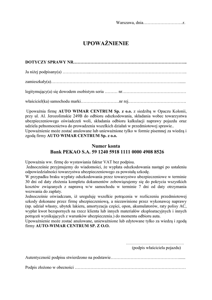 Warszawa, dnia……………………….r. UPOWAŻNIENIE DOTYCZY SPRAWY NR…………………………………………………………………….. Ja niżej podpisany(a) ………………..………………………………………………………….. zamieszkały(a)………………………………………………………………………………...... legitymujący(a) się dowodem osobistym seria ……… nr……………………………………… właściciel(ka) samochodu marki………………………nr rej.…………………………………. Upoważnia firmę AUTO WIMAR CENTRUM Sp. z o.o. z siedzibą w Opaczu Kolonii, przy ul. Al. Jerozolimskie 249B do odbioru odszkodowania, składania wobec towarzystwa ubezpieczeniowego oświadczeń woli, składania odbioru kalkulacji naprawy pojazdu oraz udziela pełnomocnictwa do prowadzenia wszelkich działań w przedmiotowej sprawie.. Upoważnienie może zostać anulowane lub unieważnione tylko w formie pisemnej za wiedzą i zgodą firmy AUTO WIMAR CENTRUM Sp. z o.o. Numer konta Bank PEKAO S.A. 59 1240 5918 1111 0000 4908 8526 Upoważnia ww. firmę do wystawiania faktur VAT bez podpisu. Jednocześnie przyjmujemy do wiadomości, że wypłata odszkodowania nastąpi po ustaleniu odpowiedzialności towarzystwa ubezpieczeniowego za powstałą szkodę. W przypadku braku wypłaty odszkodowania przez towarzystwo ubezpieczeniowe w terminie 30 dni od daty złożenia kompletu dokumentów zobowiązujemy się do pokrycia wszystkich kosztów związanych z naprawą w/w samochodu w terminie 7 dni od daty otrzymania wezwania do zapłaty. Jednocześnie oświadczam, iż ureguluję wszelkie potrącenia w rozliczeniu przedmiotowej szkody dokonane przez firmę ubezpieczeniową, a niezawinione przez wykonawcę naprawy (np. udział własny, ubytek lakieru, amortyzacja części, opon, akumulatorów, raty polisy AC, wypłat kwot bezspornych na rzecz klienta lub innych materiałów eksploatacyjnych i innych potrąceń wynikających z warunków ubezpieczenia.) do momentu odbioru auta. Upoważnienie może zostać anulowane, unieważnione lub edytowane tylko za wiedzą i zgodą firmy AUTO-WIMAR CENTRUM SP. Z O.O. …………………………………………. (podpis właściciela pojazdu) Autentyczność podpisu stwierdzono na podstawie…………………………………………...... Podpis złożono w obecności ……………………………………………………………………