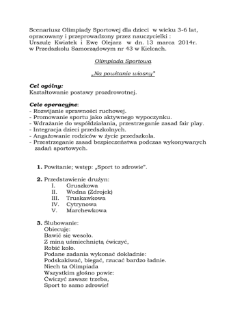 Scenariusz Olimpiady Sportowej dla dzieci w wieku 3-6 lat, opracowany i przeprowadzony przez nauczycielki : Urszulę Kwiatek i Ewę Olejarz w dn. 13 marca 2014r. w Przedszkolu Samorządowym nr 43 w Kielcach. Olimpiada Sportowa „Na powitanie wiosny” Cel ogólny: Kształtowanie postawy prozdrowotnej. Cele operacyjne: - Rozwijanie sprawności ruchowej. - Promowanie sportu jako aktywnego wypoczynku. - Wdrażanie do współdziałania, przestrzeganie zasad fair play. - Integracja dzieci przedszkolnych. - Angażowanie rodziców w życie przedszkola. - Przestrzeganie zasad bezpieczeństwa podczas wykonywanych zadań sportowych. 1. Powitanie; wstęp: „Sport to zdrowie”. 2. Przedstawienie drużyn: I. Gruszkowa II. Wodna (Zdrojek) III. Truskawkowa IV. Cytrynowa V. Marchewkowa 3. Ślubowanie: Obiecuję: Bawić się wesoło. Z miną uśmiechniętą ćwiczyć, Robić koło. Podane zadania wykonać dokładnie: Podskakiwać, biegać, rzucać bardzo ładnie. Niech ta Olimpiada Wszystkim głośno powie: Ćwiczyć zawsze trzeba, Sport to samo zdrowie! 4. Zabawa naśladowcza przy piosence: „Stajemy wszyscy w kole”. 5. Przemarsz kolorowych drużyn przy dźwiękach „Marsza Rodeckiego”. 6. Konkurencje: (marchewka) „Zajęcze skoki” skoki obunóż przez obręcze do celu. Pomoce: obręcze, piłka. Zadanie dodatkowe: w kole rzuty piłką i chwyt oburącz. (woda) „Uciekaj zimo – śnieżynki” rzut kulkami z gazet do celu. Pomoce: kulki z gazet, kosz. Zadanie dodatkowe: wykonaj zadania wg poleceń nauczycielki (np.: skoki, przysiady itp.) (cytryna) „Kto silniejszy” – przeciąganie liny. Pomoce: lina. Zadanie dodat5kowe: zabawa ruchowa ze śpiewem do wyboru. (gruszka) „Zdrowy, zielony posiłek” – slalom. Bieg między pachołkami do celu, powrót. Pomoce: pachołki, woreczek. Zadanie dodatkowe: podawanie zielonego woreczka w kole. (truskawka) „Omijaj wiosenne kałuże” – przejście po krążkach do celu. Pomoce: krążki, chusta animacyjna. Zadanie dodatkowe: zabawa z chustą animacyjną np.: „Kolory”. 7. Wiosenna rzeźba na pożegnanie zimy. Formowanie dowolnych „rzeźb” z gazet. 8. Podziękowanie i pożegnanie uczestników Olimpiady. Rozdanie wiosennych medali. Olimpiada Sportowa „Na powitanie wiosny” odbyła się dn. 13.03.2014r. w Przedszkolu Samorządowym nr 43 w Kielcach. Opracowaniem scenariusza oraz przeprowadzeniem Olimpiady zajęły się nauczycielki : Urszula Kwiatek i Ewa Olejarz . W imprezie uczestniczyły dzieci, pracownicy przedszkola i rodzice. Całość odbywała się na świeżym powietrzu – w ogrodzie przedszkolnym. Po powitaniu zebranych przez dyrekcję placówki oraz nauczycielki prowadzące, dzieci zostały podzielone na pięć witaminkowych drużyn. Każdej drużynie przyporządkowany został inny kolor szarfy, a w ogrodzie umieszczono odpowiednio do nazw drużyn stanowiska sportowe : truskawkowe, gruszkowe, cytrynowe, marchewkowe i wodne. Mali sportowcy złożyli obietnicę wesołej zabawy - zgodnej z zasadami fair play, a następnie przeszli korowodem dookoła placu. Następnie dzieci przemieszczając się po poszczególnych stacjach wykonywały zadania ruchowe - odpowiednio do instrukcji. Na zakończenie imprezy wszyscy wspólnie wykonywali „rzeźby” z gazet – na pożegnanie zimy , a dzieci otrzymały pamiątkowe wiosenne medale. Wspólna zabawa połączona ze zdrową rywalizacją sprzyjała kształtowaniu postawy prozdrowotnej i promowaniu sportu jako aktywnego wypoczynku. Dodatkowym walorem było zaangażowanie się rodziców we wspólną zabawę.