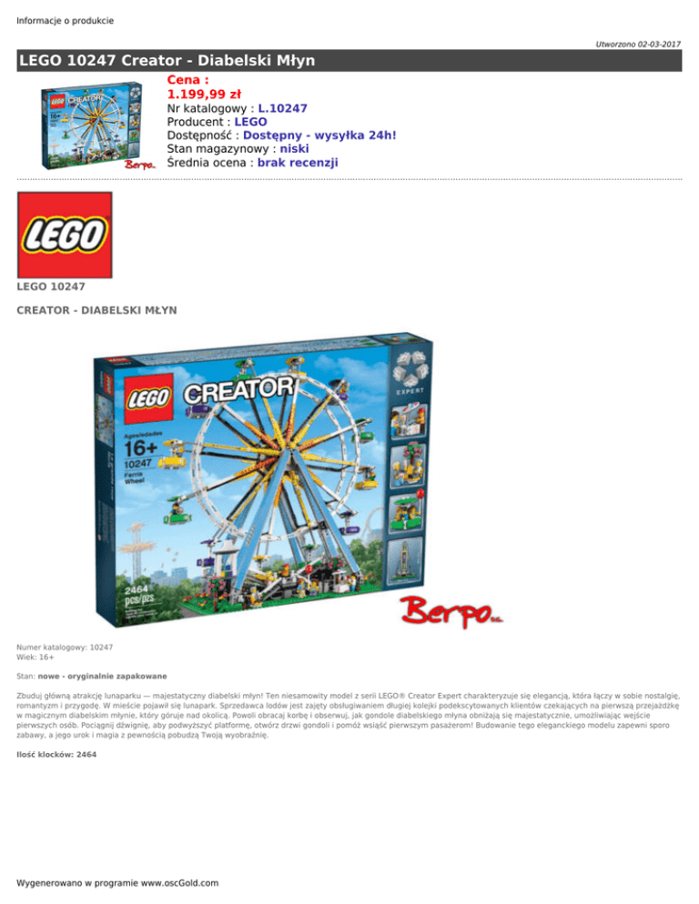 Informacje o produkcie Utworzono 02-03-2017 LEGO 10247 Creator - Diabelski Młyn Cena : 1.199,99 zł Nr katalogowy : L.10247 Producent : LEGO Dostępność : Dostępny - wysyłka 24h! Stan magazynowy : niski Średnia ocena : brak recenzji LEGO 10247 CREATOR - DIABELSKI MŁYN Numer katalogowy: 10247 Wiek: 16+ Stan: nowe - oryginalnie zapakowane Zbuduj główną atrakcję lunaparku — majestatyczny diabelski młyn! Ten niesamowity model z serii LEGO® Creator Expert charakteryzuje się elegancją, która łączy w sobie nostalgię, romantyzm i przygodę. W mieście pojawił się lunapark. Sprzedawca lodów jest zajęty obsługiwaniem długiej kolejki podekscytowanych klientów czekających na pierwszą przejażdżkę w magicznym diabelskim młynie, który góruje nad okolicą. Powoli obracaj korbę i obserwuj, jak gondole diabelskiego młyna obniżają się majestatycznie, umożliwiając wejście pierwszych osób. Pociągnij dźwignię, aby podwyższyć platformę, otwórz drzwi gondoli i pomóż wsiąść pierwszym pasażerom! Budowanie tego eleganckiego modelu zapewni sporo zabawy, a jego urok i magia z pewnością pobudzą Twoją wyobraźnię. Ilość klocków: 2464 Wygenerowano w programie www.oscGold.com Inne akcesoria. Informacje o produkcie Wygenerowano w programie www.oscGold.com Informacje o produkcie Dostępność w salonach: Ilość: Sklep - Złotniki: 1 Sklep - zlikwidowany: 0 Sklep - Szczepankowo: 0 Wygenerowano w programie www.oscGold.com