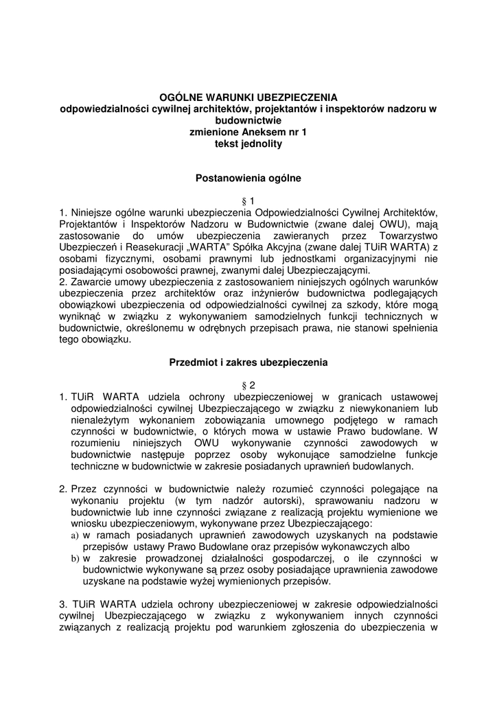 OGÓLNE WARUNKI UBEZPIECZENIA odpowiedzialności cywilnej architektów, projektantów i inspektorów nadzoru w budownictwie zmienione Aneksem nr 1 tekst jednolity Postanowienia ogólne §1 1. Niniejsze ogólne warunki ubezpieczenia Odpowiedzialności Cywilnej Architektów, Projektantów i Inspektorów Nadzoru w Budownictwie (zwane dalej OWU), mają zastosowanie do umów ubezpieczenia zawieranych przez Towarzystwo Ubezpieczeń i Reasekuracji „WARTA” Spółka Akcyjna (zwane dalej TUiR WARTA) z osobami fizycznymi, osobami prawnymi lub jednostkami organizacyjnymi nie posiadającymi osobowości prawnej, zwanymi dalej Ubezpieczającymi. 2. Zawarcie umowy ubezpieczenia z zastosowaniem niniejszych ogólnych warunków ubezpieczenia przez architektów oraz inŜynierów budownictwa podlegających obowiązkowi ubezpieczenia od odpowiedzialności cywilnej za szkody, które mogą wyniknąć w związku z wykonywaniem samodzielnych funkcji technicznych w budownictwie, określonemu w odrębnych przepisach prawa, nie stanowi spełnienia tego obowiązku. Przedmiot i zakres ubezpieczenia §2 1. TUiR WARTA udziela ochrony ubezpieczeniowej w granicach ustawowej odpowiedzialności cywilnej Ubezpieczającego w związku z niewykonaniem lub nienaleŜytym wykonaniem zobowiązania umownego podjętego w ramach czynności w budownictwie, o których mowa w ustawie Prawo budowlane. W rozumieniu niniejszych OWU wykonywanie czynności zawodowych w budownictwie następuje poprzez osoby wykonujące samodzielne funkcje techniczne w budownictwie w zakresie posiadanych uprawnień budowlanych. 2. Przez czynności w budownictwie naleŜy rozumieć czynności polegające na wykonaniu projektu (w tym nadzór autorski), sprawowaniu nadzoru w budownictwie lub inne czynności związane z realizacją projektu wymienione we wniosku ubezpieczeniowym, wykonywane przez Ubezpieczającego: a) w ramach posiadanych uprawnień zawodowych uzyskanych na podstawie przepisów ustawy Prawo Budowlane oraz przepisów wykonawczych albo b) w zakresie prowadzonej działalności gospodarczej, o ile czynności w budownictwie wykonywane są przez osoby posiadające uprawnienia zawodowe uzyskane na podstawie wyŜej wymienionych przepisów. 3. TUiR WARTA udziela ochrony ubezpieczeniowej w zakresie odpowiedzialności cywilnej Ubezpieczającego w związku z wykonywaniem innych czynności związanych z realizacją projektu pod warunkiem zgłoszenia do ubezpieczenia w TUiR WARTA odpowiedzialności cywilnej Ubezpieczającego w związku z wykonaniem projektu lub sprawowaniem nadzoru w budownictwie. 4. Ochroną ubezpieczeniową objęta jest odpowiedzialność cywilna Ubezpieczającego w związku z wykonywaniem czynności w budownictwie w wypadku, gdy szkoda została wyrządzona poszkodowanemu, pod warunkiem Ŝe zdarzenie powodujące szkodę powstało w okresie ubezpieczenia. 1) Przez zdarzenie powodujące szkodę rozumie się działanie lub zaniechanie Ubezpieczającego przy wykonywaniu czynności w budownictwie, w którego następstwie została wyrządzona szkoda uprawniająca poszkodowanego do dochodzenia roszczenia z tytułu odpowiedzialności cywilnej Ubezpieczającego. 2) Za moment powstania zdarzenia powodującego szkodę rozumie się: a) w przypadku prac projektowych – datę przekazania projektu lub jego poprawek, w zakresie w jakim mają wpływ na powstanie szkody, b) b) w przypadku nadzoru - datę wpisu do księgi budowy. Wyłączenia odpowiedzialności §3 1. TUiR WARTA nie odpowiada za szkody wyrządzone: 1) umyślnie przez Ubezpieczającego lub osoby, o których mowa w pkt 3 poniŜej, 2) osobom bliskim Ubezpieczającemu; za osoby bliskie uwaŜa się: małŜonka, konkubenta, konkubinę, dzieci, rodziców, rodzeństwo, dziadków, wnuków, teściów, zięciów, synowe, ojczyma, macochę, pasierbów, przysposabiających, przysposobionych, opiekunów w charakterze rodziców, osoby przyjęte na wychowanie, 3) pracownikom własnym Ubezpieczającego powstałe w związku ze świadczeniem pracy, robót lub usług na rachunek Ubezpieczającego; za pracownika własnego Ubezpieczającego uwaŜa się osobę fizyczną zatrudnioną na podstawie umowy o pracę lub wykonującą roboty lub usługi na rachunek Ubezpieczającego na podstawie umowy prawa cywilnego, 4) osobom będącym wspólnikami lub osobom wykonującym czynności w budownictwie w imieniu lub na rachunek Ubezpieczającego, 5) przez osoby fizyczne, osoby prawne lub jednostki organizacyjnych nie posiadające osobowości prawnej wykonujące czynności w budownictwie w imieniu lub na rachunek Ubezpieczającego, 6) przez Ubezpieczającego lub jego pracownika, jeŜeli nie posiadał on uprawnień do wykonywania zawodu, miał zakaz lub zawieszone prawo do ich wykonywania, 7) w środowisku naturalnym wskutek zanieczyszczenia lub skaŜenia gruntu, wody, powietrza oraz w drzewostanie lasów i parków, 8) spółkom, w których Ubezpieczający posiada większościowe udziały, lub większość akcji, 9) poza granicami Rzeczypospolitej Polskiej, 10) z powodu siły wyŜszej, m.in. stanu wyjątkowego, wojny, rewolucji, rewolty, zamieszek, niepokojów społecznych, stanu klęski Ŝywiołowej, 2. TUiR WARTA nie odpowiada za szkody powstałe w wyniku: 1) świadomego naruszenia przez Ubezpieczającego lub osoby, za które ponosi on odpowiedzialność obowiązujących norm oraz przepisów prawnych, jak równieŜ działania wykraczającego poza ich kompetencje 2) przekroczenia terminu zakończenia budowy oraz innych terminów z tym związanych, 3) przekroczenia ustalonych kosztów, 4) nałoŜenia kar umownych, 5) zaginięcia, zniszczenia, uszkodzenia, utraty lub kradzieŜy dokumentów stanowiących własność lub powierzonych Ubezpieczającemu, 6) posiadania, uŜywania lub prowadzenia przez Ubezpieczającego lub w jego imieniu pojazdów mechanicznych podlegających obowiązkowemu ubezpieczeniu odpowiedzialności cywilnej, statków powietrznych, statków i urządzeń pływających oraz maszyn samobieŜnych, 7) normalnego z