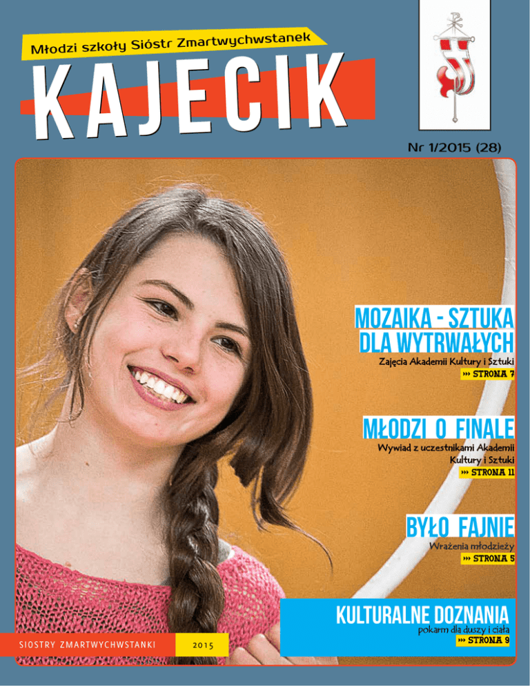 wychwstanek rt a m Z tr s ió S ły o Młodzi szk k i c e j Ka Nr 1/2015 (28) Mozaika - sztuka dla wytrwałych Zajęcia Akademii Kultury i Sztuki >>> strona 7 Młodzi o finale Wywiad z uczestnikami Akademii Kultury i Sztuki >>> Strona 11 Było Fajnie Wrażenia młodzieży >>> Strona 5 Kulturalne doznania SIO STRY ZMA RT W YC H W S TA N K I 2015 pokarm dla duszy i ciała >>> Strona 9 szk olna fotka humor Autentyczne sprawdziany z historii i Wosu Podaj nazwisko niemieckiego pisarza oraz jedno dzieło wybrane: „Cierpienia młodego Wertera” Wolf Gang 03 04 05 07 Trochę więcej radości Kajecik w Telewizji Było Fajnie - Wiktoria WIlińska Mozaika - Sztuka dla Wytrwałych - Milena Langner 08 09 Ciekawostka Kulturalne doznania - Maria Krys ztofiak 11 Młodzi o Finale Wiktoria WIlińska 13 Gra - Bianka Kajdanowicz, Wojciech Kubiak 16 18 20 Listy Kronika wydarzeń Tester inteligencji Numer powstał w ramach programu edukacyjnego AKADEMIA KULTURY I SZTUKI współfinansowanego przez: Sp is T r eś ci Co to jest „Stopa bezrobocia” - Są to osoby których wiek i płeć nie wskazują na zdolność do pracy a w o ł S a j P oez Wa l ka ć, wa j m a r z y a t s e z r p N ie j oczu N ie z a m y k a a m i. j przed sn a k ie c u ie In b ó l. rzynoszą p i ią m a ł k Może ie n ia m o j e g o im z c y z r k N ie To b ie, Będę przy ę s z n a wa l k Lecz wyru ękami Ze swymi l czki d r o g i u c ie j a k u z s ie N wa g ę, Zn a j d ź o d ę i w y g r a j. Zn a j d ź s ił a Wiktoria Wilińsk Redakcja: Milena Langner, Maria Krysztofiak, Wiktoria Wilińska, Bianka Kajdanowicz, Karol Kilmanek, Piotr Michalski, Ivo Sadowski, Mikołaj Konieczny, Liliana Saadi, Wojciech Kubiak, Zdjęcia: Małgorzata Olek, Wiktoria Wilińska, Piotr Michalski ka j e cik R e d akc j a j e c ę i w ę h c o Tr i c ś o rad a n in ą r ó ż z s ie m ł y ok b p r z yh c y U b ie g ł y r n d e j a rzeń – dl . nych zda smutnych h ic g u r d dla jemnych, , s i o c e n ić u m m a s y Każd e powtóc h c ie n ędów j a k ic h b ł m roku. y n p ę t s a rzyć w n N y Rok a b y te n N o w , m o ik ln te zy ił o śc ią y m D ro g im C sz e ju tr o , m p le Ż y c zy m y n a sz a n ją e a d zi , u m ie e p e łn io n y n p rz e b a c za n ia ą c o 2 0 1 5 b y ł p rz m ł, ió c y ja st k im b li sk ic h , p rz p rz e d e w sz y le a , d o n a sz y c h za tr ę n o w ie p o zo ia n y sw o je g ę ży c ie m i n si ć ję tn o śc ią zm y sz ie c li o , k tó ra p o zw kó ł n a s. w ra żl iw o śc ią m y lu d zi w o le b ro p a n tn y m st a w a ć o b o ję ń nowos p o st a n o w ie za c to k o R owy fl e k sj i. ia lu d zi d o re n ła sk , h c y ro c zn ę m ó zg ó w zr o b ił a b u rz ja c k a d re a ró w . N a sz , co re d a k to w ó sł y m o p ai… b y ło ty le la zł y si ę p o st a zn h c a st k W n a sz y c h te , ja k d o b re zi e j o so b is te rd a b ia n ie now ie re la c ji z , p o p ra w ie n la e ra Iz o d p io ie w y ja zd u c h , n a p is a n ie a n a rg o p rz y g o to w a n a n uki gry ie o n a le n ie n a d o p ra co w a n zy c j e jn y c b a b c ią , d o sk k p y re ko le ie ję tn o śc i a d ze n ie g ru o g a c e n ie u m se n k i, p ro w zb w , h c a lk ej ja zd y n a ro w n ie ż b a rd zi ró le A . zy d o p e rf e k c ji iz p y sz n e j ei zr o b ie n ie p d zi o m w p o d lu y c o m k u c h a rs k ic h o p si e n ia n ie o c e n , , ja k c h ę ć n ie u n iw e rs a ln e tu , p o p ra w ie a ri ta n lo o w w ra m a c h c ja c za su . sz ły m w ie lu sz a o rg a n iz a p le i ie n ia w zd ro w e o d ży u le p sz y o d 5 b ył p o p ro st 1 0 2 k ro y b K a żd y ci a ło b y, że iz m u , w ia ry. m ty p o W ie lu lu d zi ch i, śc o j ra d . Tr o ch ę w ię ce je st ta ka , że p o p rz e d n ie g o , a le p ra w d a il w ch h yc iw , cz yn i yc h sz cz ę śl a s w zm a cn ia n To . u o cz e ku je sa m tk u o ch ę sm i w ia ry ze b u je te ż tr y te ż p o ko ry cz U i. m cz ło w ie k p o tr cy ją e w id u o d n a s. i, b a rd zi e j p rz le ży n ie ty lko za e ci m ą d rz e js zy m ży e sz w to , że n a 3 ka j e cik I n f ormac j e i j z i w e l e t w k i c e Kaj ć? Jak ją ę i m a p a n i m ó w i ą? I l e m a k i j a ż u m a ń c ś o m o d a i erzy w rognozy pogody tóre z wielu pyta m. t n e z e r p y z C ie p n a o niek uwają się ludzio r k g l a y t n o a T d ą ? l e g z y w nnikar lewizji, które nas powiedź. e i z d e i b o s na acy te zyskać na nie od r p h c y c si e b ie ą z c u tr ze ć p rz e d ę a doty j p z ą g a o m k u o y i te m o k a zj ę p te ra . D zi ę k m . M ie li śm y ze My mieliśm id w te k st z p ro m z y w w zr o ko st y te k ć ko n ta k t rz y k ła d o w e p ć ta i u tr zy m y w a zy c i te ró w c ie ż k a ż r o lę p re ze n e , c h o ć p rz e n d u w c zu ć si ę w tr ę si za ło b le m a Z a d a n ie o k a e c zy ta ć . P ro rz b o d w ia d o m o śc i. fi a tr że p o mpo, w y d a je si ę , p o w ie d n ie te d o i, d e m u z n a s g a w u n ie ło si ę sk u p ie ty c zn e o k a za e m y. a n o w a n ie tr p o i ja c a n in to e zi e sa la w k o lo rz ża u d ła y b n ia js ce m zw ie d za ia p ro g n o zy K o le jn y m m ie d o n a g ry w a n a n o ży u sł zu ją ło si ę , że m ie js cu i p o ka m y n lo n y m . O ka za o cz a n w yz . Gdy d y n k i st a ją w ie z b o ku sa li n ra k e p o g o d y. P o g o a n ą n tl o m p u te m a ją w yś w ie p ro g ra m ó w ko cą o p o g o d ę , kt ó rą m o p z n y, ła d a m a p y a n ie ju ż n a g ra m e n ty i p o d k le e m a te ri a ł zo st e n lo e zi ie k i n ig d y a si ę w sz ys tk ego pogodyn cz la ro w yc h w yc in d ć, le yś m j p rz e a si ę w ię c d o sa lę , w k tó re y śm p o g o d y. M o żn li y cz a b o .Z o ie sz cz e n ie si ę n a zi e lo n m i o ra z p o m ść o n ie u b ie ra ją g i m y żn z ró są ro zm o w y p ro w a d za n e ia śc ie d o n a g ry w a n yc h . że k d źw ię ko w i tk ze a g j e ko ln re