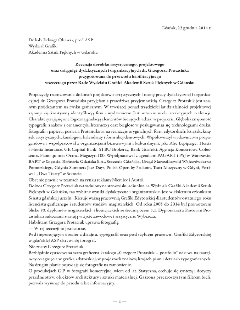 Gdańsk, 23 grudnia 2014 r. Dr hab. Jadwiga Okrassa, prof. ASP Wydział Grafiki Akademia Sztuk Pięknych w Gdańsku Recenzja dorobku artystycznego, projektowego oraz osiągnięć dydaktycznych i organizacyjnych dr. Grzegorza Protasiuka przygotowana do przewodu habilitacyjnego wszczętego przez Radę Wydziału Grafiki, Akademii Sztuk Pięknych w Gdańsku Propozycję recenzowania dokonań projektowo-artystycznych i ocenę pracy dydaktycznej i organizacyjnej dr. Grzegorza Protasiuka przyjęłam z prawdziwą przyjemnością. Grzegorz Protasiuk jest znanym projektantem na rynku graficznym. W trwającej ponad trzydzieści lat działalności projektowej zajmuje się kreatywną identyfikacją firm i wydawnictw. Jest autorem wielu atrakcyjnych realizacji. Charakteryzują się one logiczną gradacją elementów biorących udział w projekcie. Głęboka znajomość typografii, znaków i ornamentyki literniczej oraz biegłość w posługiwaniu się technologiami druku, fotografii i papieru, pozwala Protasiukowi na realizację oryginalnych form edytorskich: książek, książek artystycznych, katalogów, kalendarzy i form akcydensowych. Współtworzył wydawnictwa propagandowe i współpracował z organizacjami biznesowymi i kulturalnymi, jak: Alte Lepipziger Hestia i Hestia Insurance, GE Capital Bank, STBU Brokerzy, Bank Gdański, Agencja Koncertowa Colosseum, Piano quintet Orana, Magazyn 100. Współpracował z agendami PAGART i PSJ w Warszawie, BART w Sopocie, Rafineria Gdańska S.A., Stocznia Gdańska, Urząd Marszałkowski Wojewówdztwa Pomorskiego, Gdynia Summers Jazz Days, Polish Open by Prokom, Teatr Muzyczny w Gdyni, Festiwal „Dwa Teatry” w Sopocie. Obecnie pracuje w teamach na rynku reklamy Niemiec i Austrii. Doktor Grzegorz Protasiuk zatrudniony na stanowisku adiunkta na Wydziale Grafiki Akademii Sztuk Pięknych w Gdańsku, ma wybitne wyniki dydaktyczne i organizatorskie. Jest wieloletnim członkiem Senatu gdańskiej uczelni. Kieruje ważną pracownią Grafiki Edytorskiej dla studentów ostatniego roku licencjatu graficznego i studentów studiów magisterskich. Od roku 2008 do 2014 był promotorem blisko 80. dyplomów magisterskich i licencjackich ze średnią ocen: 5,1. Dyplomanci z Pracowni Protasiuka z sukcesami startują w życie zawodowe i artystyczne Wybrzeża. Habilitant Grzegorz Protaciuk uprawia fotografię. — W rej recenzji to jest istotne. Pod imponującym dossier z dizajnu, typografii oraz pod szyldem pracowni Grafiki Edytorskiej w gdańskiej ASP ukrywa się fotograf. Nie znany Grzegorz Protasiuk. Bezbłędnie opracowana szata graficzna katalogu „Grzegorz Protasiuk – portfolio” odsuwa na marginesy osiągnięcia w grafice edytorskiej, w projektach znaków, krojach pism i detalach typograficznych. Na drugim planie pojawiają się fotografie na zamówienie. O produkcjach G.P. w fotografii komercyjnej wiem od lat. Statyczna, cechuje się syntezą i dotyczy przedmiotów, obiektów architektury i sztuki materialnej. Gaszona przezroczystym filtrem bieli, pozwala wysunąć do przodu tekst informacyjny. —1— Pamiętam, że Grzegorz zawsze rysował poprzez szkiełka. Tak przeleciał przez szkołę. Student-okularnik dużo opowiadał i miał zawsze przy sobie jakąś lajkę, zorkę. Pędzle (płaskie) zostawiał do malowania ulubionych liter. Można było się spodziewać – w przerwach roboty nad projektami, otoczony sprzętem fotograficznym i rekwizytami – Protasiuk dokumentuje ciemne, ponure z a ś c i a n k i , ustawia je w pierwszym planie i z absurdalnym humorem zadaje pytania na które… nie ma odpowiedzi. Rysuje kamerą pospolite owoce, warzywa (wiem, że Grzegorz lubi „włoszczyznę”, jakkolwiek to brzmi). Serię tych peryferyjnych zdjęć nazywa „Prowincją” i przenosi nas „tam, gdzie diabeł mówi dobranoc”. Grzegorz Protasiuk zapisuje zamrożone sytuacje. Rejestruje obiektywem realne centra, jednak nie tyle obiektywem je analizuje. Ekranizowane zjawiska wyjaśnia adnotacją nadając obrazowi konceptualnego akcentu. Trochę jak wywód matematyczny ilustrowany geometrią. W kilku fotografiach zdarza się, że autor znajduje punkt odniesienia, w e j ś c i e do mentalnej przestrzeni: — Co tak n a p r a w d ę widzą moje oczy? W tych fotografiach obraz wybornie broni się sam. Słowna wskazówka dekoncentruje uwagę, zawęża wizję i jest bezceremonialnie niepotrzebna. Tytuł kieruje wyobraźnią widza. Fotografie te wśród innych, które zapamiętałam to: „Tylda”, „W listach”, „Odnajdź mnie”, „Kaligrafia II”, „Dzień” i np. lewitujące w rejony Łodzi Kaliskiej dwie, pokazane w albumie, młode marzycielki. Przedstawię doraźną hipotezę opisującą działanie Grzegorza: Koncepcja projektu jest wielopłaszczyznowa: minimalizm odrzucający cechy portretowanych rekwizytów i klatki filmowe z rustykalnym teatrem będące synonimem pytań. W i z u a l n y m synonimem pytań. Sesje fotograficzne są długie, eksperymenty nie zbliżają się do celu. Jest nie dobrze. Nasuwa się podstawowe pytanie: — Czy to jest w s z y s t k o, czy n i c? I pytanie: — Co tak n a p r a w d ę jest na tej filmowej rolce? Rozumiem, że jestem zwolniona z odpowiedzi na te hipotetyczne pytania. Za to – opowiem o walorach rozprawy habilitacyjnej, estetyce, nastroju i moich skojarzeniach podczas analizy zdjęć Grzegorza. Protasiuk ryzykuje, naraża się Wysokiej Komisji Habilitacyjnej. Te zdjęcia nie funkcjonują na rynku sztuki. Z dokumentacji, którą otrzymałam wynika, że są to ograniczone działania, wcześniej niedostępne, nie wystawiane i przez nikogo nie recenzowane. — Dlaczego powstały? Myślę, że było tak (hipoteza!). W kolorowych katalogach handlowych mebli jest dużo pustych krzeseł ale nikt, oczywiście, nie dopatruje się w tych pustych krzesłach metafizyki. Odreagowaniem dizajnera na zlecenia i kaprysy klientów jest praca „do szuflady”. Znając aż nadto nużące kanony reklamy przekracza on natychmiast obowiąz