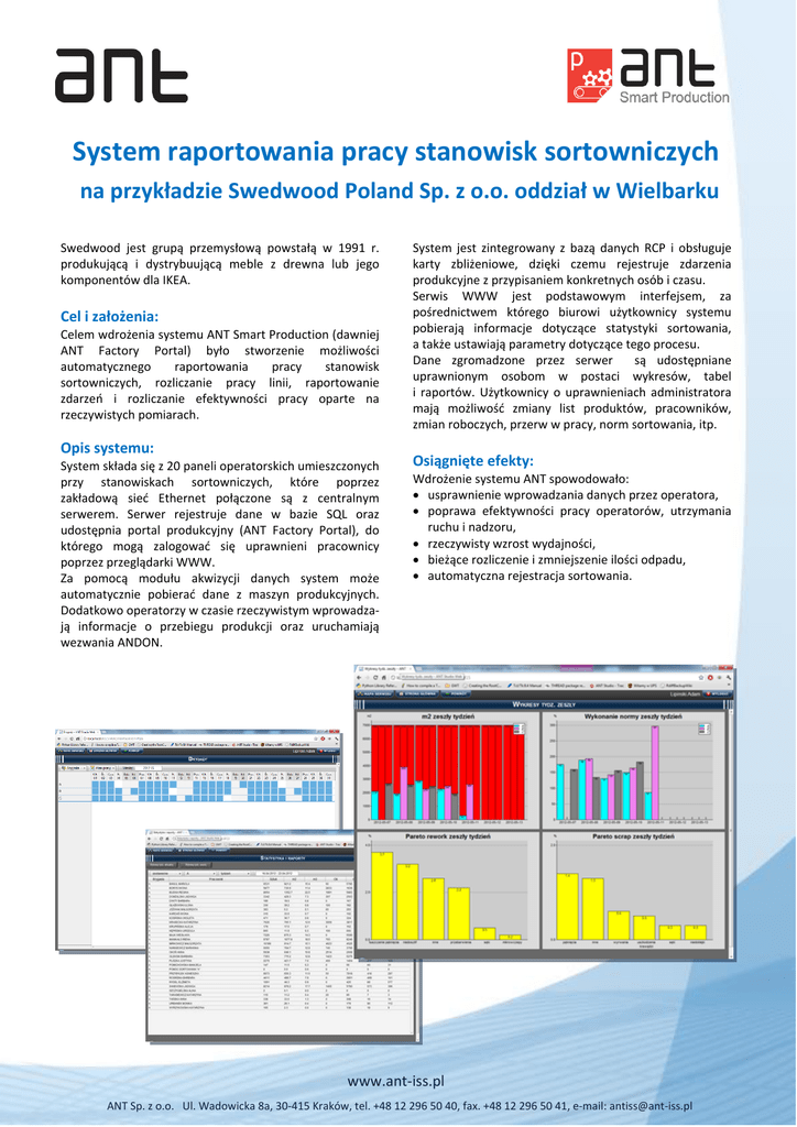 case study System raportowania pracy stanowisk sortowniczych na przykładzie Swedwood Poland Sp. z o.o. oddział w Wielbarku Swedwood jest grupą przemysłową powstałą w 1991 r. produkującą i dystrybuującą meble z drewna lub jego komponentów dla IKEA. Cel i założenia: Celem wdrożenia systemu ANT Smart Production (dawniej ANT Factory Portal) było stworzenie możliwości automatycznego raportowania pracy stanowisk sortowniczych, rozliczanie pracy linii, raportowanie zdarzeń i rozliczanie efektywności pracy oparte na rzeczywistych pomiarach. Opis systemu: System składa się z 20 paneli operatorskich umieszczonych przy stanowiskach sortowniczych, które poprzez zakładową sieć Ethernet połączone są z centralnym serwerem. Serwer rejestruje dane w bazie SQL oraz udostępnia portal produkcyjny (ANT Factory Portal), do którego mogą zalogować się uprawnieni pracownicy poprzez przeglądarki WWW. Za pomocą modułu akwizycji danych system może automatycznie pobierać dane z maszyn produkcyjnych. Dodatkowo operatorzy w czasie rzeczywistym wprowadzają informacje o przebiegu produkcji oraz uruchamiają wezwania ANDON. System jest zintegrowany z bazą danych RCP i obsługuje karty zbliżeniowe, dzięki czemu rejestruje zdarzenia produkcyjne z przypisaniem konkretnych osób i czasu. Serwis WWW jest podstawowym interfejsem, za pośrednictwem którego biurowi użytkownicy systemu pobierają informacje dotyczące statystyki sortowania, a także ustawiają parametry dotyczące tego procesu. Dane zgromadzone przez serwer są udostępniane uprawnionym osobom w postaci wykresów, tabel i raportów. Użytkownicy o uprawnieniach administratora mają możliwość zmiany list produktów, pracowników, zmian roboczych, przerw w pracy, norm sortowania, itp. Osiągnięte efekty: Wdrożenie systemu ANT spowodowało: · usprawnienie wprowadzania danych przez operatora, · poprawa efektywności pracy operatorów, utrzymania ruchu i nadzoru, · rzeczywisty wzrost wydajności, · bieżące rozliczenie i zmniejszenie ilości odpadu, · automatyczna rejestracja sortowania. www.ant-iss.pl ANT Sp. z o.o. Ul. Wadowicka 8a, 30-415 Kraków, tel. +48 12 296 50 40, fax. +48 12 296 50 41, e-mail: [email protected]