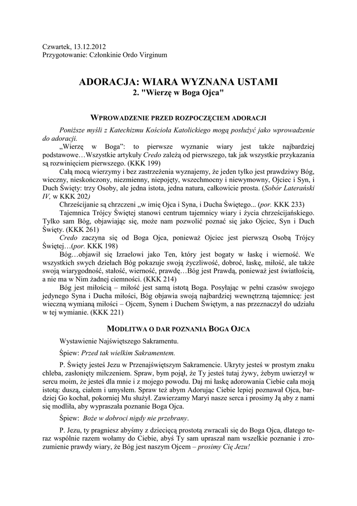 Czwartek, 13.12.2012 Przygotowanie: Członkinie Ordo Virginum ADORACJA: WIARA WYZNANA USTAMI 2. "Wierzę w Boga Ojca" WPROWADZENIE PRZED ROZPOCZĘCIEM ADORACJI PoniŜsze myśli z Katechizmu Kościoła Katolickiego mogą posłuŜyć jako wprowadzenie do adoracji. „Wierzę w Boga”: to pierwsze wyznanie wiary jest takŜe najbardziej podstawowe…Wszystkie artykuły Credo zaleŜą od pierwszego, tak jak wszystkie przykazania są rozwinięciem pierwszego. (KKK 199) Całą mocą wierzymy i bez zastrzeŜenia wyznajemy, Ŝe jeden tylko jest prawdziwy Bóg, wieczny, nieskończony, niezmienny, niepojęty, wszechmocny i niewymowny, Ojciec i Syn, i Duch Święty: trzy Osoby, ale jedna istota, jedna natura, całkowicie prosta. (Sobór Laterański IV, w KKK 202) Chrześcijanie są chrzczeni „w imię Ojca i Syna, i Ducha Świętego... (por. KKK 233) Tajemnica Trójcy Świętej stanowi centrum tajemnicy wiary i Ŝycia chrześcijańskiego. Tylko sam Bóg, objawiając się, moŜe nam pozwolić poznać się jako Ojciec, Syn i Duch Święty. (KKK 261) Credo zaczyna się od Boga Ojca, poniewaŜ Ojciec jest pierwszą Osobą Trójcy Świętej…(por. KKK 198) Bóg…objawił się Izraelowi jako Ten, który jest bogaty w łaskę i wierność. We wszystkich swych dziełach Bóg pokazuje swoją Ŝyczliwość, dobroć, łaskę, miłość, ale takŜe swoją wiarygodność, stałość, wierność, prawdę…Bóg jest Prawdą, poniewaŜ jest światłością, a nie ma w Nim Ŝadnej ciemności. (KKK 214) Bóg jest miłością – miłość jest samą istotą Boga. Posyłając w pełni czasów swojego jedynego Syna i Ducha miłości, Bóg objawia swoją najbardziej wewnętrzną tajemnicę: jest wieczną wymianą miłości – Ojcem, Synem i Duchem Świętym, a nas przeznaczył do udziału w tej wymianie. (KKK 221) MODLITWA O DAR POZNANIA BOGA OJCA Wystawienie Najświętszego Sakramentu. Śpiew: Przed tak wielkim Sakramentem. P. Święty jesteś Jezu w Przenajświętszym Sakramencie. Ukryty jesteś w prostym znaku chleba, zasłonięty milczeniem. Spraw, bym pojął, Ŝe Ty jesteś tutaj Ŝywy, Ŝebym uwierzył w sercu moim, Ŝe jesteś dla mnie i z mojego powodu. Daj mi łaskę adorowania Ciebie cała moją istotą: duszą, ciałem i umysłem. Spraw teŜ abym Adorując Ciebie lepiej poznawał Ojca, bardziej Go kochał, pokorniej Mu słuŜył. Zawierzamy Maryi nasze serca i prosimy Ją aby z nami się modliła, aby wypraszała poznanie Boga Ojca. Śpiew: BoŜe w dobroci nigdy nie przebrany. P. Jezu, ty pragniesz abyśmy z dziecięcą prostotą zwracali się do Boga Ojca, dlatego teraz wspólnie razem wołamy do Ciebie, abyś Ty sam upraszał nam wszelkie poznanie i zrozumienie prawdy wiary, Ŝe Bóg jest naszym Ojcem – prosimy Cię Jezu! L1.Nikt nie zna Syna, tylko Ojciec, ani Ojca nikt nie zna , tylko Syn i ten, komu Syn zechce objawić (Mt 11, 27) prosimy Cię, Jezu, daj nam poznać Ojca, objawiaj nam jego miłość – prosimy Cię Jezu! L2. Jezu, który swoją śmiercią uwielbiłeś Ojca, naucz nas Ŝyć i umierać dla Ojca – prosimy Cię Jezu! L3. Jezu, który przebaczyłeś nam nasze grzechy, naucz nas przebaczać tak, jak Ojciec nam przebacza, uczyń nasze serca miłosierne dla grzeszników - prosimy Cię Jezu! L1. Jezu, który byłeś posłuszny Ojcu aŜ do śmierci i to śmierci krzyŜowej, udziel nam ducha posłuszeństwa, abyśmy nie zasmucali Serca Ojcowskiego - prosimy Cię Jezu! L2. Jezu, który prosiłeś Ojca, abyśmy byli jedno, pomóŜ nam przezwycięŜać wszelkie podziały - prosimy Cię Jezu! L3. Jezu, który jesteś źródłem wszelkich łask, wypraszaj nam łaskę wiary i poboŜności oraz gorącej miłości do Ojca - prosimy Cię Jezu! L1. Jezu, który modliłeś się do Ojca, wysławiam Cię, Ojcze, Panie nieba i ziemi, Ŝe zakryłeś te rzeczy przed mądrymi i roztropnymi, a objawiłeś je prostaczkom, prosimy Cię o dar mądrości BoŜej - prosimy Cię Jezu! L2. Jezu, który trwałeś na modlitwie przed Ojcem, upraszaj nam ducha nieustannej modlitwy - prosimy Cię Jezu! L.3 Jezu, który jesteś wzorem pokory uzdolnij nas do Ŝycia w pokorze - prosimy Cię Jezu! Śpiew: Jezu, cichy i pokorny, uczyń serce me według Serca Twego. P. Z Dzienniczka św. Siostry Faustyny: „Uwielbiam Cię Stwórco i Panie, utajony w Najświętszym Sakramencie. Uwielbiam Cię za wszystkie dzieła rąk Twoich, w których mi się ukazuje tyle mądrości, dobroci i miłosierdzia, o Panie, rozsiałeś tyle piękna na ziemi, a ono mi mówi o piękności Twojej, choć są tylko słabym odbiciem Ciebie, Niepojęta Piękności. Choć ukryłeś i utaiłeś piękność Swoją, oko moje oświecone wiarą dosięga Ciebie i dusza moja poznaje Stwórcę swego, najwyŜsze swe dobro i serce moje całe tonie w modlitwie uwielbienia. Stwórco mój i Panie, Twoja dobroć ośmieliła mnie mówić z Tobą - miłosierdzie Twoje sprawia to, Ŝe znika pomiędzy nami przepaść, która dzieli Stwórcę od stworzenia. Rozmawiać z Tobą o Panie, to rozkosz dla mojego serca, w Tobie znajduję wszystko, czego serce moje zapragnąć moŜe. Tu światło Twoje oświeca mój umysł i czyni go zdolnym do coraz głębszego poznawania Ciebie. Tu na serce moje spływają łask strumienie, tu dusza moja czerpie Ŝycie wiekuiste. Amen” (Dz 1692) Śpiew: O piękności niestworzona. P. Jezu, który jesteś blaskiem piękności Ojca, uzdalniaj nasze serca do uwielbienia naszego Pana Stwórcy, który jest nade wszystko naszym Ojcem. L1. Uwielbiamy Cię Ojcze w tajemnicy Trójcy Świętej - Uwielbiamy Cię Ojcze! L.2 Uwielbiamy Cię Ojcze, który objawiasz nam swoją miłość przez Jezusa Chrystusa w Duchu Świętym - Uwielbiamy Cię Ojcze! L3. Uwielbiamy Cię Ojcze, który wraz z Synem posyłasz nam Ducha Świętego Uwielbiamy Cię Ojcze! L1. Uwielbiamy Cię Ojcze, który wybrałeś Maryje na Matkę swojego Syna i naszą Matkę - Uwielbiamy Cię Ojcze! 2 L2. Uwielbiamy Cię Ojcze, w tajemnicy świętych obcowania - Uwielbiamy Cię Ojcze! L3. Uw