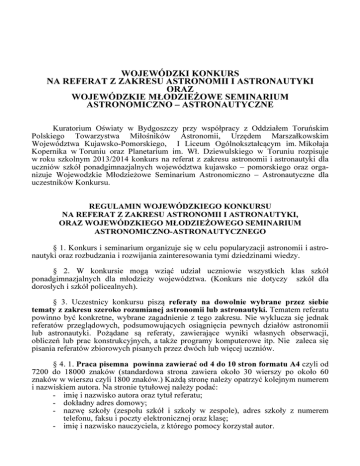 WOJEWÓDZKI KONKURS NA REFERAT Z ZAKRESU ASTRONOMII I ASTRONAUTYKI ORAZ WOJEWÓDZKIE MŁODZIEŻOWE SEMINARIUM ASTRONOMICZNO – ASTRONAUTYCZNE Kuratorium Oświaty w Bydgoszczy przy współpracy z Oddziałem Toruńskim Polskiego Towarzystwa Miłośników Astronomii, Urzędem Marszałkowskim Województwa Kujawsko-Pomorskiego, I Liceum Ogólnokształcącym im. Mikołaja Kopernika w Toruniu oraz Planetarium im. Wł. Dziewulskiego w Toruniu rozpisuje w roku szkolnym 2013/2014 konkurs na referat z zakresu astronomii i astronautyki dla uczniów szkół ponadgimnazjalnych województwa kujawsko – pomorskiego oraz organizuje Wojewodzkie Młodzieżowe Seminarium Astronomiczno – Astronautyczne dla uczestników Konkursu. REGULAMIN WOJEWÓDZKIEGO KONKURSU NA REFERAT Z ZAKRESU ASTRONOMII I ASTRONAUTYKI, ORAZ WOJEWÓDZKIEGO MŁODZIEŻOWEGO SEMINARIUM ASTRONOMICZNO-ASTRONAUTYCZNEGO § 1. Konkurs i seminarium organizuje się w celu popularyzacji astronomii i astronautyki oraz rozbudzania i rozwijania zainteresowania tymi dziedzinami wiedzy. § 2. W konkursie mogą wziąć udział uczniowie wszystkich klas szkół ponadgimnazjalnych dla młodzieży województwa. (Konkurs nie dotyczy szkół dla dorosłych i szkół policealnych). § 3. Uczestnicy konkursu piszą referaty na dowolnie wybrane przez siebie tematy z zakresu szeroko rozumianej astronomii lub astronautyki. Tematem referatu powinno być konkretne, wybrane zagadnienie z tego zakresu. Nie wyklucza się jednak referatów przeglądowych, podsumowujących osiągnięcia pewnych działów astronomii lub astronautyki. Pożądane są referaty, zawierające wyniki własnych obserwacji, obliczeń lub prac konstrukcyjnych, a także programy komputerowe itp. Nie zaleca się pisania referatów zbiorowych pisanych przez dwóch lub więcej uczniów. § 4. 1. Praca pisemna powinna zawierać od 4 do 10 stron formatu A4 czyli od 7200 do 18000 znaków (standardowa strona zawiera około 30 wierszy po około 60 znaków w wierszu czyli 1800 znaków.) Każdą stronę należy opatrzyć kolejnym numerem i nazwiskiem autora. Na stronie tytułowej należy podać: - imię i nazwisko autora oraz tytuł referatu; - dokładny adres domowy; - nazwę szkoły (zespołu szkół i szkoły w zespole), adres szkoły z numerem telefonu, faksu i poczty elektronicznej oraz klasę; - imię i nazwisko nauczyciela, z którego pomocy korzystał autor. 2. Do pracy należy dołączyć spis literatury i innych źródeł informacji, z których korzystano (autor i tytuł książki lub artykułu, rok wydania książki lub nazwa, numer oraz rocznik czasopisma, , tytuły i inne dane dotyczące programów komputerowych (np. multimedialnych encyklopedii itp., dokładne adresy stron www z jakich autor korzystał). 3. Jeżeli do pisemnej pracy dołączony jest program lub prezentacja komputerowa, podać należy minimalne wymagania sprzętowe potrzebne do uruchomienia programu oraz wymienić lub gdy jest to konieczne dołączyć oprogramowanie niezbędne do obejrzenia prezentacji. 4. Praca powinna być napisana w dwóch egzemplarzach, z których jeden zostaje wysłany na konkurs a drugi pozostaje u autora. § 5. 1. Prace konkursowe należy składać lub nadsyłać na adresy: 1) dla uczniów szkół z powiatów: a) Bydgoszcz – powiat ziemski, b) Bydgoszcz – powiat grodzki, c) Inowrocław, d) Mogilno, e) Nakło nad Notecią, f) Sępólno Krajeńskie, g) Świecie, h) Tuchola, i) Żnin, Grzegorz Wojewoda, VI Liceum Ogólnokształcące im. J. J. Śniadeckich w Bydgoszczy, ul. Staszica 4, 85-014 Bydgoszcz 2) dla uczniów szkół z powiatów: a) Toruń – powiat ziemski b) Toruń – powiat grodzki c) Chełmno d) Golub – Dobrzyń e) Wąbrzeźno f) Grudziądz – powiat ziemski g) Brodnica h) Włocławek – powiat ziemski i) Włocławek – powiat grodzki j) Aleksandrów Kujawski k) Lipno l) Radziejów m) Rypin Czesław Stawikowski, Delegatura Toruńska Kuratoriu Oświaty w Bydgoszczy, ul. Moniuszki 15/21, 87-100 Toruń. § 6. Termin składania (nadsyłania) prac upływa dnia 30 stycznia 2014 r. (decyduje data stempla pocztowego). § 7. Jeżeli w jakiejś szkole liczba prac jest większa niż 4 nauczyciel (nauczyciele) fizyki (fizyki i astronomii) winien (winni) przeprowadzić wstępne szkolne eliminacje (mogą się one odbyć m. in. w formie szkolnego seminarium) przed terminem podanym w § 6 i wysłać na konkurs najwyżej 4 najlepsze prace. § 8.Spośród nadesłanych prac Wojewódzka Komisja Konkursowa powołana przez Przewodniczącego Oddziału Toruńskiego Polskiego Towarzystwa Miłośników Astronomii wybierze nie więcej niż 27 prac najwyżej przez nią ocenionych (nie więcej niż po 9 prac odpowiednio z rejonu Bydgoszczy, Torunia i Włocławka) w celu zaprezentowania ich w referatach na seminariach rejonowych. Wyniki oraz informacje o terminach i miejscach seminariów rejonowych zostaną przekazane szkołom do dnia 13 lutego 2013 r. § 9. 1. Autorzy wybranych prac będą je referowali na Rejonowych Seminariach Astronomicznych przeprowadzonych w wybranych szkołach, przy których znajdują się Astrobazy. 2. Do udziału w Seminarium rejonowym zostaną zaproszeni wszyscy autorzy prac razem z opiekunami. 3. Seminaria rejonowe winny odbyć się w terminie od 19 do 25 lutego 2014 roku. 4. Seminaria rejonowe powinny być otwarte dla społeczności lokalnej. Informację o terminie seminariów rejonowych należy upowszechnić w środowisku. Seminaria mogą odbywać się w godzinach popołudniowych lub w soboty. § 10. 1. Spośród referatów wygłoszonych na seminarium rejonowym Rejonowa Komisja konkursowa powołana przez Przewodniczącego Komisji Wojewódzkiej wybierze 4 najlepsze prace i ustali kolejność zajętych przez autorów tych prac miejsc. 2. Autorzy 3 najlepszych referatów z każdego seminarium rejonowego oraz autor jednej pracy wybranej przez Komisję Wojewódzką z prac, które zajęły czwarte miejsca na seminariach rejonowych, będą zakwalifikowani do wystąpienia na XL Wojewódz