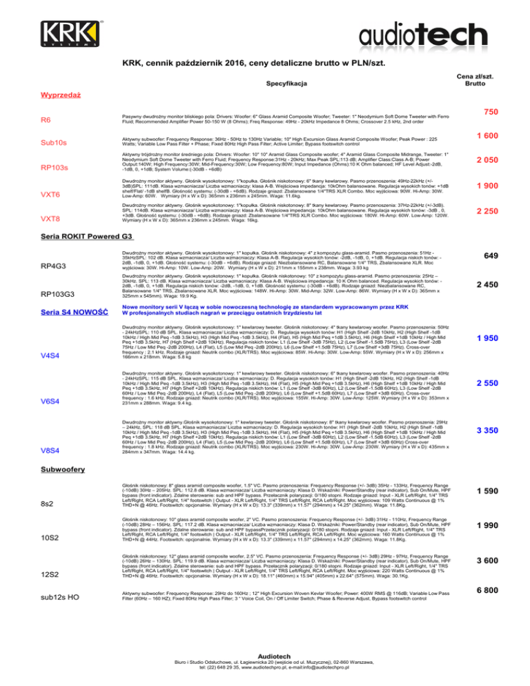 KRK, cennik październik 2016, ceny detaliczne brutto w PLN/szt. Specyfikacja Cena zł/szt. Brutto Wyprzedaż R6 Pasywny dwudrożny monitor bliskiego pola: Drivers: Woofer: 6" Glass Aramid Composite Woofer; Tweeter: 1" Neodymium Soft Dome Tweeter with Ferro Fluid; Recommended Amplifier Power 50-150 W (8 Ohms); Freq Response: 49Hz - 20kHz Impedance 8 Ohms; Crossover 2.5 kHz, 2nd order Sub10s Aktywny subwoofer: Frequency Response: 36Hz - 50Hz to 130Hz Variable; 10" High Excursion Glass Aramid Composite Woofer; Peak Power : 225 Watts; Variable Low Pass Filter + Phase; Fixed 80Hz High Pass Filter; Active Limiter; Bypass footswitch control RP103s Aktywny trójdrożny monitor średniego pola: Drivers: Woofer: 10" 10" Aramid Glass Composite woofer; 4" Aramid Glass Composite Midrange, Tweeter: 1" Neodymium Soft Dome Tweeter with Ferro Fluid; Frequency Response:31Hz - 20kHz; Max Peak SPL:113 dB; Amplifier Class:Class A-B; Power Output:140W; High Frequency:30W; Mid-Frequency:30W; Low Frequency:80W; Input Impedance (Ohms):10 K Ohm balanced; HF Level Adjust:-2dB, -1dB, 0, +1dB; System Volume:(-30dB - +6dB) VXT6 Dwudrożny monitor aktywny. Głośnik wysokotonowy: 1"kopułka. Głośnik niskotonowy: 6" tkany kewlarowy. Pasmo przenoszenia: 49Hz-22kHz (+/3dB)SPL: 111dB. Klasa wzmacniacza/ Liczba wzmacniaczy: klasa A-B. Wejściowa impedancja: 10kOhm balansowane. Regulacja wysokich tonów: +1dB shelf/Flat/ -1dB shelfB. Głośność systemu: (-30dB - +6dB). Rodzaje gniazd: Zbalansowane 1/4"TRS XLR Combo. Moc wyjściowa: 90W. Hi-Amp: 30W. Low-Amp: 60W. Wymiary (H x W x D): 365mm x 236mm x 245mm. Waga: 11.6kg. VXT8 Dwudrożny monitor aktywny. Głośnik wysokotonowy: 1"kopułka. Głośnik niskotonowy: 8" tkany kewlarowy. Pasmo przenoszenia: 37Hz-22kHz (+/-3dB). SPL: 114dB. Klasa wzmacniacza/ Liczba wzmacniaczy: klasa A-B. Wejściowa impedancja: 10kOhm balansowane. Regulacja wysokich tonów: -3dB , 0, +3dB. Głośność systemu: (-30dB - +6dB). Rodzaje gniazd: Zbalansowane 1/4"TRS XLR Combo. Moc wyjściowa: 180W. Hi-Amp: 60W. Low-Amp: 120W. Wymiary (H x W x D): 365mm x 236mm x 245mm. Waga: 16kg. 750 1 600 2 050 1 900 2 250 Seria ROKIT Powered G3 RP4G3 Dwudrożny monitor aktywny. Głośnik wysokotonowy: 1" kopułka. Głośnik niskotonowy: 4" z kompozytu glass-aramid. Pasmo przenoszenia: 51Hz 35kHzSPL: 102 dB. Klasa wzmacniacza/ Liczba wzmacniaczy: Klasa A-B. Regulacja wysokich tonów: -2dB, -1dB, 0, +1dB. Regulacja niskich tonów: 2dB, -1dB, 0, +1dB. Głośność systemu: (-30dB - +6dB). Rodzaje gniazd: Niezbalansowane RC, Balansowane 1/4" TRS, Zbalansowane XLR. Moc wyjściowa: 30W. Hi-Amp: 10W. Low-Amp: 20W. Wymiary (H x W x D): 211mm x 155mm x 238mm. Waga: 3.93 kg RP103G3 Dwudrożny monitor aktywny. Głośnik wysokotonowy: 1" kopułka. Głośnik niskotonowy: 10" z kompozytu glass-aramid. Pasmo przenoszenia: 25Hz – 30kHz. SPL: 113 dB. Klasa wzmacniacza/ Liczba wzmacniaczy: Klasa A-B. Wejściowa impedancja: 10 K Ohm balanced. Regulacja wysokich tonów: 2dB, -1dB, 0, +1dB. Regulacja niskich tonów: -2dB, -1dB, 0, +1dB. Głośność systemu: (-30dB - +6dB). Rodzaje gniazd: Niezbalansowane RC, Balansowane 1/4" TRS, Zbalansowane XLR. Moc wyjściowa: 148W. Hi-Amp: 30W. Mid-Amp: 32W. Low-Amp: 86W. Wymiary (H x W x D): 365mm x 325mm x 545mm). Waga: 19.9 Kg. Seria S4 NOWOŚĆ Nowe monitory serii V łączą w sobie nowoczesną technologię ze standardem wypracowanym przez KRK W profesjonalnych studiach nagrań w przeciągu ostatnich trzydziestu lat V4S4 Dwudrożny monitor aktywny. Głośnik wysokotonowy: 1" kewlarowy tweeter. Głośnik niskotonowy: 4" tkany kewlarowy woofer. Pasmo przenoszenia: 50Hz - 24kHzSPL: 110 dB SPL. Klasa wzmacniacza/ Liczba wzmacniaczy: D. Regulacja wysokich tonów: H1 (High Shelf -2dB 10kHz, H2 (High Shelf -1dB 10kHz / High Mid Peq -1dB 3.5kHz), H3 (High Mid Peq -1dB 3.5kHz), H4 (Flat), H5 (High Mid Peq +1dB 3.5kHz), H6 (High Shelf +1dB 10kHz / High Mid Peq +1dB 3.5kHz, H7 (High Shelf +2dB 10kHz). Regulacja niskich tonów: L1 (Low Shelf -3dB 75Hz), L2 (Low Shelf -1.5dB 75Hz), L3 (Low Shelf -2dB 75Hz / Low Mid Peq -2dB 200Hz), L4 (Flat), L5 (Low Mid Peq -2dB 200Hz), L6 (Low Shelf +1.5dB 75Hz), L7 (Low Shelf +3dB 75Hz). Cross-over frequency : 2.1 kHz. Rodzaje gniazd: Neutrik combo (XLR/TRS). Moc wyjściowa: 85W. Hi-Amp: 30W. Low-Amp: 55W. Wymiary (H x W x D): 256mm x 166mm x 218mm. Waga: 5.8 kg V6S4 Dwudrożny monitor aktywny. Głośnik wysokotonowy: 1" kewlarowy tweeter. Głośnik niskotonowy: 6" tkany kewlarowy woofer. Pasmo przenoszenia: 40Hz - 24kHzSPL: 115 dB SPL. Klasa wzmacniacza/ Liczba wzmacniaczy: D. Regulacja wysokich tonów: H1 (High Shelf -2dB 10kHz, H2 (High Shelf -1dB 10kHz / High Mid Peq -1dB 3.5kHz), H3 (High Mid Peq -1dB 3.5kHz), H4 (Flat), H5 (High Mid Peq +1dB 3.5kHz), H6 (High Shelf +1dB 10kHz / High Mid Peq +1dB 3.5kHz, H7 (High Shelf +2dB 10kHz). Regulacja niskich tonów: L1 (Low Shelf -3dB 60Hz), L2 (Low Shelf -1.5dB 60Hz), L3 (Low Shelf -2dB 60Hz / Low Mid Peq -2dB 200Hz), L4 (Flat), L5 (Low Mid Peq -2dB 200Hz), L6 (Low Shelf +1.5dB 60Hz), L7 (Low Shelf +3dB 60Hz). Cross-over frequency : 1.6 kHz. Rodzaje gniazd: Neutrik combo (XLR/TRS). Moc wyjściowa: 155W. Hi-Amp: 30W. Low-Amp: 125W. Wymiary (H x W x D): 353mm x 231mm x 288mm. Waga: 9.4 kg. V8S4 Dwudrożny monitor aktywny.Głośnik wysokotonowy: 1" kewlarowy tweeter. Głośnik niskotonowy: 8" tkany kewlarowy woofer. Pasmo przenoszenia: 29Hz – 24kHz, SPL: 118 dB SPL. Klasa wzmacniacza/ Liczba wzmacniaczy: D. Regulacja wysokich tonów: H1 (High Shelf -2dB 10kHz, H2 (High Shelf -1dB 10kHz / High Mid Peq -1dB 3.5kHz), H3 (High Mid Peq -1dB 3.5kHz), H4 (Flat), H5 (High Mid Peq +1dB 3.5kHz), H6 (High Shelf +1dB 10kHz / High Mid Peq +1dB 3.5kHz, H7 (High Shelf +2dB 10kHz). Regulacja niskich tonów: L1 (Low Shelf -3dB 60Hz), L2 (Low Shelf -1.5dB 60Hz), L3 (Low Shelf -2dB 60Hz / Low Mid Peq -2dB 200Hz), L4 (Flat), L5 (Low Mid Peq -2dB 200Hz), L6 (Low Shelf +1.5dB 60Hz), L7 (Low Shelf +3dB 60Hz) Cross-over frequency : 1.8 kHz.