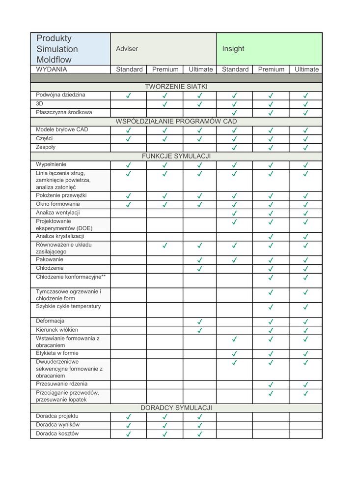 Produkty Simulation Moldflow Adviser WYDANIA Standard Podwójna dziedzina 3D Płaszczyzna środkowa Modele bryłowe CAD Części Zespoły Wypełnienie Linia łączenia strug, zamknięcie powietrza, analiza zatonięć Położenie przewężki Okno formowania ✓ Insight Premium Ultimate Standard Premium Ultimate ✓ ✓ ✓ ✓ ✓ ✓ ✓ ✓ ✓ ✓ ✓ ✓ ✓ ✓ ✓ ✓ ✓ ✓ ✓ ✓ ✓ ✓ ✓ ✓ ✓ ✓ ✓ ✓ ✓ ✓ ✓ ✓ ✓ ✓ ✓ ✓ ✓ ✓ ✓ ✓ ✓ ✓ ✓ ✓ ✓ ✓ ✓ ✓ ✓ ✓ ✓ ✓ ✓ ✓ ✓ ✓ ✓ ✓ ✓ ✓ ✓ ✓ ✓ ✓ TWORZENIE SIATKI ✓ ✓ ✓ ✓ ✓ ✓ ✓ WSPÓŁDZIAŁANIE PROGRAMÓW CAD ✓ ✓ ✓ ✓ ✓ ✓ ✓ ✓ ✓ FUNKCJE SYMULACJI ✓ ✓ ✓ ✓ ✓ ✓ ✓ ✓ ✓ ✓ ✓ ✓ ✓ ✓ Analiza wentylacji Projektowanie eksperymentów (DOE) Analiza krystalizacji ✓ Równoważenie układu zasilającego Pakowanie Chłodzenie Chłodzenie konformacyjne** Tymczasowe ogrzewanie i chłodzenie form Szybkie cykle temperatury ✓ ✓ Deformacja Kierunek włókien Wstawianie formowania z obracaniem Etykieta w formie Dwuuderzeniowe sekwencyjne formowanie z obracaniem Przesuwanie rdzenia Przeciąganie przewodów, przesuwanie łopatek Doradca projektu Doradca wyników Doradca kosztów ✓ ✓ ✓ DORADCY SYMULACJI ✓ ✓ ✓ ✓ ✓ ✓ Produkty Simulation Moldflow Insight Adviser WYDANIA Termoplastyczne formowanie wtryskowe Reaktywne i przenoszone formowanie wtryskowe Standard Premium Ultimate Standard PROCESY FORMOWANIA ✓ ✓ ✓ ✓ Formowanie wtryskowe gumy i płynnego silikonu Wielokanałowe formowanie reaktywne Strukturalne reaktywne formowanie wtryskowe Moduł Microchip Encapsulation Moduł Underfill Encapsulation Formowanie wtryskowe w obecności gazu Formowanie wstryskowościskające Formowanie ściskające Premium Ultimate ✓ ✓ ✓ ✓ ✓ ✓ ✓ ✓ ✓ ✓ ✓ ✓ ✓ ✓ ✓ ✓ ✓ ✓ ✓ ✓ Formowanie współwtryskowe ✓ ✓ Formowanie dwuwtryskowe ✓ MuCell ✓ ✓ Dwójłomność ✓ Materiały termoplastyczne BAZY DANYCH ✓ ✓ Materiały termoutwardzalne Formierki Materiały chłodzące Formowanie materiałów Simulation Mechanical (MES) ✓ ✓ ✓ ✓ ✓ ✓ ✓ ✓ ✓ ✓ ✓ ✓ ✓ ✓ ✓ ✓ ✓ ✓ ✓ ✓ ✓ ✓ ✓ ✓ ✓ ✓ ✓ ✓ ✓ ✓ ✓ ✓ ✓ ✓ INTERFEJS OPROGRAMOWANIA ✓ ✓ ✓ Abaqus (MES) ANSYS (MES) LS-DYNA (MES) NEi Nastran (MES) CODE V (Dwójłomność) Showcase (wizualizacja błędów) Inventor Fusion Vault Simulation Moldflow Communicator ✓ ✓ ✓ ✓ DOŁĄCZONE OPROGRAMOWANIE I USŁUGI ✓ ✓ ✓ ✓ ✓ ✓ ✓ ✓ ✓ ✓ ✓ ✓ W razie pytań prosimy o kontakt: Centrala Kraków: Oddział Rzeszów: ul. Rzemieślnicza 1/607,608 ul. Litewska 8 30-363 Kraków 35-302 Rzeszów tel. 12 252 06 00; fax 12 252 06 50 tel. 693 98 39 08 e-mail: [email protected] e-mail: [email protected] MAT USŁUGI INFORMATYCZNE SPÓŁKA Z OGRANICZONĄ ODPOWIEDZIALNOŚCIĄ SPÓŁKA KOMANDYTOWA