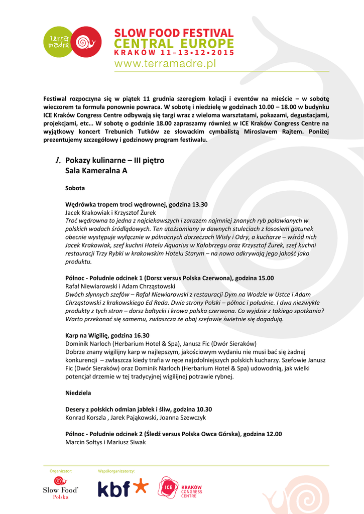Festiwal rozpoczyna się w piątek 11 grudnia szeregiem kolacji i eventów na mieście – w sobotę wieczorem ta formuła ponownie powraca. W sobotę i niedzielę w godzinach 10.00 – 18.00 w budynku ICE Kraków Congress Centre odbywają się targi wraz z wieloma warsztatami, pokazami, degustacjami, projekcjami, etc… W sobotę o godzinie 18.00 zapraszamy również w ICE Kraków Congress Centre na wyjątkowy koncert Trebunich Tutków ze słowackim cymbalistą Miroslavem Rajtem. Poniżej prezentujemy szczegółowy i godzinowy program festiwalu.  Pokazy kulinarne – III piętro Sala Kameralna A Sobota Wędrówka tropem troci wędrownej, godzina 13.30 Jacek Krakowiak i Krzysztof Żurek Troć wędrowna to jedna z najciekawszych i zarazem najmniej znanych ryb poławianych w polskich wodach śródlądowych. Ten utożsamiany w dawnych stuleciach z łososiem gatunek obecnie występuje wyłącznie w północnych dorzeczach Wisły i Odry, a kucharze – wśród nich Jacek Krakowiak, szef kuchni Hotelu Aquarius w Kołobrzegu oraz Krzysztof Żurek, szef kuchni restauracji Trzy Rybki w krakowskim Hotelu Starym – na nowo odkrywają jego jakość jako produktu. Północ - Południe odcinek 1 (Dorsz versus Polska Czerwona), godzina 15.00 Rafał Niewiarowski i Adam Chrząstowski Dwóch słynnych szefów – Rafał Niewiarowski z restauracji Dym na Wodzie w Ustce i Adam Chrząstowski z krakowskiego Ed Reda. Dwie strony Polski – północ i południe. I dwa niezwykłe produkty z tych stron – dorsz bałtycki i krowa polska czerwona. Co wyjdzie z takiego spotkania? Warto przekonać się samemu, zwłaszcza że obaj szefowie świetnie się dogadują. Karp na Wigilię, godzina 16.30 Dominik Narloch (Herbarium Hotel & Spa), Janusz Fic (Dwór Sieraków) Dobrze znany wigilijny karp w najlepszym, jakościowym wydaniu nie musi bać się żadnej konkurencji – zwłaszcza kiedy trafia w ręce najzdolniejszych polskich kucharzy. Szefowie Janusz Fic (Dwór Sieraków) oraz Dominik Narloch (Herbarium Hotel & Spa) udowodnią, jak wielki potencjał drzemie w tej tradycyjnej wigilijnej potrawie rybnej. Niedziela Desery z polskich odmian jabłek i śliw, godzina 10.30 Konrad Korszla , Jarek Pająkowski, Joanna Szewczyk Północ - Południe odcinek 2 (Śledź versus Polska Owca Górska), godzina 12.00 Marcin Sołtys i Mariusz Siwak Polski kawior i polska wódka ziemniaczana, godzina 13.30 Dominik Narloch i Agata Łakomiak (Antonius Caviar)  Laboratoria smaku Zespół Sal Konferencyjnych, III piętro, Sala 1 Zrób to sam! - Sobota Domowe wędliny, godzina 11:00 Zbyszek Aftaruk (Dwór Zaścianek, Podlasie) Pieczenie chleba, godzina 12:30 Piotrek Chruścicki (domowy piekarz), Adam Piskorek (zawodowy piekarz). Domowy wyrób nalewek, godzina 14:00 Karol Majewski Coffee Hunting - czyli jak wybierane są najlepsze kawy świata i jak tę jakość podtrzymać w domu, godzina 15.30 Filip Bartelak Wszystkie kuchnie polskie – Niedziela Polskie kulinaria, te historyczne i te współczesne, wyrastają z korzeni wielu kultur. Podczas niedzielnych laboratoriów przyjrzymy się od kuchni narodowym i religijnym tradycjom, które współkształtowały i nadal współkształtują gastronomiczne zwyczaje nad Wisłą. Kuchnia tatarska, godzina 11:00 Dżenneta Bogdanowicz Spotkanie z Tatarką z dziada pradziada, właścicielką i gospodynią słynnej Tatarskiej Jurty (gościnnego gospodarstwa w Kruszynianach, w sercu Puszczy Knyszyńskiej), niestrudzoną propagatorką tatarskich tradycji kulinarnych. Podczas laboratorium będzie okazja spróbować tatarskich przysmaków: pierekaczewnika i kołdunów. Azja w Polsce, godzina 12:30 Marcin R. Szulżycki, Bitos Hoang, Mateusz Suchecki Jak ewoluowało pojęcie azjatyckiej kuchni na przestrzeni czasu - mocno interaktywna prezentacja Marcina R. Szulżyckiego z bloga sodkokwasna.pl, łącznika między kuchnią polską a azjatycką. Dowiemy się dlaczego sajgonka ma taką nazwę tylko w Polsce, do czego można użyć sosu rybnego, jak zrobić polskie jabłko o smaku kimchi i co wyniknie z połączenia typowej polskiej przekąski alkoholowej z azjatycką oprawą. Udział wezmą też zaproszeni goście: Bitos Hoang i Mateusz Suchecki, którzy wspólnie ujarzmiają i łączą azjatyckie i polskie smaki. Kuchnia żydowska, godzina 14:00 Trudno przecenić wzajemne wpływy kuchni polskiej i żydowskiej. Świadczą o tym nowojorskie bajgle z łososiem, świadczą polskie barowe gołąbki i odświętny karp po żydowsku. O mitach i zapomnianych sekretach polsko-żydowskiej tradycji kulinarnej opowiedzą przedstawiciele krakowskiego Jewish Community Center. Nie zabraknie też wpisujących się w tę opowieść przysmaków. Wódka Dwór Sieraków i Food Pairing, godzina 15.30 Różne wersje wódki od klasycznej, poprzez leżakowaną w dębie, z pieprzem, aż po tę z kwiatów z czarnego bzu próbowane z oryginalnymi przekąskami. Komentowana degustacja pod okiem znawcy mocnych alkoholi Pawła Gąsiorka "Dom Wina" oraz Janusza Fica "Dwór Sieraków"  Wina dajcie Zespół Sal Konferencyjnych, Sale 3 i 4 SOBOTA Sala 3 “Różne oblicza Węgier - czar Tokaju, Egeru i Badacsony”, 11.00 Nowe oblicza z trzech ważnych węgierskich regionów winiarskich. Swoje wina zaprezentują i o filozofii produkcji opowiedzą Atilla Petreny (Eger), Istvan Bencze (Badacsony) . Obydwaj winiarze reprezentowani są w Polsce przez importera Rafa Wino, który podczas seminarium zaprezentuje również wina z winiarni Tokaj Nobilis, prowadzonej przez Sarlotę Bardos. Będzie więc okazja zobaczyć Węgry w ich rozmaitości – to trzy różne regiony, inna stylistyka win, inne odmiany winorośli i różne podejście do wina. Sala 4 Klasyka Sangiovese czy też nowoczesny styl Bolgheri, 12.00 Winnica Selvapiana w Chianti Rufina versus winnica Fornacelle z Bolgheri. Chianti przedstawiać nie trzeba – to największa włoska apelacja winiarska i jedna z największych na świecie. Posmakowanie jednak prawdziwego Chianti, to już jednak 