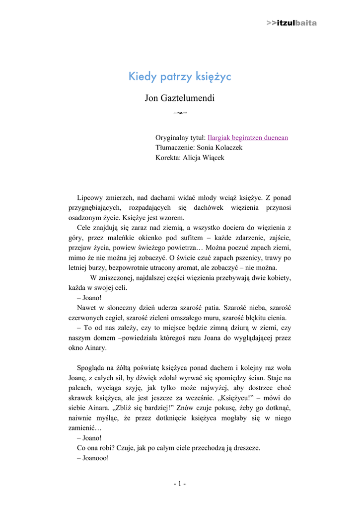 >>itzulbaita Kiedy patrzy księżyc Jon Gaztelumendi Oryginalny tytuł: Ilargiak begiratzen duenean Tłumaczenie: Sonia Kolaczek Korekta: Alicja Wiącek Lipcowy zmierzch, nad dachami widać młody wciąż księżyc. Z ponad przygnębiających, rozpadających się dachówek więzienia przynosi osadzonym życie. Księżyc jest wzorem. Cele znajdują się zaraz nad ziemią, a wszystko dociera do więzienia z góry, przez maleńkie okienko pod sufitem – każde zdarzenie, zajście, przejaw życia, powiew świeżego powietrza… Można poczuć zapach ziemi, mimo że nie można jej zobaczyć. O świcie czuć zapach pszenicy, trawy po letniej burzy, bezpowrotnie utracony aromat, ale zobaczyć – nie można. W zniszczonej, najdalszej części więzienia przebywają dwie kobiety, każda w swojej celi. – Joano! Nawet w słoneczny dzień uderza szarość patia. Szarość nieba, szarość czerwonych cegieł, szarość zieleni omszałego muru, szarość błękitu cienia. – To od nas zależy, czy to miejsce będzie zimną dziurą w ziemi, czy naszym domem –powiedziała któregoś razu Joana do wyglądającej przez okno Ainary. Spogląda na żółtą poświatę księżyca ponad dachem i kolejny raz woła Joanę, z całych sił, by dźwięk zdołał wyrwać się spomiędzy ścian. Staje na palcach, wyciąga szyję, jak tylko może najwyżej, aby dostrzec choć skrawek księżyca, ale jest jeszcze za wcześnie. „Księżycu!” – mówi do siebie Ainara. „Zbliż się bardziej!” Znów czuje pokusę, żeby go dotknąć, naiwnie myśląc, że przez dotknięcie księżyca mogłaby się w niego zamienić… – Joano! Co ona robi? Czuje, jak po całym ciele przechodzą ją dreszcze. – Joanooo! -1- >>itzulbaita Gasteiz – Poznan 2010 – Słyszę… „Słyszę, słyszę” – powtarza Ainara zdenerwowana. – Napisał do mnie Manu z więzienia w Salto. Wygląda na to, że zabierają im materace na dzień. – Dlaczego? – Ainhoa zakłada za ucho kosmyk włosów. – Bo nie chcieli stać w trakcie przeliczania. – Dalej jest sam na oddziale? – Jest coraz gorzej. Joana chodzi po celi tam i z powrotem. W ciszy zmierzchu szept ich rozmowy brzmi jak burza. Nagle zapalają się umieszczone w ścianach światła. Z czterech żarówek świecą się tylko dwie. Wewnętrzny dziedziniec przypomina brzydką ulicę. Księżyc wspina się po niebie, aż wreszcie pojawia się nad Ainarą, oświetlając celę. A jak na nią patrzy! Wiedząc, że Joana po wielokroć będzie czytała list od Manu, Ainara zabija czas czekając w oknie, aż popołudnie przejdzie w noc. Słychać szczekanie psa, które wydaje jej się rozpaczliwe. Rozlega się pip–pip zegara. Wraz z alarmem otwierają się drzwi celi. Strażnik idzie, powłócząc nogami. Najpierw zatrzymuje się przed celą Joany, po siedmiu krokach podchodzi do drzwi Ainary i wraca, przeliczywszy więźniów. Są trzy minuty po dziesiątej. Piętnaście po dziesiątej, Joana jak co dzień podchodzi do okna i rozmawiają do jedenastej, tak jak lubi Ainara. Z rozmową miesza się żałosne szczekanie psa, dym z papierosa, ten półksiężyc, lot sowy, która pohukuje, patrolując swoje terytorium w tę duszną, letnią noc… O jedenastej, jak zwykle, kobiety wycofują się, każda w głąb swojej celi. Ainara włącza radio. Na żelaznym stoliku kładzie kilka czystych kartek, a na półce małą lampkę. Nalewa wody do szklanki… Jest bardzo zmęczona, być może zmorzona upałem, i ten księżyc. Kładzie się na łóżku. Z radia dochodzi melancholijny ton gitary. Strumień dźwięków któremu daje się porwać, zlewa się z jej wewnętrzną muzyką. Z zalanych spokojem zakamarków duszy wynurza się Josu. Znów. Kolejny raz. Nadlatują wspomnienia, nadlatują i odlatują. Zanurza dłoń w rzece, jakby chciała nabrać wody. Ile miłości może zmieścić się w dłoni? Już nie wie, ile razy zadawała sobie te pytania, a kiedy chce wrócić do źródła, otwierają się drzwi celi. Do celi wchodzi naczelnik, przełożony więzienia i kilku strażników. – Nie chcemy żadnych problemów – zaczyna naczelnik, przesadnie gestykulując. – Powiedzcie jej, co się stało. -2- >>itzulbaita Gasteiz – Poznan 2010 „Co się stało” Ainarze wydaje się to dziwne. Coś muszą kombinować. – Pani Nieves… – przełożony robi krok w stronę Ainary, odkasłuje i ciągnie dalej. – Podczas liczenia o trzeciej znaleźliśmy Joanę, pani koleżankę, martwą. To wszystko. – Co? – Nie chcemy żadnych problemów! – powtórzył przełożony. – Jako że była martwa, natychmiast zostałem powiadomiony ja, zawołaliśmy lekarza i zawiadomiliśmy dyżurującego sędziego. To wszystko. Coś ją ściska w żołądku, coś jak cień, ciężki cień, który rozlewa się po całym ciele, a gdy podchodzi jej do gardła, Ainara niespodziewanie mówi: – Jeśli to prawda, że Joana nie żyje… Chcę to zobaczyć! Nikt nie wie, co powiedzieć. Przełożony podnosi dłoń i przesuwa dwoma palcami po kącikach ust. – To wbrew regulaminowi, ale jest to zrozumiałe – przytakuje i jednym ruchem ręki nakazuje przejść do sąsiedniej celi. Ainara rusza przodem, a za nią grupa strażników. Do celi Joany jest nie więcej niż 6 metrów. Zauważa, że drzwi są uchylone. Gdy zatrzymuje się przed nimi, strażnicy również stają w miejscu. Jednym ruchem otwiera ciężkie żelazne drzwi – strach, sucho w ustach, drżenie dłoni. Nie otwiera ich jednak na oścież. Gdy zagląda do środka, widzi Joanę. Lampka stojąca po drugiej stronie celi słabo oświetla łóżko, na którym leży. Ainara spogląda w lewo, gdzie na korytarzu stoi przełożony i strażnicy. – Dajcie mi pobyć z nią dziesięć minut. Sam na sam! Przełożony odruchowo spogląda na zegarek. Gdy przytakuje ruchem głowy, Ainara wchodzi do celi, zostawiając ich na korytarzu. Zamyka za sobą drzwi. Po prawej, ścianę barwi na trzy kolory wielka ikurrina1. Ainhara robi dwa kroki w kierun