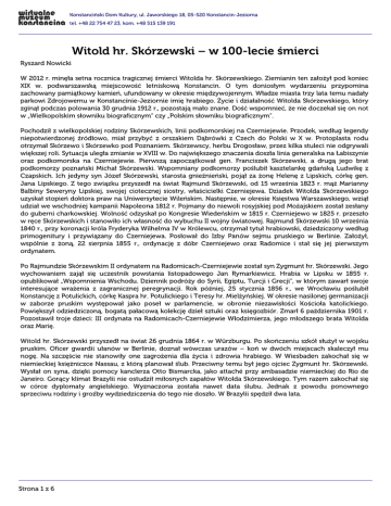 Konstanciński Dom Kultury, ul. Jaworskiego 18, 05-520 Konstancin-Jeziorna tel. +48 22 754 47 23, kom. +48 515 139 191 Witold hr. Skórzewski – w 100-lecie śmierci Ryszard Nowicki W 2012 r. minęła setna rocznica tragicznej śmierci Witolda hr. Skórzewskiego. Ziemianin ten założył pod koniec XIX w. podwarszawską miejscowość letniskową Konstancin. O tym doniosłym wydarzeniu przypomina zachowany pamiątkowy kamień, ufundowany w okresie międzywojennym. Władze miasta trzy lata temu nadały parkowi Zdrojowemu w Konstancinie-Jeziornie imię hrabiego. Życie i działalność Witolda Skórzewskiego, który zginął podczas polowania 30 grudnia 1912 r., pozostają mało znane. Dość wspomnieć, że nie doczekał się on not w „Wielkopolskim słowniku biograficznym” czy „Polskim słowniku biograficznym”. Pochodził z wielkopolskiej rodziny Skórzewskich, linii podkomorskiej na Czerniejewie. Przodek, według legendy niepotwierdzonej źródłowo, miał przybyć z orszakiem Dąbrówki z Czech do Polski w X w. Protoplasta rodu otrzymał Skórzewo i Skórzewko pod Poznaniem. Skórzewscy, herbu Drogosław, przez kilka stuleci nie odgrywali większej roli. Sytuacja uległa zmianie w XVIII w. Do największego znaczenia doszła linia generalska na Łabiszynie oraz podkomorska na Czerniejewie. Pierwszą zapoczątkował gen. Franciszek Skórzewski, a drugą jego brat podkomorzy poznański Michał Skórzewski. Wspomniany podkomorzy poślubił kasztelankę gdańską Ludwikę z Czapskich. Ich jedyny syn Józef Skórzewski, starosta gnieźnieński, pojął za żonę Helenę z Lipskich, córkę gen. Jana Lipskiego. Z tego związku przyszedł na świat Rajmund Skórzewski, od 15 września 1823 r. mąż Marianny Balbiny Seweryny Lipskiej, swojej ciotecznej siostry, właścicielki Czerniejewa. Dziadek Witolda Skórzewskiego uzyskał stopień doktora praw na Uniwersytecie Wileńskim. Następnie, w okresie Księstwa Warszawskiego, wziął udział we wschodniej kampanii Napoleona 1812 r. Pojmany do niewoli rosyjskiej pod Możajskiem został zesłany do guberni charkowskiej. Wolność odzyskał po Kongresie Wiedeńskim w 1815 r. Czerniejewo w 1825 r. przeszło w ręce Skórzewskich i stanowiło ich własność do wybuchu II wojny światowej. Rajmund Skórzewski 10 września 1840 r., przy koronacji króla Fryderyka Wilhelma IV w Królewcu, otrzymał tytuł hrabiowski, dziedziczony według primogenitury i przywiązany do Czerniejewa. Posłował do Izby Panów sejmu pruskiego w Berlinie. Założył, wspólnie z żoną, 22 sierpnia 1855 r., ordynację z dóbr Czerniejewo oraz Radomice i stał się jej pierwszym ordynatem. Po Rajmundzie Skórzewskim II ordynatem na Radomicach-Czerniejewie został syn Zygmunt hr. Skórzewski. Jego wychowaniem zajął się uczestnik powstania listopadowego Jan Rymarkiewicz. Hrabia w Lipsku w 1855 r. opublikował „Wspomnienia Wschodu. Dziennik podróży do Syrii, Egiptu, Turcji i Grecji”, w którym zawarł swoje interesujące wrażenia z zagranicznej peregrynacji. Rok później, 25 stycznia 1856 r., we Wrocławiu poślubił Konstancję z Potulickich, córkę Kaspra hr. Potulickiego i Teresy hr. Mielżyńskiej. W okresie nasilonej germanizacji w zaborze pruskim występował jako poseł w parlamencie, w obronie niezawisłości Kościoła katolickiego. Powiększył odziedziczoną, bogatą pałacową kolekcję dzieł sztuki oraz księgozbiór. Zmarł 6 października 1901 r. Pozostawił troje dzieci: III ordynata na Radomicach-Czerniejewie Włodzimierza, jego młodszego brata Witolda oraz Marię. Witold hr. Skórzewski przyszedł na świat 26 grudnia 1864 r. w Wűrzburgu. Po skończeniu szkół służył w wojsku pruskim. Oficer gwardii ułanów w Berlinie, doznał wówczas urazów – koń w dwóch miejscach skaleczył mu nogę. Na szczęście nie stanowiły one zagrożenia dla życia i zdrowia hrabiego. W Wiesbaden zakochał się w niemieckiej księżniczce Nassau, z którą planował ślub. Przeciwny temu był jego ojciec Zygmunt hr. Skórzewski. Wysłał on syna, dzięki pomocy kanclerza Otto Bismarcka, jako attaché przy ambasadzie niemieckiej do Rio de Janeiro. Gorący klimat Brazylii nie ostudził miłosnych zapałów Witolda Skórzewskiego. Tym razem zakochał się w córce dyplomaty angielskiego. Wyznaczona została nawet data ślubu. Jednak z powodu ponownego sprzeciwu rodziny i groźby wydziedziczenia do tego nie doszło. W Brazylii spędził dwa lata. Strona 1 z 6 Konstanciński Dom Kultury, ul. Jaworskiego 18, 05-520 Konstancin-Jeziorna tel. +48 22 754 47 23, kom. +48 515 139 191 Kilka lat po powrocie do kraju, w maju 1892 r., zaręczył się z księżniczką Marią Radziwiłł z Towian na Litwie, córką Karola Wilhelma i Jadwigi Stefanii z Broel-Platerów, wnuczką Konstantego, szambelana dworu carskiego w Petersburgu. W Warszawie 25 lipca 1892 r. zawarli oni notarialnie intercyzę przedślubną. W chwili podpisania dokumentu Maria Radziwiłł miała 20 lat. Witold Skórzewski był o 8 lat starszy. W świetle obowiązującego prawa została uznana za osobę małoletnią. Dlatego też potrzebna była zgoda i podpis jej ojca, Karola Wilhelma Radziwiłła. Warto zwrócić uwagę na fakt, że przyszli małżonkowie mieszkali na terenach dwóch zaborów: pruskiego i rosyjskiego. Tekst sporządzono w językach polskim i rosyjskim oraz został przetłumaczony na język niemiecki. Ich ślub odbył się 26 lipca tego roku w warszawskim kościele wizytek. Razem zamieszkali w Komorzu, niedaleko Wrześni. Dziewięć miesięcy po zawarciu związku małżeńskiego, 26 kwietnia 1893 r., przyszła na świat córka Maria, 23 maja 1894 r. Zygmunt, a 27 sierpnia 1897 r. Karol. Witold Skórzewski, już po ślubie, będąc wykonawcą testamentu Marii hr. Grzymały-Potulickiej, założył w 1897 r. z części dóbr oborskich podwarszawską miejscowość letniskową Konstancin. Nazwa pochodzi od imienia jego matki, a siostry Marii, Konstancji z Potulickich hr. Skórzewskiej, kt