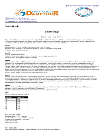 Jesteśmy zrzeszeni w Polskiej Izbie Turystyki ul. Kościuszki 18, 83-300 Kartuzy Tel. + 48 58 764-35-50; Fax +48 58 746-35-51 www.damptour.eu e-mail: [email protected] Smaki Grecji Smaki Grecji Saloniki – Ateny – Delfy – Meteory Grecja to kraj błękitnego morza, nieustannego słońca, białych domków i wielkiej historii. Spacery pośród starożytnych uliczek odkrywają przed nami pochodzące z rozmaitych okresów perełki kultury, które wspólnie tworzą unikatowy charakter greckich miejscowości. Podczas naszej podróży poznamy zarówno przyjazne turystom najważniejsze miasta kraju (Ateny i Saloniki) jak i urokliwe krajobrazy, w których kryje się prawdziwa grecka dusza. Dzień 1 Wyjazd autokarem w kierunku Warszawy. Odprawa lotniskowa, przelot do SALONIK. Przejazd do miasta i zwiedzanie m.in.: Białej Wieży, Katedry św. Demetriusza, Górnego i Dolnego Miasta. Przejazd do hotelu, obiadokolacja, nocleg. Dzień 2 Śniadanie, wykwaterowanie z hotelu. Przejazd do ATEN, wieczorny spacer po Starym Mieście. Dla chętnych tradycyjny wieczór grecki. Przejazd do hotelu, zakwaterowanie, obiadokolacja, nocleg. Dzień 3 Śniadanie.Dalsze zwiedzanie ATEN. Zobaczymy wszystkie najważniejsze atrakcje miasta: wzgórze Akropolu z ruinami Partenonu, świątynię Ateny Partenos (dziewicy) zbudowaną przez słynnego ateńskiego architekta Kallikratesa, monumentalną bramę Propyleje, świątynię Ateny Nike oraz Erechtejon ze słynnym krużgankiem Kor. Znakomity widok z Akropolu pozwoli nam również przyjrzeć się pobliskim wzgórzom, które były w starożytności najważniejszymi punktami otaczającymi serce Aten: Pnyksowi, Filopapu oraz Aeropagowi. Zobaczymy też Odeon Herodosa Attyka i Teatr Dionizosa. Zwiedzanie wzgórza zakończymy w Muzeum Akropolu gdzie znajduje się m.in. część fryzu dzieła Fidiasza. Następnie przejdziemy na starożytną Agorę, która począwszy od VI w. p.n.e. stanowiła ośrodek życia politycznego. Podczas objazdu miasta zobaczymy zrekonstruowany stadion Kali Marmaro, na którym odbyły się pierwsze nowożytne igrzyska olimpijskie, Świątynię Zeusa Olimpijskiego oraz słynnych gwardzistów greckich w tradycyjnych strojach, trzymających wartę przed Grobem Nieznanego Żołnierza. Następnie przejazd do DELF. Zakwaterowanie w hotelu, obiadokolacja, nocleg. Dzień 4 Śniadanie.Zwiedzanie DELF – miasteczka położonego wśród urwistych skał Parnasu. Wyrocznia delficka była miejscem pielgrzymek antycznych Greków poszukujących boskich porad w sprawach polityki, wojny czy też miłości. Zwiedzimy trzy najciekawsze części antycznej wyroczni: Święty Okręg (Świątynia Apollina, w której urzędowały Pytie, czyli antyczne wróżki, Skarbiec Ateńczyków zbudowany dla uczczenia zwycięstwa nad Persami pod Maratonem i wspaniały teatr, który mógł pomieścić pięć tysięcy widzów), Źródło Kastalskie, uważane przez Greków za święte oraz Marmarię, czyli sanktuarium Ateny, która chronić miała cały święty kompleks. Wyjazd w kierunku Meteorów, zakwaterowanie, obiadokolacja, nocleg. Dzień 5 Śniadanie.Zwiedzanie KALAMBAKI – miasta, gdzie znajdują się słynne klasztory na skałach, tzw. Meteory pochodzące z XII-XIV w. Zwiedzanie dwóch klasztorów, stanowiących centrum klasztorne wschodniego kościoła ortodoksyjnego. Przejazd na lotnisko. Wylot do Warszawy. Powrót do Trójmiasta autokarem w godzinach nocnych. CENA (obliczona na podstawie kursu: 1€ = 4,25 zł) Ilość osób Cena w zł≈ 45 1100 40 1180 35 1275 30 1405 25 1580 20 1650 CENA WYCIECZKI ZAWIERA: 4 noclegi w pokojach 2-3 os. z łazienkami 4 śniadania i 4 obiadokolacje (zwykle bez napojów) przejazdy autokarowe zgodnie z programem opiekę polskiego pilota ubezpieczenie KL i NNW CENA NIE ZAWIERA: opłaty za przelot lotniczy Warszawa – Saloniki – Warszawa – od ok. 700 zł (decyduje data rezerwacji) Jesteśmy zrzeszeni w Polskiej Izbie Turystyki ul. Kościuszki 18, 83-300 Kartuzy Tel. + 48 58 764-35-50; Fax +48 58 746-35-51 www.damptour.eu e-mail: [email protected] biletów wstępu do wymienionych obiektów i opłat przewodnickich (ok. 50 euro/os.) fakultatywnej opłaty za wieczór grecki (ok. 30 euro/os.) Uwaga: W ofercie posiadamy również programy wycieczkowo-wypoczynkowe, autokarowe, czy wyprawę do innych regionów Grecji.