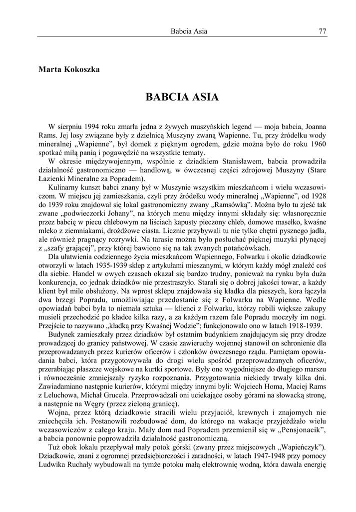 Babcia Asia 77 Marta Kokoszka BABCIA ASIA W sierpniu 1994 roku zmarła jedna z żywych muszyńskich legend — moja babcia, Joanna Rams. Jej losy związane były z dzielnicą Muszyny zwaną Wapienne. Tu, przy źródełku wody mineralnej „Wapienne”, był domek z pięknym ogrodem, gdzie można było do roku 1960 spotkać miłą panią i pogawędzić na wszystkie tematy. W okresie międzywojennym, wspólnie z dziadkiem Stanisławem, babcia prowadziła działalność gastronomiczno — handlową, w ówczesnej części zdrojowej Muszyny (Stare Łazienki Mineralne za Popradem). Kulinarny kunszt babci znany był w Muszynie wszystkim mieszkańcom i wielu wczasowiczom. W miejscu jej zamieszkania, czyli przy źródełku wody mineralnej „Wapienne”, od 1928 do 1939 roku znajdował się lokal gastronomiczny zwany „Ramsówką”. Można było tu zjeść tak zwane „podwieczorki Johany”, na których menu między innymi składały się: własnoręcznie przez babcię w piecu chlebowym na liściach kapusty pieczony chleb, domowe masełko, kwaśne mleko z ziemniakami, drożdżowe ciasta. Licznie przybywali tu nie tylko chętni pysznego jadła, ale również pragnący rozrywki. Na tarasie można było posłuchać pięknej muzyki płynącej z „szafy grającej”, przy której bawiono się na tak zwanych potańcówkach. Dla ułatwienia codziennego życia mieszkańcom Wapiennego, Folwarku i okolic dziadkowie otworzyli w latach 1935-1939 sklep z artykułami mieszanymi, w którym każdy mógł znaleźć coś dla siebie. Handel w owych czasach okazał się bardzo trudny, ponieważ na rynku była duża konkurencja, co jednak dziadków nie przestraszyło. Starali się o dobrej jakości towar, a każdy klient był mile obsłużony. Na wprost sklepu znajdowała się kładka dla pieszych, kora łączyła dwa brzegi Popradu, umożliwiając przedostanie się z Folwarku na Wapienne. Wedle opowiadań babci była to niemała sztuka — klienci z Folwarku, którzy robili większe zakupy musieli przechodzić po kładce kilka razy, a za każdym razem fale Popradu moczyły im nogi. Przejście to nazywano „kładką przy Kwaśnej Wodzie”; funkcjonowało ono w latach 1918-1939. Budynek zamieszkały przez dziadków był ostatnim budynkiem znajdującym się przy drodze prowadzącej do granicy państwowej. W czasie zawieruchy wojennej stanowił on schronienie dla przeprowadzanych przez kurierów oficerów i członków ówczesnego rządu. Pamiętam opowiadania babci, która przygotowywała do drogi wielu spośród przeprowadzanych oficerów, przerabiając płaszcze wojskowe na kurtki sportowe. Były one wygodniejsze do długiego marszu i równocześnie zmniejszały ryzyko rozpoznania. Przygotowania niekiedy trwały kilka dni. Zawiadamiano następnie kurierów, którymi między innymi byli: Wojciech Homa, Maciej Rams z Leluchowa, Michał Grucela. Przeprowadzali oni uciekające osoby górami na słowacką stronę, a następnie na Węgry (przez zieloną granicę). Wojna, przez którą dziadkowie stracili wielu przyjaciół, krewnych i znajomych nie zniechęciła ich. Postanowili rozbudować dom, do którego na wakacje przyjeżdżało wielu wczasowiczów z całego kraju. Mały dom nad Popradem przemienił się w „Pensjonacik”, a babcia ponownie poprowadziła działalność gastronomiczną. Tuż obok lokalu przepływał mały potok górski (zwany przez miejscowych „Wapieńczyk”). Dziadkowie, znani z ogromnej przedsiębiorczości i zaradności, w latach 1947-1948 przy pomocy Ludwika Ruchały wybudowali na tymże potoku małą elektrownię wodną, która dawała energię 78 Marta Kokoszka elektryczną dla pensjonatu. Była to duża wygoda dla przebywających tu turystów, ponieważ na Wapiennem nie było jeszcze założonej sieci elektrycznej. Ówcześnie to rozwiązanie techniczne było podziwiane przez wielu profesjonalistów i znawców z dziedziny energetyki. Powyżej elektrowni dziadkowie zbudowali młyn zbożowy zasilany energią wodną, z usług którego korzystało wiele gospodarstw. W mroźny dzień, 15 stycznia 1957 roku, na zawsze opuścił wszystkich dziadek, który umierając zostawił w smutku swoją żonę, jak również dwóch synów Bolesława i Henryka (Hendryka), krewnych i przyjaciół. Przeżył zaledwie 62 lata. Na pogrzeb przybyło wielu znajomych z Muszyny i nie tylko. U wszystkich pozostał w pamięci jako człowiek wielkiego czynu, prawości i skromności. Parę lat później kolejne kłopoty dotknęły domowników i sąsiadów domu nad Popradem, przy źródełku z doskonałą, leczniczą, wapienno-alkaliczną wodą. W środę, 10 sierpnia 1960 roku, około północy usłyszano ryk przestraszonego bydła, szum potoku, który nagle zmienił swój bieg i płynął teraz wprost na zabudowania babci Johany i moich rodziców, jak również huk przesuwających się w dół wałów ziemi. Tam, gdzie jeszcze wczoraj było gładko jak stół — teraz powstały w mgnieniu oka pagórki, uskoki i rozpadliska. Na środku podwórka wyrosła góra, zwały ziemi zniszczyły gospodarstwo nie tylko babci, ale również państwa Bocheńskich i Tokarczyków. Ta noc dla wielu mieszkańców Wapiennego była koszmarem. Wały ziemi wędrowały w dół jeszcze przez cały czwartek i piątek. Akcja ratownicza nie dała rezultatów. Próbowano ziemię odrzucać, aby uratować gospodarstwa, przybywało jej jednak sto razy więcej. Po trzech dniach góra „zahamowała”. Była to wielka ulga! Po latach często babcia zabierała mnie na spacer do źródełka i opowiadała o tych trzech niezwykłych dniach. W długie zimowe wieczory lubiłam słuchać wspomnień babci, która opowiadała o minionych wydarzeniach ze wszystkimi szczegółami. Mówiła zawsze tak ciekawie, a równocześnie z humorem! Wspominała rodzinę, a także przyjaciół, którzy pozostali w jej pamięci. Gdy odwiedził ją ktoś ze znajomych zawsze było wesoło, a wspomnienia o innych były ujęte w anegdotyczne powiedzonka, na przykład: „...
