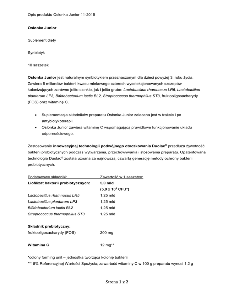 Opis produktu Osłonka Junior 11-2015 Osłonka Junior Suplement diety Synbiotyk 10 saszetek Osłonka Junior jest naturalnym synbiotykiem przeznaczonym dla dzieci powyżej 3. roku życia. Zawiera 5 miliardów bakterii kwasu mlekowego czterech wyselekcjonowanych szczepów kolonizujących zarówno jelito cienkie, jak i jelito grube: Lactobacillus rhamnosus LR5, Lactobacillus plantarum LP3, Bifidobacterium lactis BL2, Streptococcus thermophilus ST3, fruktooligosacharydy (FOS) oraz witaminę C. • Suplementacja składników preparatu Osłonka Junior zalecana jest w trakcie i po antybiotykoterapii. • Osłonka Junior zawiera witaminę C wspomagającą prawidłowe funkcjonowanie układu odpornościowego. Zastosowanie innowacyjnej technologii podwójnego otoczkowania Duolac® przedłuża żywotność bakterii probiotycznych podczas wytwarzania, przechowywania i stosowania preparatu. Opatentowana technologia Duolac® została uznana za najnowszą, czwartą generację metody ochrony bakterii probiotycznych. Podstawowe składniki: Zawartość w 1 saszetce: Liofilizat bakterii probiotycznych: 5,0 mld (5,0 x 109 CFU*) Lactobacillus rhamnosus LR5 1,25 mld Lactobacillus plantarum LP3 1,25 mld Bifidobacterium lactis BL2 1,25 mld Streptococcus thermophilus ST3 1,25 mld Składnik prebiotyczny: fruktooligosacharydy (FOS) 200 mg Witamina C 12 mg** *colony forming unit – jednostka tworząca kolonię bakterii **15% Referencyjnej Wartości Spożycia; zawartość witaminy C w 100 g preparatu wynosi 1,2 g Strona 1 z 2 Opis produktu Osłonka Junior 11-2015 Składniki: maltoza; fruktooligosacharydy; maltodekstryna; Bifidobacterium lactis BL2; Lactobacillus plantarum LP3; Lactobacillus rhamnosus LR5; Streptococcus thermophilus ST3; kwas L-askorbinowy (witamina C). Zalecane dzienne spożycie: 1 saszetka raz dziennie. Preparat przeznaczony jest dla dorosłych i dzieci powyżej 3. roku życia. Nie należy przekraczać zalecanej dziennej porcji do spożycia. Preparat zaleca się przyjmować jeszcze przez kilka dni po antybiotykoterapii. Suplementy diety nie mogą być stosowane jako substytut zróżnicowanej diety. Zrównoważony sposób żywienia i zdrowy tryb życia są ważne dla utrzymania prawidłowego stanu zdrowia. Sposób podania: Zawartość saszetki najlepiej spożyć po uprzednim wymieszaniu z niewielką ilością letniej wody, mleka lub jogurtu. Przechowywanie: Przechowywać w suchym miejscu, w temperaturze poniżej 25○C, w sposób niedostępny dla małych dzieci. Dystrybutor: Apotex Nederland B.V. Archimedesweg 2 2333 CN Leiden Holandia Informacji o preparacie udziela: Apotex Polska Sp. z o.o. ul. Ostrobramska 95 04 - 118 Warszawa tel.: (22) 311 20 00 www.apotex.pl, www.oslonka.com Strona 2 z 2