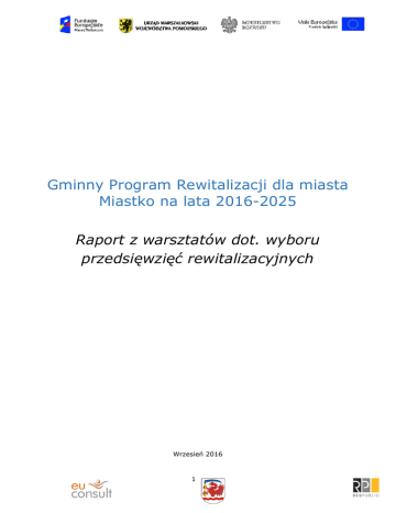 Gminny Program Rewitalizacji dla miasta Miastko na lata 2016-2025 Raport z warsztatów dot. wyboru przedsięwzięć rewitalizacyjnych Wrzesień 2016 1 1. Informacje o spotkaniach Warsztaty dot. wyboru przedsięwzięć rewitalizacyjnych z przedstawicielami Urzędu Miejskiego, jednostkami organizacyjnymi, PUP, NGO, przedsiębiorcami Termin: 14, 20 i 27 września 2016 roku o godz. 17.00 Miejsce: Centrum Informacji Turystycznej w Miastku, ul. Dworcowa 29 Uczestnicy: w warsztatach wzięło udział odpowiednio 7, 4 i 5 osób zgodnie z załączonymi listami Spacer dot. wyboru przedsięwzięć rewitalizacyjnych z mieszkańcami Termin: 21 września 2016 roku o godz. 17.00 Miejsce rozpoczęcia spaceru: parking przed kościołem pw. NMP Wspomożenia Wiernych Uczestnicy: w warsztatach wzięło udział 11 osób Warsztaty dot. wyboru przedsięwzięć rewitalizacyjnych z mieszkańcami Termin: 28 września 2016 roku o godz. 17.00 Miejsce: Centrum Informacji Turystycznej w Miastku, ul. Dworcowa 29 Uczestnicy: w warsztatach wzięły udział 4 osoby zgodnie z załączoną listą Moderator: Michał Majek, Daria Cherek Przebieg spotkań: Podczas spotkania 14.09.2016 r. zostały podsumowane wyniki poprzednich spotkań – problemy, mocne strony i potencjały. Następnie uczestnikom została przedstawiona struktura rezultatów, jaka zostanie zastosowana w Programie Rewitalizacji. Uczestnicy zostali zapoznani z definicją wizji i celów rewitalizacji. Kolejna część spotkania miała formę warsztatową – zadaniem uczestników było określenie wizji do rewitalizacji oraz określenie celów rewitalizacji w podsystemie społecznym, gospodarczym i przestrzennym. Spotkania 20-27.09.2016 r. poświęcone były wypracowaniu działań rewitalizacyjnych w poszczególnych podsystemach, które stanowić będą uszczegółowienie celów. Uczestnikom zostały także przedstawione projekty zgłoszone do Urzędu Marszałkowskiego jako potencjalne projekty realizowane w ramach Programu Rewitalizacji. 21.09.2016 r. został przeprowadzony spacer na aktualnie zamkniętym obszarze. Uczestnikom spaceru zostały zaprezentowane propozycje działań związanych z rozwojem usług społecznych, które na tym obszarze są planowane do realizacji. Warsztat 28.09.2016 r. miał podobny przebieg do warsztatów w dniach 20 i 27.09.2016 r. Dodatkowo uczestnikom zostały przedstawione dobre praktyki rewitalizacyjne oraz typy projektów, które mogą być realizowane w ramach poddziałania 6.2.2. Rozwój usług społecznych Regionalnego Programu Operacyjnego Województwa Pomorskiego. 2 2. Wyniki prac warsztatowych 2.1. Wizja (pożądane części składowe) 1) Obszar rewitalizacji -> nowe centrum miasta 2) Wizytówka miasta 3) Funkcjonalne 4) Łączy funkcje mieszkalne z rekreacją i usługami 5) Nowoczesność na równi z walorami naturalnymi 6) Zaangażowanie interesariuszy 7) Integracja pokoleń 8) Bezpieczeństwo 9) Zmodernizowane (znikną stare budynki) 10) Interesujące (nowe miejsca spędzania czasu wolnego, miejsca spotkań) 11) Zlokalizowanie infrastruktury społecznej w jednym miejscu 12) Miejsce „tętniące życiem” 13) Baza lokali usługowo-handlowych 14) Infrastruktura dla społeczeństwa wielopokoleniowego (siłownie, place zabaw, ścieżki rowerowe itp.) 15) Przyciągnięcie inwestorów 16) Miasto uniwersalne – dla wszystkich 17) „Miastko – Brama do natury” – wizja komplementarna do hasła Miastka 18) Turystyka 2.2. Cele Społeczne: 1) aktywność zawodowa mieszkańców a. punkty handlowo-usługowe b. przyciągnięcie inwestorów za pomocą nowopowstałej infrastruktury c. zaangażowanie mieszkańców 2) status materialny mieszkańców a. aktywizacja zawodowa osób wykluczonych społecznie b. promocja pracy jako wartości c. budowanie tożsamości lokalnej 3) poziom bezpieczeństwa a. oświetlenie b. centrum monitoringu 4) poziom edukacji a. podstawą dokształcania się jest stabilność zatrudnienia b. warsztaty, szkolenia oraz pozostałe formy zdobywania kwalifikacji przez osoby bezrobotne (organizowane przez PUP) 5) stopień aktywności mieszkańców w życiu publicznym i kulturalnym a. aktywizacja osób starszych b. „ogródki” -> miejsca dziennego pobytu osób seniorów, forma aktywizacji osób starszych c. wykorzystanie potencjału centrum miasta d. Uniwersytet III Wieku e. Wymiana doświadczeń (nauka rękodzieła przez os. starsze) 6) poziom kapitału społecznego, w tym zaufania w społeczeństwie a. Zaangażowanie społeczności lokalnej, partycypacja społeczna – „oddanie głosu” 3 b. Inicjatywy oddolne mieszkańców Gospodarcze: 1) poziom przedsiębiorczości mieszkańców a. dotacje/ dofinasowania b. kampanie informacyjne o możliwościach założenia firmy c. spotkania z praktykami, przedstawicielami ZUS, US d. szkolenia 2) kondycja przedsiębiorstw a. pomoc przy promocji lokalnych towarów i usług b. zmniejszenie podatków (preferencyjne warunki prowadzenia działalności) c. informacje nt. możliwości pozyskania dodatkowych środków 3) liczba lokali usługowych, sklepów a. preferencyjne warunki dla osób, które już prowadzą lokale usługowe i sklepy b. infrastruktura (dojazdowa, nowe punkty do wynajęcia c. system zachęt 4) dodatkowe: a. cykliczne imprezy turystyczne b. atrakcje turystyczne – kolonie itp. c. stworzenie zintegrowanej informacji turystycznej d. nawiązanie współpracy z organizacjami wspierającymi turystykę e. wsparcie dla NGO: centrum organizacji pozarządowych; pomoc księgowej, pomoc sprawozdawcza lub w pisaniu wniosków f. ułatwienie dostępu do inwestycji dla potencjalnych inwestorów g. przyciągnięcie Przestrzenne: 1) 2) 3) 4) Bezpieczne ciągi komunikacyjne. Bezpieczeństwo pieszych. Apteka i przychodnia (podstawowa opieka zdrowotna). Podjazdy dla wózków i ułatwienia dla niepełnosprawnych (i starszych) w budynkach infrastruktury społecznej. 5) Zagospodarowanie terenów po byłej fabryce. 6) Wykorzystanie potencjału terenów znajdujących się pr