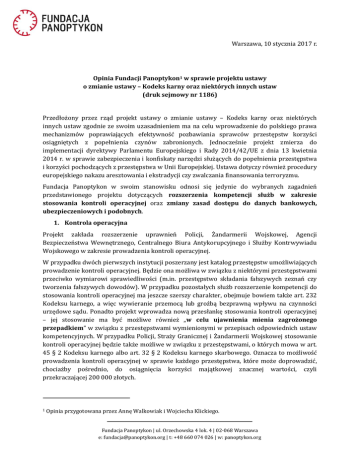 Warszawa, 10 stycznia 2017 r. Opinia Fundacji Panoptykon1 w sprawie projektu ustawy o zmianie ustawy – Kodeks karny oraz niektórych innych ustaw (druk sejmowy nr 1186) Przedłożony przez rząd projekt ustawy o zmianie ustawy – Kodeks karny oraz niektórych innych ustaw zgodnie ze swoim uzasadnieniem ma na celu wprowadzenie do polskiego prawa mechanizmów poprawiających efektywność pozbawiania sprawców przestępstw korzyści osiągniętych z popełnienia czynów zabronionych. Jednocześnie projekt zmierza do implementacji dyrektywy Parlamentu Europejskiego i Rady 2014/42/UE z dnia 13 kwietnia 2014 r. w sprawie zabezpieczenia i konfiskaty narzędzi służących do popełnienia przestępstwa i korzyści pochodzących z przestępstwa w Unii Europejskiej. Ustawa dotyczy również procedury europejskiego nakazu aresztowania i ekstradycji czy zwalczania finansowania terroryzmu. Fundacja Panoptykon w swoim stanowisku odnosi się jedynie do wybranych zagadnień przedstawionego projektu dotyczących rozszerzenia kompetencji służb w zakresie stosowania kontroli operacyjnej oraz zmiany zasad dostępu do danych bankowych, ubezpieczeniowych i podobnych. 1. Kontrola operacyjna Projekt zakłada rozszerzenie uprawnień Policji, Żandarmerii Wojskowej, Agencji Bezpieczeństwa Wewnętrznego, Centralnego Biura Antykorupcyjnego i Służby Kontrwywiadu Wojskowego w zakresie prowadzenia kontroli operacyjnej. W przypadku dwóch pierwszych instytucji poszerzany jest katalog przestępstw umożliwiających prowadzenie kontroli operacyjnej. Będzie ona możliwa w związku z niektórymi przestępstwami przeciwko wymiarowi sprawiedliwości (m.in. przestępstwo składania fałszywych zeznań czy tworzenia fałszywych dowodów). W przypadku pozostałych służb rozszerzenie kompetencji do stosowania kontroli operacyjnej ma jeszcze szerszy charakter, obejmuje bowiem także art. 232 Kodeksu karnego, a więc wywieranie przemocą lub groźbą bezprawną wpływu na czynności urzędowe sądu. Ponadto projekt wprowadza nową przesłankę stosowania kontroli operacyjnej – jej stosowanie ma być możliwe również „w celu ujawnienia mienia zagrożonego przepadkiem” w związku z przestępstwami wymienionymi w przepisach odpowiednich ustaw kompetencyjnych. W przypadku Policji, Straży Granicznej i Żandarmerii Wojskowej stosowanie kontroli operacyjnej będzie także możliwe w związku z przestępstwami, o których mowa w art. 45 § 2 Kodeksu karnego albo art. 32 § 2 Kodeksu karnego skarbowego. Oznacza to możliwość prowadzenia kontroli operacyjnej w sprawie każdego przestępstwa, które może doprowadzić, chociażby pośrednio, do osiągnięcia korzyści majątkowej znacznej wartości, czyli przekraczającej 200 000 złotych. 1 Opinia przygotowana przez Annę Walkowiak i Wojciecha Klickiego. Fundacja Panoptykon | ul. Orzechowska 4 lok. 4 | 02-068 Warszawa e: [email protected] | t: +48 660 074 026 | w: panoptykon.org Naszym zdaniem zawarta w projekcie propozycja jest nie do zaakceptowania na gruncie Konstytucji Rzeczpospolitej Polskiej. Przede wszystkim należy przypomnieć, że kontrola operacyjna – jako najgłębiej ingerujące w prawo do prywatności uprawnienie Policji i służb specjalnych powinna być stosowana absolutnie wyjątkowo. Z orzecznictwa Trybunału Konstytucyjnego2 wynika, że „ustawodawca zobowiązany jest zdefiniować zamknięty i możliwie wąski katalog przestępstw uzasadniających naruszenie prywatności. Na podstawie brzmienia przepisu ustawy upoważniającego do inwigilacji jednostka ma wiedzieć, jakie zachowania narażają ją na prowadzenie czynności operacyjno-rozpoznawczych”3. Tymczasem wprowadzenie możliwości prowadzenia kontroli operacyjnej w celu ujawnienia mienia zagrożonego przepadkiem, a zwłaszcza w związku z przestępstwami, o których mowa w art. 45 § 2 Kodeksu karnego oznacza zniesienie precyzyjnie wyznaczonego dotychczas podziału na tzw. przestępstwa katalogowe i nie-katalogowe. Policja i inne służby będą miały możliwość prowadzenia kontroli operacyjnej np. w związku z występkami wiążącymi się z możliwością odniesienia korzyści majątkowej znacznej wartości (kradzież czy przywłaszczanie). Co więcej, biorąc pod uwagę uzupełnienie okoliczności uzasadniających prowadzenie kontroli operacyjnej, (wśród których jest m.in. zapobieganie) o ujawnienie mienia zagrożonego przepadkiem, na podstawie proponowanych przepisów jednostka nie ma szans dowiedzieć się, jakie zachowania narażają ją nie tylko na ewentualną odpowiedzialność karną, lecz również umożliwią prowadzenie w stosunku do niej czynności operacyjno-rozpoznawczych, głęboko ingerujących w jej prywatność. Obok uwag dotyczących braku określoności przepisów zawartych w projekcie, stanowczo podkreślamy, że projekt oraz jego uzasadnienie nie wykazują niezbędności poszerzenia uprawnień Policji i innych służb w zakresie możliwości prowadzenia kontroli operacyjnej. Podsumowując tę część, zwracamy uwagę, że Europejski Trybunał Praw Człowieka w wyroku z 8 stycznia 2013 r. w sprawie Bucur i Toma przeciwko Rumunii uznał, że tajna kontrola mająca chronić bezpieczeństwo państwa, niesie za sobą ryzyko podkopania lub nawet zniszczenia demokracji. Naszym zdaniem projekt – analizowany zwłaszcza w kontekście innych zmian w obszarze polityki bezpieczeństwa4 – stanowi kolejny krok w kierunku wskazanym przez ETPC. 2. Dostęp do tajemnicy bankowej, ubezpieczeniowej i innych danych finansowych Projekt w zasadniczy sposób zmienia zasady dostępu Policji oraz Żandarmerii Wojskowej do danych stanowiących tajemnicę bankową, skarbową lub inne tajemnice zawodowe, o których mowa m.in. w ustawie o giełdach towarowych, ustawie o funduszach inwestycyjnych Por. wyrok Trybunału Konstytucyjnego z 30 lipca 2014 r., sygn. akt K 23/11. M. Safjan, L. Bosek (red.), Konstytucja. Komentarz, t. I, Warszawa 2016. 4 Warto przede wszystkim zwrócić uwagę 