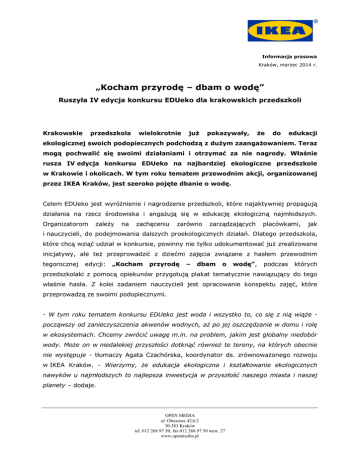 Informacja prasowa Kraków, marzec 2014 r. „Kocham przyrodę – dbam o wodę” Ruszyła IV edycja konkursu EDUeko dla krakowskich przedszkoli Krakowskie przedszkola wielokrotnie już pokazywały, że do edukacji ekologicznej swoich podopiecznych podchodzą z dużym zaangażowaniem. Teraz mogą pochwalić się swoimi działaniami i otrzymać za nie nagrody. Właśnie rusza IV edycja konkursu EDUeko na najbardziej ekologiczne przedszkole w Krakowie i okolicach. W tym roku tematem przewodnim akcji, organizowanej przez IKEA Kraków, jest szeroko pojęte dbanie o wodę. Celem EDUeko jest wyróżnienie i nagrodzenie przedszkoli, które najaktywniej propagują działania na rzecz środowiska i angażują się w edukację ekologiczną najmłodszych. Organizatorom zależy na zachęceniu zarówno zarządzających placówkami, jak i nauczycieli, do podejmowania dalszych proekologicznych działań. Dlatego przedszkola, które chcą wziąć udział w konkursie, powinny nie tylko udokumentować już zrealizowane inicjatywy, ale też przeprowadzić z dziećmi zajęcia związane z hasłem przewodnim tegorocznej edycji: „Kocham przyrodę – dbam o wodę”, podczas których przedszkolaki z pomocą opiekunów przygotują plakat tematycznie nawiązujący do tego właśnie hasła. Z kolei zadaniem nauczycieli jest opracowanie konspektu zajęć, które przeprowadzą ze swoimi podopiecznymi. - W tym roku tematem konkursu EDUeko jest woda i wszystko to, co się z nią wiąże począwszy od zanieczyszczenia akwenów wodnych, aż po jej oszczędzanie w domu i rolę w ekosystemach. Chcemy zwrócić uwagę m.in. na problem, jakim jest globalny niedobór wody. Może on w niedalekiej przyszłości dotknąć również te tereny, na których obecnie nie występuje - tłumaczy Agata Czachórska, koordynator ds. zrównoważonego rozwoju w IKEA Kraków. - Wierzymy, że edukacja ekologiczna i kształtowanie ekologicznych nawyków u najmłodszych to najlepsza inwestycja w przyszłość naszego miasta i naszej planety – dodaje. OPEN MEDIA ul. Obozowa 42A/2 30-383 Kraków tel. 012 268 97 50, fax 012 268 97 50 wew. 27 www.openmedia.pl Nagrody w konkursie EDUeko Zwycięskie przedszkole otrzyma tytuł najbardziej ekologicznego w Krakowie oraz bon zakupowy wyposażenie, o wartości do 3 tys. zrealizowania w zł na IKEA Kraków. Kolejne dwie wyróżnione placówki odbiorą bony po 1 tys. zł. Ponadto grupy przedszkolaków -laureatów z nagrodzonych przedszkoli wezmą udział w przygotowanych specjalnie dla nich zajęciach ekologicznych w krakowskiej IKEA. Nagrody przyznane zostaną też w dwóch dodatkowych kategoriach, niezależnych od wyników konkursu głównego. W tzw. „głosowaniu publiczności” pracownicy IKEA Kraków wybiorą cztery najciekawsze ich zdaniem plakaty, za które dzieci otrzymają zabawki z asortymentu IKEA Kraków o łącznej wartości 1000 zł. Nagrodzeni zostaną również autorzy 3 najlepszych konspektów zajęć nawiązujących do hasła „Kocham przyrodę – dbam o wodę”. Na wszystkich małych uczestników konkursu czekają również drobne nagrody pocieszenia oraz pamiątkowe dyplomy. Szczegóły konkursu oraz regulamin z formularzem zgłoszeniowym dostępne są na: www.IKEA.pl/Krakow przez cały okres trwania akcji. Dodatkowych informacji udzielają: Agata Czachórska, IKEA Kraków tel. 12 293 11 45, [email protected] Agnieszka Dźwigoń, Open Media Public Relations tel. 698 618 575, e-mail: [email protected] Przemysław Pawluś, Open Media Public Relations tel. 608 642 583, e-mail: [email protected] OPEN MEDIA ul. Obozowa 42A/2 30-383 Kraków tel. 012 268 97 50, fax 012 268 97 50 wew. 27 www.openmedia.pl IKEA Kraków od lat aktywnie angażuje się w działania proekologiczne. W sklepie wprowadzono innowacje związane ze zmniejszeniem energochłonności budynku, a Klientom pokazano szereg rozwiązań pozwalających na ekologiczne i oszczędne życie w domu. IKEA Kraków zachęca również swoich pracowników do angażowania się w kwestie proekologiczne oraz prowadzi wiele działań edukacyjnych kierowanych do najmłodszych, w tym autorski program: ekolekcje. IKEA Kraków istnieje od 1998 roku. We wrześniu 2011 roku zakończyła się przebudowa sklepu, po której IKEA Kraków stała się jednym z najnowocześniejszych sklepów IKEA w Polsce. Nowa IKEA Kraków oferuje klientom ponad 9 tys. produktów, 64 inspirujące wnętrza, przestronną restaurację na 500 miejsc siedzących z bezpłatnym dostępem do Internetu, miejscem dla karmiącej mamy oraz strefą zabawy dla najmłodszych, a także bezpłatną bawialnię „Czarodziejski Las Smaland” z profesjonalną opieką dla dzieci w wieku 3-10 lat. Nazwa marki IKEA to akronim – skrót utworzony z pierwszych liter imienia, nazwiska oraz nazw farmy i parafii, skąd pochodzi założyciel firmy (Ingvar Kamprad Elmtaryd Agunnaryd). OPEN MEDIA ul. Obozowa 42A/2 30-383 Kraków tel. 012 268 97 50, fax 012 268 97 50 wew. 27 www.openmedia.pl