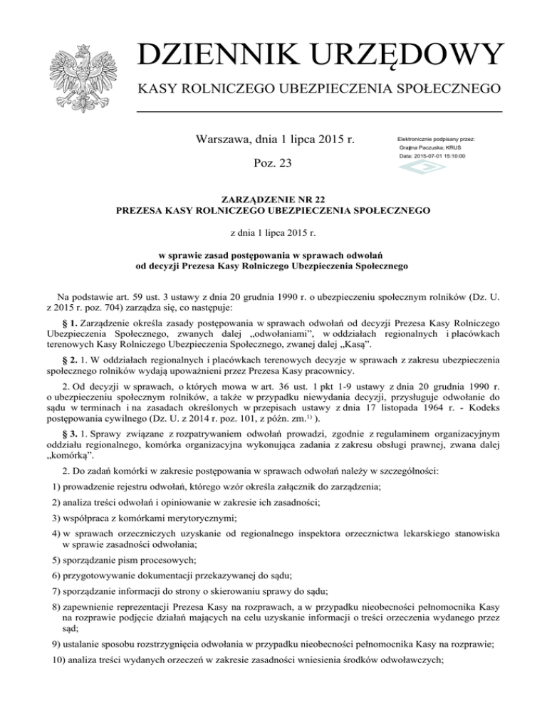 DZIENNIK URZĘDOWY KASY ROLNICZEGO UBEZPIECZENIA SPOŁECZNEGO Warszawa, dnia 1 lipca 2015 r. Elektronicznie podpisany przez: Grażyna Paczuska; KRUS Poz. 23 Data: 2015-07-01 15:10:00 ZARZĄDZENIE NR 22 PREZESA KASY ROLNICZEGO UBEZPIECZENIA SPOŁECZNEGO z dnia 1 lipca 2015 r. w sprawie zasad postępowania w sprawach odwołań od decyzji Prezesa Kasy Rolniczego Ubezpieczenia Społecznego Na podstawie art. 59 ust. 3 ustawy z dnia 20 grudnia 1990 r. o ubezpieczeniu społecznym rolników (Dz. U. z 2015 r. poz. 704) zarządza się, co następuje: § 1. Zarządzenie określa zasady postępowania w sprawach odwołań od decyzji Prezesa Kasy Rolniczego Ubezpieczenia Społecznego, zwanych dalej „odwołaniami”, w oddziałach regionalnych i placówkach terenowych Kasy Rolniczego Ubezpieczenia Społecznego, zwanej dalej „Kasą”. § 2. 1. W oddziałach regionalnych i placówkach terenowych decyzje w sprawach z zakresu ubezpieczenia społecznego rolników wydają upoważnieni przez Prezesa Kasy pracownicy. 2. Od decyzji w sprawach, o których mowa w art. 36 ust. 1 pkt 1-9 ustawy z dnia 20 grudnia 1990 r. o ubezpieczeniu społecznym rolników, a także w przypadku niewydania decyzji, przysługuje odwołanie do sądu w terminach i na zasadach określonych w przepisach ustawy z dnia 17 listopada 1964 r. - Kodeks postępowania cywilnego (Dz. U. z 2014 r. poz. 101, z późn. zm.1) ). § 3. 1. Sprawy związane z rozpatrywaniem odwołań prowadzi, zgodnie z regulaminem organizacyjnym oddziału regionalnego, komórka organizacyjna wykonująca zadania z zakresu obsługi prawnej, zwana dalej „komórką”. 2. Do zadań komórki w zakresie postępowania w sprawach odwołań należy w szczególności: 1) prowadzenie rejestru odwołań, którego wzór określa załącznik do zarządzenia; 2) analiza treści odwołań i opiniowanie w zakresie ich zasadności; 3) współpraca z komórkami merytorycznymi; 4) w sprawach orzeczniczych uzyskanie od regionalnego inspektora orzecznictwa lekarskiego stanowiska w sprawie zasadności odwołania; 5) sporządzanie pism procesowych; 6) przygotowywanie dokumentacji przekazywanej do sądu; 7) sporządzanie informacji do strony o skierowaniu sprawy do sądu; 8) zapewnienie reprezentacji Prezesa Kasy na rozprawach, a w przypadku nieobecności pełnomocnika Kasy na rozprawie podjęcie działań mających na celu uzyskanie informacji o treści orzeczenia wydanego przez sąd; 9) ustalanie sposobu rozstrzygnięcia odwołania w przypadku nieobecności pełnomocnika Kasy na rozprawie; 10) analiza treści wydanych orzeczeń w zakresie zasadności wniesienia środków odwoławczych; Dziennik Urzędowy KRUS –2– Poz. 23 11) przekazywanie wyroków właściwej komórce merytorycznej w celu terminowego jego wykonania; 12) analiza treści wydanych orzeczeń w zakresie prawidłowości pracy właściwych komórek merytorycznych oddziałów regionalnych i placówek terenowych oraz przedstawianie jej wyników dyrektorowi oddziału regionalnego. § 4. 1. Placówka terenowa, w której nie ma komórki, o której mowa w § 3 ust. 1, przekazuje odwołanie, akta sprawy wraz ze stanowiskiem w sprawie odwołania do właściwego oddziału regionalnego lub placówki terenowej, której Prezes Kasy powierzył wykonywanie niektórych zadań, bez zbędnej zwłoki, ale nie później niż w terminie 5 dni od dnia wpływu odwołania do placówki terenowej. 2. Jeżeli odwołanie nie dotyczy decyzji wydanej przez dany oddział regionalny lub placówkę terenową odwołanie przekazuje się niezwłocznie, nie później niż w terminie 3 dni, do właściwego oddziału regionalnego lub placówki terenowej. § 5. 1. Komórka,bez zbędnej zwłoki, nie później niż w terminie 30 dni od daty wpływu odwołania do Kasy szczegółowo je rozpatruje i przygotowuje w porozumieniu z właściwą komórką merytoryczną stanowisko w sprawie zasadności odwołania. 2. W przypadku uznania odwołania: 1) za nieuzasadnione w całości, odwołanie przekazuje się wraz z aktami sprawy do sądu pierwszej instancji; 2) w całości za uzasadnione, zmienia się lub uchyla się zaskarżoną decyzję; decyzję przesyła się stronie, a odwołaniu nie nadaje dalszego biegu. W przypadku gdy odwołanie zostało przekazane za pośrednictwem sądu pierwszej instancji, sprawę kieruje się do sądu pierwszej instancji z wnioskiem o umorzenie postępowania lub informuje się o sposobie załatwienia sprawy; 3) częściowo za uzasadnione, zmienia się lub uchyla się zaskarżoną decyzję w części. Stronie przesyła się decyzję wraz z informacją w jakim zakresie uwzględniono jej odwołanie, w pozostałej części odwołanie wraz z aktami sprawy i uzasadnieniem przekazuje się do sądu pierwszej instancji. § 6. 1. Prezesa Kasy w postępowaniu sądowym reprezentuje osoba przez niego upoważniona, zwana dalej „pełnomocnikiem”. Prezes Kasy może upoważnić dyrektora oddziału regionalnego do reprezentowania Prezesa Kasy w postępowaniu sądowym z prawem wydawania w tym zakresie dalszych pełnomocnictw pracownikom oddziału regionalnego i placówki terenowej. 2. Pełnomocnik w szczególności sporządza pisma procesowe, uczestniczy w rozprawach, zgłasza wnioski dowodowe oraz sporządza informacje o treści wydanego orzeczenia. 3. W sprawach, w których biegły sądowy z zakresu medycyny wyraził opinię odmienną od orzeczenia organu orzekającego Kasy, pełnomocnik obowiązany jest każdorazowo przed rozprawą uzyskać pisemną opinię lekarza regionalnego inspektora orzecznictwa lekarskiego, do wykorzystania jej w dalszym postępowaniu przed sądem. § 7. 1. Pismo procesowe sporządza się zgodnie z wymogami formalnymi określonymi w przepisach ustawy z dnia 17 listopada 1964 r. - Kodeks postępowania cywilnego. 2. W przypadku odwołania od decyzji Prezesa Kasy dotyczącej prawa do świadczeń w zbiegu, w piśmie procesowym wnioskuje się o wezwanie do udziału w postępowaniu właściwego organu rentowego. § 8. 1. Po ogłoszen
