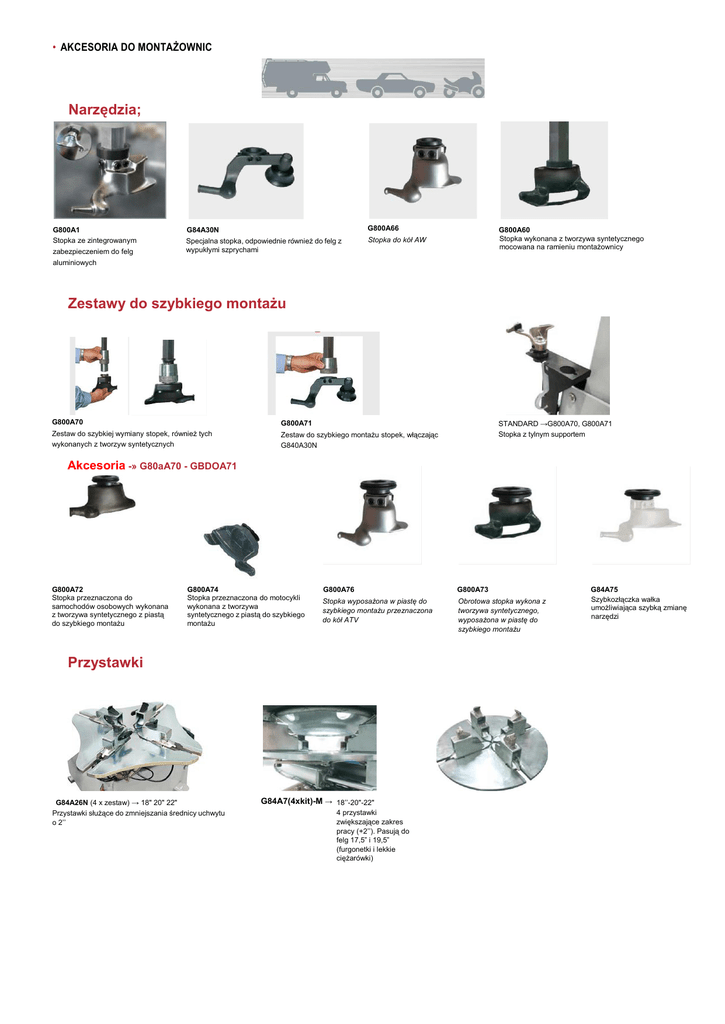 • AKCESORIA DO MONTAŻOWNIC Narzędzia; G800A1 Stopka ze zintegrowanym zabezpieczeniem do felg G84A30N G800A66 Specjalna stopka, odpowiednie również do felg z wypukłymi szprychami Stopka do kół AW G800A60 Stopka wykonana z tworzywa syntetycznego mocowana na ramieniu montażownicy aluminiowych Zestawy do szybkiego montażu G800A70 G800A71 Zestaw do szybkiej wymiany stopek, również tych wykonanych z tworzyw syntetycznych Zestaw do szybkiego montażu stopek, włączając G840A30N STANDARD →G800A70, G800A71 Stopka z tylnym supportem Akcesoria -» G80aA70 - GBDOA71 G800A72 Stopka przeznaczona do samochodów osobowych wykonana z tworzywa syntetycznego z piastą do szybkiego montażu G800A74 Stopka przeznaczona do motocykli wykonana z tworzywa syntetycznego z piastą do szybkiego montażu G800A76 G800A73 Stopka wyposażona w piastę do szybkiego montażu przeznaczona do kół ATV Obrotowa stopka wykona z tworzywa syntetycznego, wyposażona w piastę do szybkiego montażu Przystawki G84A26N (4 x zestaw) → 18" 20" 22" Przystawki służące do zmniejszania średnicy uchwytu o 2’’ G84A7(4xkit)-M → 18’’-20"-22" 4 przystawki zwiększające zakres pracy (+2’’). Pasują do felg 17,5” i 19,5” (furgonetki i lekkie ciężarówki) G84A75 Szybkozłączka wałka umożliwiająca szybką zmianę narzędzi Ochraniacze* 10"-18" / 10"-20" / 11"-22" G800A5(4xkit)-M8"20"22" Zestaw osłon do zacisków G800A5K-Zestaw10xG800A5 G800A6 (4 x kit) ^ 24" 26" 28" G800A7(4xzestaw)-»30" Zestaw osłon zacisków G800A7K-Zestaw10xG800A 7 Zestaw osłon do zacisków G800A6K-Zestaw10xG800A6 G800A54 (4 x zestaw) -»G800A7 Zestaw osłon zacisków wewnętrznych G800A54K-Zestaw10xG800A54 10"-24"/10"-26"/10"-28" (2 Pozycje) STANDARD Antypoślizgowa wkładka wykonana z tworzywa syntetycznego 8" -30" (4 Pozycje) * G800A8 (2 x zestaw) Zestaw osłon G84A17 (2 x zestaw) →G84A30N Zestaw osłon G800A8K-Zestaw10xG800A8 G800A17K- Zestaw 10xG800A17 G800A32 G800A11 G800A100 Osłona krawędzi zbijaka Osłona chroniąca operatora podczas zbijania oraz pompowania. Przeznaczona do montażownic wyposażonych w obrotowe ramię. G800A11K - Zestaw 5 x G800A11 G1000A13K (50x zestaw)-» G1000A52 - G1000A11 Osłona stopki opon typu Run Flat Zestaw osłon dźwigni zbijaka G1000A115(-»WDK) Ogranicznik posuwu zbijaka Uzdatnianie powietrza G84A16 G80A1 G80A1R G800A13 Smarownik Filtr Filtr z redukcją ciśnienia Reduktor ciśnienia LEGENDA: Zapoznaj się z cennikiem produktów zawierającym szczegóły dotyczące produktów Montaż fabryczny Urządzenia bez dźwigni G800A81 G800A82 G800A87 Do montażownic z bocznym odchyłem ramienia G800A83 G800A84 G800A85 Do montażownic z automatycznym odchyłem ramienia do tyłu Różne G800A35 Pneumatyczne unoszenie koła. G800A26 - G800A94 - G800A95 Nasadka zbijaka montowana ukośnie G800A77 Szafka oraz uchwyt szafki . G1000A52 Łyżka montażowa G800A27 Zbijak z podwójnym systemem kontroli (pedał oraz przycisk umieszczony na dźwigni). G1000A11 Łyżka montażowa model Butler z osłoną G800A63 - G800A56 - G800A68 Pneumatycznie sterowany ruch urządzenia. G800A37 (3,5 k g / 8 l b ) Pasta montażowa Uwaga: 8 x karton 160 x paleta . G800A38 Pędzel I Pompowanie G84A1 Pistolet do pompowania G800A57 Sterowane za pomocą pedału urządzenie do pompowania wyposażone w manometr oraz zawór redukcji ciśnienia. G84A14N Zestaw do pompowania CE (pistolet+ zawór redukcji ciśnienia). G84A2 Inflator z opatentowaną końcówką Pistolet do pompowania Michelin. G84A15N Zestaw do szybkiego pompowania Michelin CE ( pistolet+ zawór redukcji ciśnienia). G800A80 → G800A57 Inflator do montażownic wyposażonych w automat do pompowania. Motocykle G84A21(4xzestaw)→18"20"22" G84A34(4xzestaw)→ 26"28" G84A5(4xzestaw)→18"20"22" Zaciski mocowane na sztywno do kół motocyklowych (+ 5" z zewnętrznej strony). Zaciski do szybkiego montażu przeznaczone do kół motocyklowych (+5" z zewnętrznej strony). G84A29 (4 x zestaw) → G84A5, G84A21, G84A34 Przystawki zwiększające średnicę uchwytu mocowanego koła (+ 2" z zewnętrznej strony). Griffes pour roues de moto avec montage mobile f+5" de I'exterieur). Garras para ruedas de moto con montaje movil (+5" del exterior). **. G84A24 (4 x zestaw) → G84A5, G84A21, G84A34 Przystawki zmniejszające średnicę uchwytu mocowanego koła (-2" z zewnętrznej strony). G800A78 Przystawka zbijaka do kół motocyklowych.