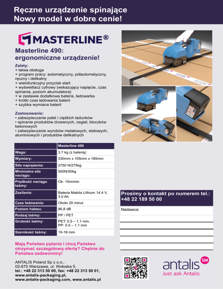 Ręczne urządzenie spinające Nowy model w dobre cenie! Masterline 490: ergonomiczne urządzenie! Zalety: + łatwa obsługa + program pracy: automatyczny, półautomatyczny, ręczny i delikatny + wielofunkcyjny przycisk start + wyświetlacz cyfrowy (wskazujący napięcie, czas spinania, poziom akumulatora) + w zestawie dodatkowa bateria, ładowarka + krótki czas ładowania baterii + szybka wymiana baterii Zastosowanie: • zabezpieczanie palet i ciężkich ładunków • spinanie produktów drzewnych, cegieł, bloczków betonowych • zabezpieczanie wyrobów metalowych, stalowych, aluminiowych i produktów delikatnych Masterline 490 Waga: 3.7 kg (z baterią) Wymiary: 330mm x 105mm x 165mm Siła naprężenia: 2750 N/275kg Minimalna siła naciągu: 500N/50kg Prędkość naciągu taśmy: Ok. 15m/min Zasilanie: Bateria Makita Lithium 14.4 V, 3.0 Ah Czas ładowania: Około 20 minut Poziom hałasu 86,8 dB Rodzaj taśmy: PP / PET Grubość taśmy: PET: 0.5 – 1.1 mm, PP: 0.5 – 1.1 mm Szerokość taśmy: 10-16 mm Mają Państwo pytania i chcą Państwo otrzymać szczegółową ofertę? Chętnie do Państwa zadzwonimy! ANTALIS Poland Sp z o.o., 02-675 Warszawa, ul. Wołoska 5, tel.: +48 22 313 50 00, fax: +48 22 313 50 01, www.antalis-packaging.pl, www.antalis-packaging.com, www.antalis.pl Prosimy o kontakt po numerem tel.: +48 22 189 50 00 Nadawca: