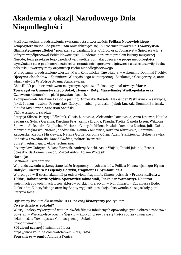 Akademia z okazji Narodowego Dnia Niepodległości Myśl przewodnia przedstawienia związana była z twórczością Feliksa Nowowiejskiego – kompozytora melodii do pieśni Rota oraz zbliżająca się 150 rocznica utworzenia Towarzystwa Gimnastycznego „Sokół” powiązana z działalnością Chórów oraz Towarzystw Śpiewaczych, z którymi współpracował Feliks Nowowiejski. Akademia poruszała problem kultury muzycznej Narodu, form przekazu tego dziedzictwa i wielkiej roli jaką odegrały u progu niepodległości wymykające się z pod kontroli zaborców organizacje sportowe i śpiewacze z które krzewiły ducha polskości i tworzyły ramy organizacji ruchu niepodległosciowego. W programie przedstawiono wiersze: Marii Konopnickiej Inwokacja w wykonaniu Dominiki Kuchty, Ojczyzna chochołów – Kazimierza Wierzyńskiego w interpretacji Bartłomieja Grzegorczyka, oraz własny utwór: W Polsce Adama Stankiewicza. Chór III LO pod kierownictwem muzycznym Agnieszki Rokseli wykonał utwory: Marsz Towarzystwa Gimnastycznego Sokół, Hymn - Rotę, Marsyliankę Wielkopolską oraz Czerwone słoneczko – pieśń powstań śląskich. Akompaniowali: Martyna Krasoń – pianino, Agnieszka Roksela, Aleksander Pastuszyński – skrzypce, Jakub Krasoń – trąbka, Przemysław Gabrych – tuba, gitarzyści - Jakub Janczak, Dominik Bartczak, Klaudia Miśkiewicz, Sebastian Saciński Chór wystąpił w składzie: Patrycja Sikora, Patrycja Półrolnik, Oliwia Łubowska, Aleksandra Lachowska, Anna Druszcz, Natalia Sagańska, Sylwia Ceranka, Karolina Fryś, Kamila Brynda, Klaudia Trelka, Żaneta Łysoń, Wiktoria Śpiewak, Aleksandra Cieplucha, Marianna Gabrych, Milena Pawlak, Dominika Kuchta, Julia Gałas, Martyna Mękarska, Natalia Jagodzińska, Hanna Żbikiewicz, Karolina Kluzowska, Dominika Kacperska, Klaudia Miśkiewicz, Natalia Górna, Karolina Górna, Adam Stankiewicz, Hubert Pawlak, Radosław Szwedowski, Dawid Gwóźdź, Wiktor Owczarek Sprzęt nagłaśniający, ekipa techniczna: Przemysław Gabrych, Łukasz Bartosik, Andrzej Bański, Artur Wójcik, Dawid Jakubik, Ernest Ścieszko, Bartłomiej Krasoń, Marcel Antoś, Adrian Wojtasik Narracja: Bartłomiej Grzegorczyk W przedstawieniu wykorzystano także fragmenty innych utworów Feliksa Nowowiejskiego: Hymn Bałtyku, uwertura z Legendy Bałtyku, fragment IX Symfonii cz.3. W prologu i w II części akademii przedstawiono fragmenty filmów polskich (Pruska kultura z 1908r., Bohaterowie Sybiru, Sportowiec mimo woli, Pieśniarz Warszawy). Na temat wojennych i powojennych losów aktorów polskich grających w tych filmach - Eugeniusza Bodo, Aleksandra Żabczyńskiego oraz Iny Benity wygłosiła prelekcję absolwentka naszej szkoły pani Patrycja Resel. Ogłaszamy konkurs dla uczniów III LO na esej historyczny pod tytułem: Co się działo w Sokolni? W eseju należy wykorzystać wątki z dwóch filmów fabularnych opowiadających o okresie zaborów i powstań w Wielkopolsce oraz na Śląsku, w których przewijają się treści i obrazy związane z działalnością Towarzystwa Gimnastycznego Sokół. Proponujemy filmy: Sól ziemi czarnej Kazimierza Kutza https://www.youtube.com/watch?v=mSFtc4JCaVA Pogranicze w ogniu Andrzeja Konica http://reseton.net/video/951f/pogranicze-w-ogniu-04-1919 Najdłuższa wojna nowoczesnej Europy Jerzego Sztwiertni
