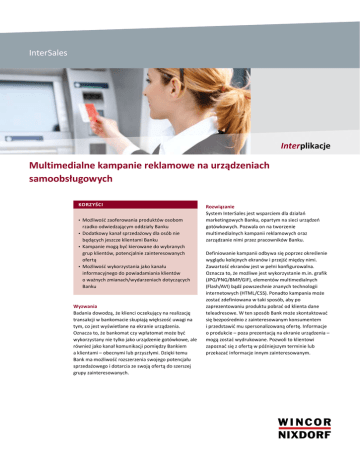 InterSales Interplikacje Multimedialne kampanie reklamowe na urządzeniach samoobsługowych KORZYŚCI ▪ Możliwość zaoferowania produktów osobom rzadko odwiedzającym oddziały Banku ▪ Dodatkowy kanał sprzedażowy dla osób nie będących jeszcze klientami Banku Rozwiązanie System InterSales jest wsparciem dla działań marketingowych Banku, opartym na sieci urządzeń gotówkowych. Pozwala on na tworzenie multimedialnych kampanii reklamowych oraz zarządzanie nimi przez pracowników Banku. ▪ Kampanie mogą być kierowane do wybranych grup klientów, potencjalnie zainteresowanych ofertą ▪ Możliwość wykorzystania jako kanału informacyjnego do powiadamiania klientów o ważnych zmianach/wydarzeniach dotyczących Banku Wyzwania Badania dowodzą, że klienci oczekujący na realizację transakcji w bankomacie skupiają większość uwagi na tym, co jest wyświetlane na ekranie urządzenia. Oznacza to, że bankomat czy wpłatomat może być wykorzystany nie tylko jako urządzenie gotówkowe, ale również jako kanał komunikacji pomiędzy Bankiem a klientami – obecnymi lub przyszłymi. Dzięki temu Bank ma możliwość rozszerzenia swojego potencjału sprzedażowego i dotarcia ze swoją ofertą do szerszej grupy zainteresowanych. Definiowanie kampanii odbywa się poprzez określenie wyglądu kolejnych ekranów i przejść między nimi. Zawartość ekranów jest w pełni konfigurowalna. Oznacza to, że możliwe jest wykorzystanie m.in. grafik (JPG/PNG/BMP/GIF), elementów multimedialnych (Flash/AVI) bądź powszechnie znanych technologii internetowych (HTML/CSS). Ponadto kampania może zostać zdefiniowana w taki sposób, aby po zaprezentowaniu produktu pobrać od klienta dane teleadresowe. W ten sposób Bank może skontaktować się bezpośrednio z zainteresowanym konsumentem i przedstawić mu spersonalizowaną ofertę. Informacje o produkcie – poza prezentacją na ekranie urządzenia – mogą zostać wydrukowane. Pozwoli to klientowi zapoznać się z ofertą w późniejszym terminie lub przekazać informacje innym zainteresowanym. InterSales pozwala na bezproblemowe dotarcie z produktem do grupy docelowej. W tym celu kampania może być przypisana do dowolnie zdefiniowanej grupy klientów. Grupa tworzona jest w sposób statyczny – przez podanie wprost klientów – lub w sposób dynamiczny poprzez podanie numeru BIN karty. Dzięki temu możliwe jest określanie specyficznych grup klientów, np. posiadacze danego kredytu, osoby mające odpowiednie saldo na rachunku itd. Dużym udogodnieniem jest możliwość definiowania kampanii dla konsumentów nie będących klientami Banku. W ten sposób Bank ma możliwość dotarcia bezpośrednio do potencjalnych klientów i zainteresowania ich swoją ofertą. Ilość zdefiniowanych kampanii dla danej grupy jest nieograniczona. Administrator systemu może określić priorytet dla tworzonych kampanii. Ponadto na podstawie zebranych odpowiedzi klientów system określa ich indywidualne preferencje w stosunku do poszczególnych treści reklamowych i na tej podstawie podejmuje decyzje co do wyświetleń kampanii podczas kolejnych transakcji. Przykładowe ekrany kampanii reklamowej oferującej pożyczkę PROWADZENIE KAMPANII Moment wyświetlenia ekranów kampanii reklamowej podczas realizacji transakcji jest konfigurowalny. Możliwe ustawienia: ▪ Po włożeniu karty do czytnika ▪ Po wprowadzeniu kodu PIN ▪ Po wyborze języka, w którym wyświetlone zostają dalsze komunikaty ▪ Przed pobraniem gotówki ▪ Przed sprawdzeniem salda na koncie ▪ Po pobraniu gotówki Wyświetlanie kampanii można zawęzić do określonych ram czasowych. Po zakończeniu okresu aktywności kampanii automatycznie przestaje być ona wyświetlana. Dodatkowo można określić czas wyświetlania z podziałem na poszczególne godziny i dni tygodnia. W ten sposób można np. zdefiniować kampanię wyświetlaną tylko w weekend lub ograniczyć wyświetlanie kampanii w godzinach nocnych. Przykładowe ekrany konfiguracyjne rozwiązania InterSales Publikacja firmy Wincor Nixdorf ul. Popularna 82 02-226 Warszawa Tel: +48 22 572 42 00 / 01 Fax: +48 22 572 42 09 [email protected] www.wincor-nixdorf.com/pl