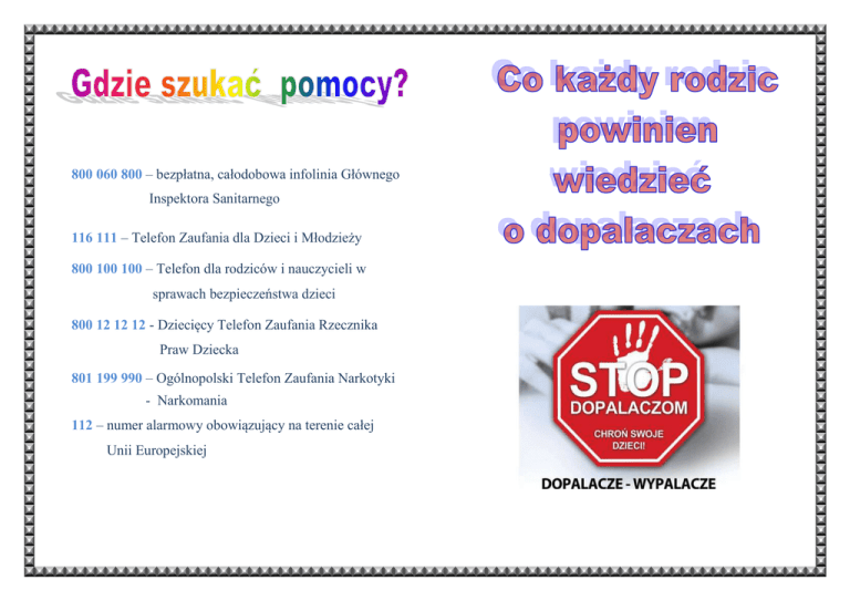 800 060 800 – bezpłatna, całodobowa infolinia Głównego Inspektora Sanitarnego 116 111 – Telefon Zaufania dla Dzieci i Młodzieży 800 100 100 – Telefon dla rodziców i nauczycieli w sprawach bezpieczeństwa dzieci 800 12 12 12 - Dziecięcy Telefon Zaufania Rzecznika Praw Dziecka 801 199 990 – Ogólnopolski Telefon Zaufania Narkotyki - Narkomania 112 – numer alarmowy obowiązujący na terenie całej Unii Europejskiej Co to są „dopalacze” Dopalacze to różnego rodzaju substancje psychoaktywne – takie, które powodują zmiany w zachowaniu człowieka, czy też postrzeganiu przez niego rzeczywistości. W działaniu Dlaczego dopalacze nie są bezpieczne? zanim jakaś substancja trafi do powszechnego użytku np. jako lek, musi przejść próby laboratoryjne, czasem także testy na przypominają alkohol lub narkotyki. zwierzętach oraz trzy fazy badań klinicznych na ludziach. W ten Dopalacze bywają mieszankami substancji naturalnych np. ziół sposób sprawdzane jest, czy substancje te są bezpieczne dla (zawierają głównie związki halucynogenne, np. te oparte na wyciągach z muchomora czerwonego lub plamistego) lub mogą człowieka i nie powodują szkodliwych skutków ubocznych. być syntetyczne, czyli wytworzone w laboratorium chemicznym. Dopalacze, choć tworzone są z mieszanin niebadanych do tej Cała specyfika tzw. „legalnych narkotyków” polega na tym, że są pory substancji psychoaktywnych, nie przechodzą takich testów. one produkowane z substancji nie uznawanych za szkodliwe czy Prawda jest taka, że producenci dopalaczy testują swoje niedozwolone. Dopiero mieszanka – receptura – powoduje ich „wyroby” na klientach. ukierunkowane działanie. substancje zanieczyszczone, w niektórych próbkach znajdują się Nowe narkotyki sprzedawane są często w Internecie jako np.: także leki sole do kąpieli, kadzidełka, badania pokazały, że do dopalaczy często dodawane są ponieważ liczba tworzonych dopalaczy rośnie, a składają się na nawozy do roślin, nie różne nowo-wyodrębnione składniki, w razie zatrucia lub chemikalia do badań, innych skutków ubocznych, często lekarze nie są w stanie pochłaniacze wilgoci, wykryć, jaka substancja spowodowała dany efekt. Może to talizmany, utrudnić proces leczenia lub ratowania życia. kleje. ponieważ na ich opakowaniach nie jest napisane, jakie substancje zawierają, ciężko przewidzieć jakie skutki uboczne W rzeczywistości, choć widnieje na nich taka etykietka, nie mają one nic wspólnego z tymi artykułami. powodują, oraz jak duża dawka może wywołać poważne negatywne konsekwencje. Czy dopalacze szkodzą Zażywanie dopalaczy może być niebezpieczne! Dlaczego? Jak wyglądają dopalacze Bo: mefedron, efedron, metylokatynon, czy chociażby równie Postać fizyczna tych produktów zbliżona jest wyglądem do narkotyków . Dopalacze występują w postaci: popularny składnik dopalaczy jakim jest salwinoryna (szałwia -białego proszku wieszcza), powodują znaczny wzrost tętna, szybszy oddech. Częste zażywanie tych substancji może prowadzić do wyczerpania organizmu, a w skrajnych przypadkach do śmierci. Objawy zatrucia dopalaczami najczęściej skupiają się na ośrodkowym układzie nerwowym, zwykle to: -kapsułek lub tabletek -suszu roślinnego (nasiona, liście, skręty, ekstrakt) - zaburzenia świadomości - bóle głowy - zaburzenia orientacji - bełkotliwa mowa - omdlenia - kołatanie serca - spadki ciśnienia tętniczego krwi - wymioty - wahania nastroju (na zmianę depresja i euforia) -suszu grzybów Ryzyko zażywania dopalaczy: Postępowanie w sytuacji zagrożenia życia Objawy zatrucia nowymi narkotykami, takie jak m.in.: utrata Stany lękowe Agresja wobec otoczenia Przedawkowanie przytomności, oddechu czy bezwzględnymi zaburzenia nadmierne świadomości, pobudzenie wskazaniami do zatrzymanie psychoruchowe wezwania są pogotowia ratunkowego. W takich sytuacjach zadzwoń pod numer 112. Śmierć Nieotrzymanie skutecznej pomocy medycznej Utrata zdrowia Do czasu przybycia pogotowia udziel pierwszej pomocy przedmedycznej: w przypadku utraty przytomności ułóż osobę nieprzytomną w pozycji bezpiecznej zapewniającej dopływ powietrza i ochronę przed zachłyśnięciem, sprawdzaj oddech, Halucynacje i urojenia Próby samobójcze Wystawienie się na ośmieszenie Złe samopoczucie w przypadku zatrzymania oddechu zastosuj procedury Podstawowego Podtrzymania Życia (30 ucisków na klatkę piersiową i 2 wdechy), w przypadku pobudzenia zapewnij obecność 1-2 osób przyjaznych dla poszkodowanego, pozostań przy poszkodowanym do czasu przybycia pogotowia ratunkowego, Wypadki jeśli tylko to możliwe, dowiedz się jakich substancji użył poszkodowany i przekaż tę informację personelowi pogotowia medycznego. Znalezione przy poszkodowanym opakowania, leki lub używki również przekaż personelowi medycznemu.