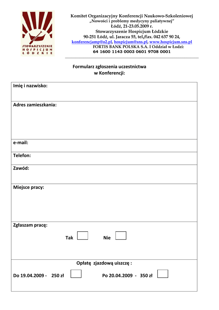 Komitet Organizacyjny Konferencji Naukowo-Szkoleniowej „Nowości i problemy medycyny paliatywnej” Łódź, 21-23.05.2009 r. Stowarzyszenie Hospicjum Łódzkie 90-251 Łódź, ul. Jaracza 55, tel./fax. 042 637 90 24, [email protected], [email protected], www.hospicjum.sns.pl FORTIS BANK POLSKA S.A. I Oddział w Łodzi: 64 1600 1143 0003 0601 9708 0001 __________________________________________________________________ Formularz zgłoszenia uczestnictwa w Konferencji: Imię i nazwisko: Adres zamieszkania: e-mail: Telefon: Zawód: Miejsce pracy: Zgłaszam pracę: Tak Nie Opłatę zjazdową uiszczę : Do 19.04.2009 - 250 zł Po 20.04.2009 - 350 zł Nie będę korzystał(a) z miejsc noclegowych: Proszę o zarezerwowanie noclegu: Nazwa hotelu Hotel Grand***+ Hotel Światowit *** Hotel Centrum *** Hotel Savoy ** Hotel Mazowiecki ** Hotel Ibis** Cena za nocleg ze śniadaniem Pokój -1 osobowy Pokój 2-osobowy 329 402 200 252 250 302 187 250 163 239 269 X Rezerwuję nocleg: 21/22 22/23 Całkowity koszt Łączna opłata: koszt udziału w Konferencji i koszt noclegu: Dane do wystawienia rachunku: Wyrażam zgodę na przetwarzanie moich danych osobowych przez Stowarzyszenie Hospicjum Łódzkie w celach informacyjnych i marketingowych zgodnie z przepisami ustawy dnia 29.08.1997 o ochronie danych osobowych. Miejscowość Data Podpis uczestnika