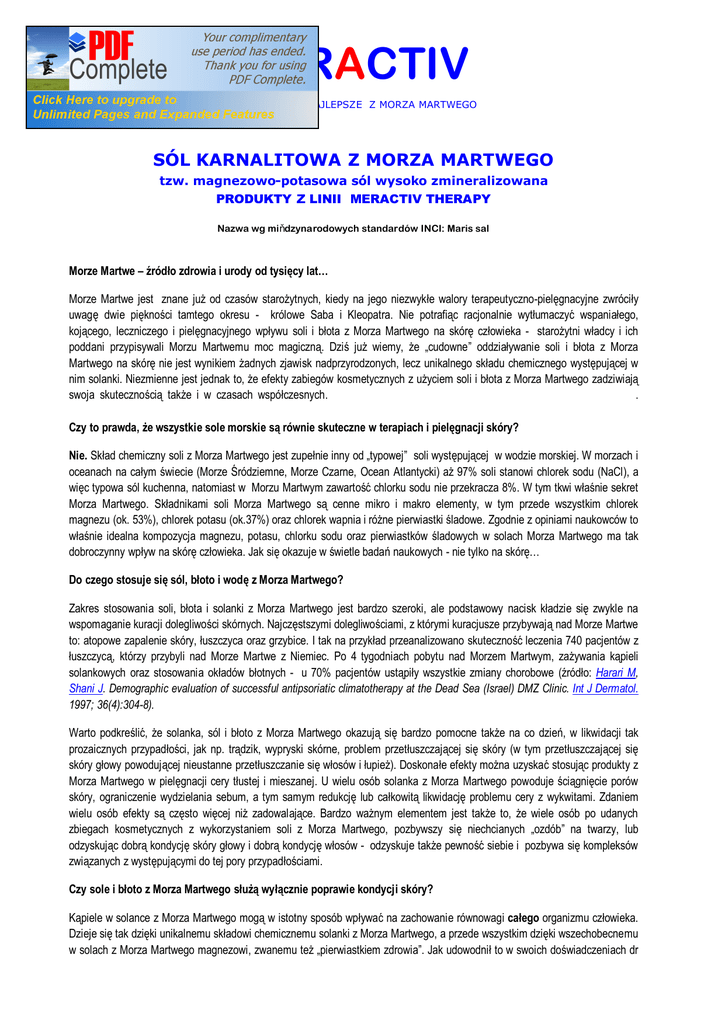 MERACTIV WSZYSTKO CO NAJLEPSZE Z MORZA MARTWEGO SÓL KARNALITOWA Z MORZA MARTWEGO tzw. magnezowo-potasowa sól wysoko zmineralizowana PRODUKTY Z LINII MERACTIV THERAPY Nazwa wg międzynarodowych standardów INCI: Maris sal Morze Martwe – źródło zdrowia i urody od tysięcy lat… Morze Martwe jest znane już od czasów starożytnych, kiedy na jego niezwykłe walory terapeutyczno-pielęgnacyjne zwróciły uwagę dwie piękności tamtego okresu - królowe Saba i Kleopatra. Nie potrafiąc racjonalnie wytłumaczyć wspaniałego, kojącego, leczniczego i pielęgnacyjnego wpływu soli i błota z Morza Martwego na skórę człowieka - starożytni władcy i ich poddani przypisywali Morzu Martwemu moc magiczną. Dziś już wiemy, że „cudowne” oddziaływanie soli i błota z Morza Martwego na skórę nie jest wynikiem żadnych zjawisk nadprzyrodzonych, lecz unikalnego składu chemicznego występującej w nim solanki. Niezmienne jest jednak to, że efekty zabiegów kosmetycznych z użyciem soli i błota z Morza Martwego zadziwiają swoja skutecznością także i w czasach współczesnych. . Czy to prawda, że wszystkie sole morskie są równie skuteczne w terapiach i pielęgnacji skóry? Nie. Skład chemiczny soli z Morza Martwego jest zupełnie inny od „typowej” soli występującej w wodzie morskiej. W morzach i oceanach na całym świecie (Morze Śródziemne, Morze Czarne, Ocean Atlantycki) aż 97% soli stanowi chlorek sodu (NaCl), a więc typowa sól kuchenna, natomiast w Morzu Martwym zawartość chlorku sodu nie przekracza 8%. W tym tkwi właśnie sekret Morza Martwego. Składnikami soli Morza Martwego są cenne mikro i makro elementy, w tym przede wszystkim chlorek magnezu (ok. 53%), chlorek potasu (ok.37%) oraz chlorek wapnia i różne pierwiastki śladowe. Zgodnie z opiniami naukowców to właśnie idealna kompozycja magnezu, potasu, chlorku sodu oraz pierwiastków śladowych w solach Morza Martwego ma tak dobroczynny wpływ na skórę człowieka. Jak się okazuje w świetle badań naukowych - nie tylko na skórę… Do czego stosuje się sól, błoto i wodę z Morza Martwego? Zakres stosowania soli, błota i solanki z Morza Martwego jest bardzo szeroki, ale podstawowy nacisk kładzie się zwykle na wspomaganie kuracji dolegliwości skórnych. Najczęstszymi dolegliwościami, z którymi kuracjusze przybywają nad Morze Martwe to: atopowe zapalenie skóry, łuszczyca oraz grzybice. I tak na przykład przeanalizowano skuteczność leczenia 740 pacjentów z łuszczycą, którzy przybyli nad Morze Martwe z Niemiec. Po 4 tygodniach pobytu nad Morzem Martwym, zażywania kąpieli solankowych oraz stosowania okładów błotnych - u 70% pacjentów ustąpiły wszystkie zmiany chorobowe (źródło: Harari M, Shani J. Demographic evaluation of successful antipsoriatic climatotherapy at the Dead Sea (Israel) DMZ Clinic. Int J Dermatol. 1997; 36(4):304-8). Warto podkreślić, że solanka, sól i błoto z Morza Martwego okazują się bardzo pomocne także na co dzień, w likwidacji tak prozaicznych przypadłości, jak np. trądzik, wypryski skórne, problem przetłuszczającej się skóry (w tym przetłuszczającej się skóry głowy powodującej nieustanne przetłuszczanie się włosów i łupież). Doskonałe efekty można uzyskać stosując produkty z Morza Martwego w pielęgnacji cery tłustej i mieszanej. U wielu osób solanka z Morza Martwego powoduje ściągnięcie porów skóry, ograniczenie wydzielania sebum, a tym samym redukcję lub całkowitą likwidację problemu cery z wykwitami. Zdaniem wielu osób efekty są często więcej niż zadowalające. Bardzo ważnym elementem jest także to, że wiele osób po udanych zbiegach kosmetycznych z wykorzystaniem soli z Morza Martwego, pozbywszy się niechcianych „ozdób” na twarzy, lub odzyskując dobrą kondycję skóry głowy i dobrą kondycję włosów - odzyskuje także pewność siebie i pozbywa się kompleksów związanych z występującymi do tej pory przypadłościami. Czy sole i błoto z Morza Martwego służą wyłącznie poprawie kondycji skóry? Kąpiele w solance z Morza Martwego mogą w istotny sposób wpływać na zachowanie równowagi całego organizmu człowieka. Dzieje się tak dzięki unikalnemu składowi chemicznemu solanki z Morza Martwego, a przede wszystkim dzięki wszechobecnemu w solach z Morza Martwego magnezowi, zwanemu też „pierwiastkiem zdrowia”. Jak udowodnił to w swoich doświadczeniach dr Waring na Uniwersytecie Birmingham w Anglii – w czasie kąpieli w solach magnezowych magnez jest wchłaniany do krwi przez pory skóry. Doświadczenie wykazało jednoznacznie, że w grupie badanych ochotników już po 1-szej kąpieli poziom magnezu we krwi wzrósł o 10%, zaś po serii 7-miu kąpieli poziom ten zwiększył się o 35% (w porównaniu do poziomu magnezu sprzed doświadczenia – źródło: Waring RH, Report on Absorption of magnesium sulfate (Epsom salts) across the skin, www.mgwater.com/transdermal.shtml). Co to oznacza w praktyce? Doświadczenie wykonane na Uniwersytecie Birmingham pokazuje nam, że kąpiele w solach magnezowych (a taką jest właśnie sól i solanka z Morza Martwego) mogą stanowić istotne źródło suplementacji (uzupełniania) magnezu w organiźmie. Podobne mechanizmy zaobserwowano w odniesieniu do uzupełniania niedoborów cynku i wapnia (źródło: Shani J, Barak S, Levi D, Ram M, Schachner ER, Schlesinger T, Robberecht H, Van Grieken R, Avrach WW. Skin penetration of minerals in psoriatics and guinea-pigs bathing in hypertonic salt solutions. Pharmacol Res Commun. 1985;17(6):501-12.). Dzięki kąpielom w solance z Morza Martwego (w tym także okładom błotnym oraz kompresom solnym z soli magnezowej z Morza Martwego) organizm zyskuje podwójnie: solanka i błoto wspaniale pielęgnują skórę, jednocześnie zaś może następować uzupełnianie ewentualnych niedoborów magnezu i innych pierwiastków w organiźmie w sposób bezinwazyjny, naturalny i jak najbardziej bezpieczn
