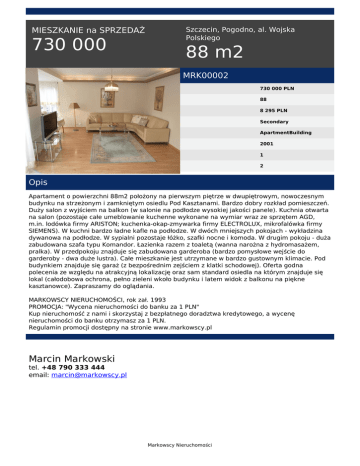MIESZKANIE na SPRZEDAŻ 730 000 Szczecin, Pogodno, al. Wojska Polskiego 88 m2 MRK00002 730 000 PLN 88 8 295 PLN Secondary ApartmentBuilding 2001 1 2 Opis Apartament o powierzchni 88m2 położony na pierwszym piętrze w dwupiętrowym, nowoczesnym budynku na strzeżonym i zamkniętym osiedlu Pod Kasztanami. Bardzo dobry rozkład pomieszczeń. Duży salon z wyjściem na balkon (w salonie na podłodze wysokiej jakości panele). Kuchnia otwarta na salon (pozostaje całe umeblowanie kuchenne wykonane na wymiar wraz ze sprzętem AGD, m.in. lodówka firmy ARISTON; kuchenka-okap-zmywarka firmy ELECTROLUX, mikrofalówka firmy SIEMENS). W kuchni bardzo ładne kafle na podłodze. W dwóch mniejszych pokojach - wykładzina dywanowa na podłodze. W sypialni pozostaje łóżko, szafki nocne i komoda. W drugim pokoju - duża zabudowana szafa typu Komandor. Łazienka razem z toaletą (wanna narożna z hydromasażem, pralka). W przedpokoju znajduje się zabudowana garderoba (bardzo pomysłowe wejście do garderoby - dwa duże lustra). Całe mieszkanie jest utrzymane w bardzo gustownym klimacie. Pod budynkiem znajduje się garaż (z bezpośrednim zejściem z klatki schodowej). Oferta godna polecenia ze względu na atrakcyjną lokalizację oraz sam standard osiedla na którym znajduje się lokal (całodobowa ochrona, pełno zieleni wkoło budynku i latem widok z balkonu na piękne kasztanowce). Zapraszamy do oglądania. MARKOWSCY NIERUCHOMOŚCI, rok zał. 1993 PROMOCJA: "Wycena nieruchomości do banku za 1 PLN" Kup nieruchomość z nami i skorzystaj z bezpłatnego doradztwa kredytowego, a wycenę nieruchomości do banku otrzymasz za 1 PLN. Regulamin promocji dostępny na stronie www.markowscy.pl Marcin Markowski tel. +48 790 333 444 email: [email protected] Markowscy Nieruchomości Powered by TCPDF (www.tcpdf.org)