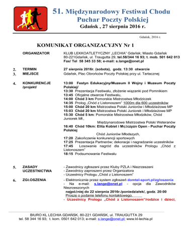 51. Międzynarodowy Festiwal Chodu Puchar Poczty Polskiej Gdańsk , 27 sierpnia 2016 r. Gdańsk, 2016 r. KOMUNIKAT ORGANIZACYJNY Nr 1 ORGANIZATOR KLUB LEKKOATLETYCZNY „LECHIA” Gdańsk; Miasto Gdańsk 80-221Gdańsk, ul. Traugutta 29, tel.58/344 16 93; t. mob. 501 642 013 Fax/ Tel 58 345 33 58; e-mail: [email protected] 2. 3. TERMIN MIEJSCE 27 sierpnia 2016r. (sobota), godz. 13:30 otwarcie Gdańsk, Plac Obrońców Poczty Polskiej przy ul. Tartacznej 4. KONKURENCJE /projekt/ 13:00 Festyn Edukacyjny/Muzeum II Wojny i Muzeum Poczty Polskiej/ 13:30 Prezentacja Festiwalu, złożenie wiązanki pod Pomnikiem 13:45 Oficjalne otwarcie Festiwalu, 14:00 Chód 3 km Pomorskie Mistrzostwa Młodziczek 14:35 Prolog „Chód z Listonoszem” 1000m dla 600 uczestników 15:00 Chód 20 km Mistrzostwa Polski Juniorów i Młodzieżowe MP 15:03 Chód 20 km Mistrzostwa Polski Juniorek i Młodzieżowe MP 15:30 Chód 5 km: Pomorskie Mistrzostwa Młodzików, Chód Juniorek Mł., Międzynarodowe Mistrzostwa Polski Weteranów 16:40 Chód 10km: Elita Kobiet i Mężczyzn Open - Puchar Poczty Polskiej Chód Juniorów Młodszych, 17:20 Zakończenie konkurencji sportowych 17:25 Prezentacja Partnerów; dekoracje i nagradzanie uczestników 17:45 Losowanie nagród dla uczestników Prologu „Chód z Listonoszem” 18:15 Podsumowanie Festiwalu 5. ZASADY UCZESTNICTWA - Zawodnicy zgłoszeni przez Kluby PZLA i Niezrzeszeni - Zawodnicy zaproszeni przez Organizatora - Uczestnicy Prologu „Chód z Listonoszem” 6. ZGŁOSZENIA - Elektronicznie przez system zgłoszeń domtel-sport.pl/zgłoszenia - Na e-mail: [email protected] - opcja dla Zawodników Niezrzeszonych najpóźniej do 22 sierpnia 2016r./poniedziałek/, godz. 20:00 Proszę o podanie telefonu kontaktowego. - Uczestnicy Prologu „Chód z Listonoszem”/rodzice i dzieci, BIURO KL LECHIA GDAŃSK, 80-221 GDAŃSK, ul. TRAUGUTTA 29 tel. 58 344 16 93; t. kom. 0501 642 013; e-mail: [email protected]; www.kl-lechia.pl osoby starsze, młodzież/ elektronicznie przez arkusz rejestracyjny na stronie www.biegdominika.com/Puchar Poczty lub domtelsport.pl/zgłoszenia do imprez masowych do 26 sierpnia 2016r. -2 - 7. NOCLEGI Zamówienia na noclegi ( osobno kobiety i mężczyźni) z 26.08/27.08 2016r. i 27.08/28.08 2016r. przesłać na e-mail Organizatora: [email protected] w obligatoryjnym terminie do 19 sierpnia 2016r./piątek/ ! Koszt 100 zł za dobę (nocleg 50,- zł + 50,zł wyżywienie) Opłaty za noclegi i wyżywienie dokonać przy weryfikacji w Biurze Festiwalu 26 sierpnia 2016r 8. ZASADY FINANSOWANIA Koszty organizacji zawodów pokrywa Organizator. Koszty osobowe uczestnictwa pokrywają zawodnikom Kluby. Opłata Regulaminowa PZLA 15 zł /Juniorzy i Młodzicy 10 zł /; Prolog - bez opłat wpisowych 9. NAGRODY a/ Nagrody/w PLN/ Seniorki i Seniorzy 10 km : Im-1800; IIm-1400; IIIm-1000; IVm-600; V-300; VIm-200; b/ Nagrody Młodzieżowcy i Juniorzy MP 20 km: Medale + Finansowe c/ Nagrody Juniorki i Juniorzy Młodsi oraz Młodzicy: rzeczowe Zasady nagradzania zostaną podane przed Mityngiem. 10. BIURO ZAWODÓW 26.08.2016r. od 15:00 do 21:00 w Holu G łównym Zespo łu Szkó ł Łączności, ul. Podwale Staromiejskie 51/52 (wej ście od strony boiska) 27.08.2016r. od 09:00 do 14:30 w Holu G łównym Zespo łu Szkó ł Łączności. UWAGA: ZAWODNICY STARTUJĄ W NUMERACH PRZYDZIELONYCH PRZEZ ORGANIZATORA !!! ZAWODNICY NA PODIUM WYST ĘPUJĄ Z NUMEREM STARTOWYM FESTIWALU PRZYPI ĘTYM NA KLATCE PIERSIOWEJ !!! Udział w 51. Festiwalu Chodu-Pucharze Poczty Polskiej jest równoznaczny z wyrażeniem zgody na wykorzystanie wizerunku uczestnika zawodów w materiałach promocyjnych Organizatora i Sponsorów Pucharu. 11. INNE: 12. OTRZYMUJĄ: Obowiązek ubezpieczenia NNW spoczywa na macierzystym Klubie zawodników. 1. PZLA 2. Kluby I i II ligi 3. OZLA - powiadamiają pozostałe kluby w Okręgu BIURO KL LECHIA GDAŃSK, 80-221 GDAŃSK, ul. TRAUGUTTA 29 tel. 58 344 16 93; t. kom. 0501 642 013; e-mail: [email protected]; www.kl-lechia.pl Dyrektor Festiwalu Stanisław Lange BIURO KL LECHIA GDAŃSK, 80-221 GDAŃSK, ul. TRAUGUTTA 29 tel. 58 344 16 93; t. kom. 0501 642 013; e-mail: [email protected]; www.kl-lechia.pl