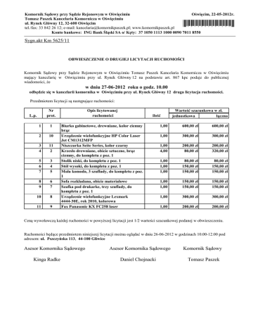 Oświęcim, 22-05-2012r. Komornik Sądowy przy Sądzie Rejonowym w Oświęcimiu Tomasz Paszek Kancelaria Komornicza w Oświęcimiu ul. Rynek Główny 12, 32-600 Oświęcim tel./fax: 33 842 26 12; e-mail: [email protected]; www.komornikpaszek.pl Konto bankowe: ING Bank Śląski SA o/ Kęty: 37 1050 1113 1000 0090 7011 8550 *4012052201200* Sygn.akt Km 5625/11 OBWIESZCZENIE O DRUGIEJ LICYTACJI RUCHOMOŚCI Komornik Sądowy przy Sądzie Rejonowym w Oświęcimiu Tomasz Paszek Kancelaria Komornicza w Oświęcimiu mający kancelarię w Oświęcimiu przy ul. Rynek Główny 12 na podstawie art. 867 kpc podaje do publicznej wiadomości, że w dniu 27-06-2012 roku o godz. 10.00 odbędzie się w kancelarii komornika w Oświęcimiu przy ul. Rynek Główny 12 druga licytacja ruchomości. Przedmiotem licytacji są następujące ruchomości: Nr prot. Opis licytowanej ruchomości 1 1 2 10 3 4 11 2 5 6 7 3 4 5 8 9 6 7 10 8 11 9 Biurko gabinetowe, drewniane, kolor ciemny brąz Urządzenie wielofunkcyjne HP Color Laser Jet CM1312MFP Niszczarka Seite Series, kolor czarny Krzesło drewniane, obicie sztuczne, brąz ciemny, do kompletu z poz. 1 Stolik niski, do kompletu z poz. 1 Stół wysoki, do kompletu z poz. 1 Mała komoda, 3 szuflady, do kompletu z poz. 1 Sofa rozkładana, obicie materiałowe Szafka pod drukarke, trzy szuflady, do kompletu z poz. 1 Urządzenie wielofunkcyjne Lexmark 4444-30E, rok 2010, kolorowa Fax Panasonic KX FC258 laser L.p. ilość Wartość szacunkowa w zł. jednostkowa łączna 1,00 600,00 zł 600,00 zł 1,00 300,00 zł 300,00 zł 1,00 4,00 200,00 zł 80,00 zł 200,00 zł 320,00 zł 1,00 1,00 1,00 80,00 zł 150,00 zł 150,00 zł 80,00 zł 150,00 zł 150,00 zł 1,00 1,00 150,00 zł 150,00 zł 150,00 zł 150,00 zł 1,00 300,00 zł 300,00 zł 1,00 200,00 zł 200,00 zł Ceną wywoławczą każdej ruchomości w powyższej licytacji jest 1/2 wartości szacunkowej podanej w obwieszczeniu. Ruchomości będące przedmiotem niniejszej licytacji można oglądać w dniu 26-06-2012 w godzinach 10.00-12.00 pod adresem: ul. Pszczyńska 113, 44-100 Gliwice Asesor Komornika Sądowego Kinga Radke Asesor Komornika Sądowego Daniel Chojnacki Komornik Sądowy Tomasz Paszek
