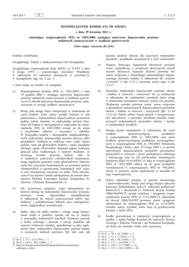 30.4.2011 PL Dziennik Urzędowy Unii Europejskiej L 111/3 ROZPORZĄDZENIE KOMISJI (UE) NR 420/2011 z dnia 29 kwietnia 2011 r. zmieniające rozporządzenie (WE) nr 1881/2006 ustalające najwyższe dopuszczalne poziomy niektórych zanieczyszczeń w środkach spożywczych (Tekst mający znaczenie dla EOG) poziom ustalony obecnie dla suszonych wodorostów morskich i produktów otrzymanych z tych wodorostów. KOMISJA EUROPEJSKA, uwzględniając Traktat o funkcjonowaniu Unii Europejskiej, (5) Przepisy dotyczące kapustnych liściowych powinny zostać ujednolicone z przepisami dotyczącymi innych warzyw liściastych. Kapustne liściowe powinny być zatem wyłączone z domyślnego maksymalnego dopusz czalnego poziomu kadmu w odniesieniu do „warzyw i owoców” w pkt 3.2.15 i powinny zostać ujęte w pkt 3.2.17. (6) Domyślne maksymalne dopuszczalne poziomy ołowiu i kadmu w owocach i warzywach nie są realistyczne w odniesieniu do wodorostów morskich, które mogą w środowisku naturalnym zawierać wyższe ich poziomy. Wodorosty morskie powinny zostać zatem wyłączone z domyślnych maksymalnych dopuszczalnych poziomów ołowiu i kadmu w owocach i warzywach (pkt 3.1.10 i 3.2.15). Należy zebrać więcej danych o występowaniu, aby zdecydować o potrzebie określenia bardziej realis tycznych maksymalnych poziomów ołowiu i kadmu w wodorostach morskich. (7) Istnieją pewne niespójności w odniesieniu do nazw środków spożywczych/grup produktów w rozporządzeniu (WE) nr 1881/2006 oraz nazw środków spożywczych/grup produktów wyszczególnio nych w rozporządzeniu (WE) nr 396/2005 Parlamentu Europejskiego i Rady z dnia 23 lutego 2005 r. w sprawie najwyższych dopuszczalnych poziomów pozostałości pestycydów w żywności i paszy pochodzenia roślinnego i zwierzęcego oraz na ich powierzchni, zmieniającym dyrektywę Rady 91/414/EWG (4). Jako że rozporządzenie (WE) nr 1881/2006 odnosi się do grup produktów wymienionych w rozporządzeniu (WE) nr 396/2005, nazwy te powinny zostać ujednolicone w stosunku do tego rozporządzenia. (8) Należy uaktualnić przepisy w sprawie monitoringu i sprawozdawczości, biorąc pod uwagę bieżące zalecenia dotyczące karbaminianu etylu (5), substancji perfluoroal kilowych (6) i akrylamidu (7). Ponieważ decyzja Komisji 2006/504/WE (8) została uchylona i zastąpiona rozpo rządzeniem Komisji (WE) nr 1152/2009 (9), odniesienie do decyzji 2006/504/WE powinno zostać zastąpione odniesieniem do rozporządzenia (WE) nr 1152/2009. Ponadto należy wyjaśnić, które dane są przekazywane Komisji, a które EFSA. (9) Środki przewidziane w niniejszym rozporządzeniu są zgodne z opinią Stałego Komitetu ds. Łańcucha Żywno ściowego i Zdrowia Zwierząt i ani Parlament Europejski, ani Rada nie wyraziły wobec nich sprzeciwu, uwzględniając rozporządzenie Rady (EWG) nr 315/93 z dnia 8 lutego 1993 r. ustanawiające procedury Wspólnoty w odniesieniu do substancji skażających w żywności (1), w szczególności jego art. 2 ust. 3, a także mając na uwadze, co następuje: (1) Rozporządzenie Komisji (WE) nr 1881/2006 z dnia 19 grudnia 2006 r. ustalające najwyższe dopuszczalne poziomy niektórych zanieczyszczeń w środkach spożyw czych (2) określa najwyższe dopuszczalne poziomy zanie czyszczeń w szeregu środków spożywczych. (2) Biorąc pod uwagę różne interpretacje w odniesieniu do części krabów, które należy poddać badaniu w celu porównania z maksymalnym dopuszczalnym poziomem kadmu, należy wyjaśnić, że maksymalny poziom okre ślony dla kadmu w skorupiakach w załączniku do rozpo rządzenia (WE) nr 1881/2006 stosuje się do mięsa z przydatków (odnóży i szczypiec) i odwłoka. W przypadku krabów i skorupiaków miękkoodwłoko wych maksymalny dopuszczalny poziom dotyczy tylko przydatków. Definicja ta wyklucza inne części skoru piaków, takie jak głowotułów krabów i części niejadalne (skorupa, ogon). Głowotułów obejmuje organy trawienne (gruczoł jelita środkowego), o których wiadomo, że zawierają wysokie poziomy kadmu. Jako że w niektórych państwach członkowskich konsumenci mogą regularnie spożywać części głowotułowia, właściwe może być pouczenie konsumentów na poziomie państw członkowskich o ograniczeniu konsumpcji tych części w celu zmniejszenia narażenia na kadm. Nota informa cyjna w tej sprawie została udostępniona na stronie inter netowej Dyrekcji Generalnej Komisji Europejskiej ds. Zdrowia i Ochrony Konsumentów (3). (3) Dla zachowania spójności, części skorupiaków, do których stosują się maksymalne dopuszczalne poziomy, powinny zostać odpowiednio zmodyfikowane w odniesieniu do innych zanieczyszczeń (ołów, rtęć, dioksyny i polichlorowane bifenyle oraz wielopierście niowe węglowodory aromatyczne). (4) Małże, takie jak małże zielone i ostrygi, mogą akumu lować kadm w podobny sposób, jak ma to miejsce w przypadku wodorostów morskich. Ponieważ proszek z małża zielonego i proszek z ostryg, podobnie jak suszone wodorosty morskie, sprzedawane są jako suple menty diety, maksymalny dopuszczalny poziom kadmu w suszonych małżach powinien być taki sam, jak (1) Dz.U. L 37 z 13.2.1993, s. 1. (2) Dz.U. L 364 z 20.12.2006, s. 5. (3) http://ec.europa.eu/food/food/chemicalsafety/contaminants/ cadmium_en.htm (4 ) (5 ) (6 ) (7 ) (8 ) (9 ) Dz.U. Dz.U. Dz.U. Dz.U. Dz.U. Dz.U. L L L L L L 70 z 16.3.2005, s. 1. 52 z 3.3.2010, s. 53. 68 z 18.3.2010, s. 22. 137 z 3.6.2010, s. 4. 199 z 21.7.2006, s. 21. 313 z 28.11.2009, s. 40. L 111/4 PL Dziennik Urzędowy Unii Europejskiej perfluoroalkilowych i akrylamidu otrzymanych zgodnie z zaleceniami Komisji 2007/196/WE (**), 2010/133/UE (***), 2010/161/UE (****) i 2010/307/UE (*****). PRZYJMUJE NINIEJSZE ROZPORZĄDZENIE: Artykuł 1 W rozporządzeniu (WE) nr 1881/2006 wprowadza się nastę pujące zmiany: ___________ (*) Dz.U. (**) Dz.U. (***) Dz.U. (****) Dz.U. (*****) Dz.U. 1) w art. 9 wprowadza się następujące zmiany: a) ustępy 2 i 3