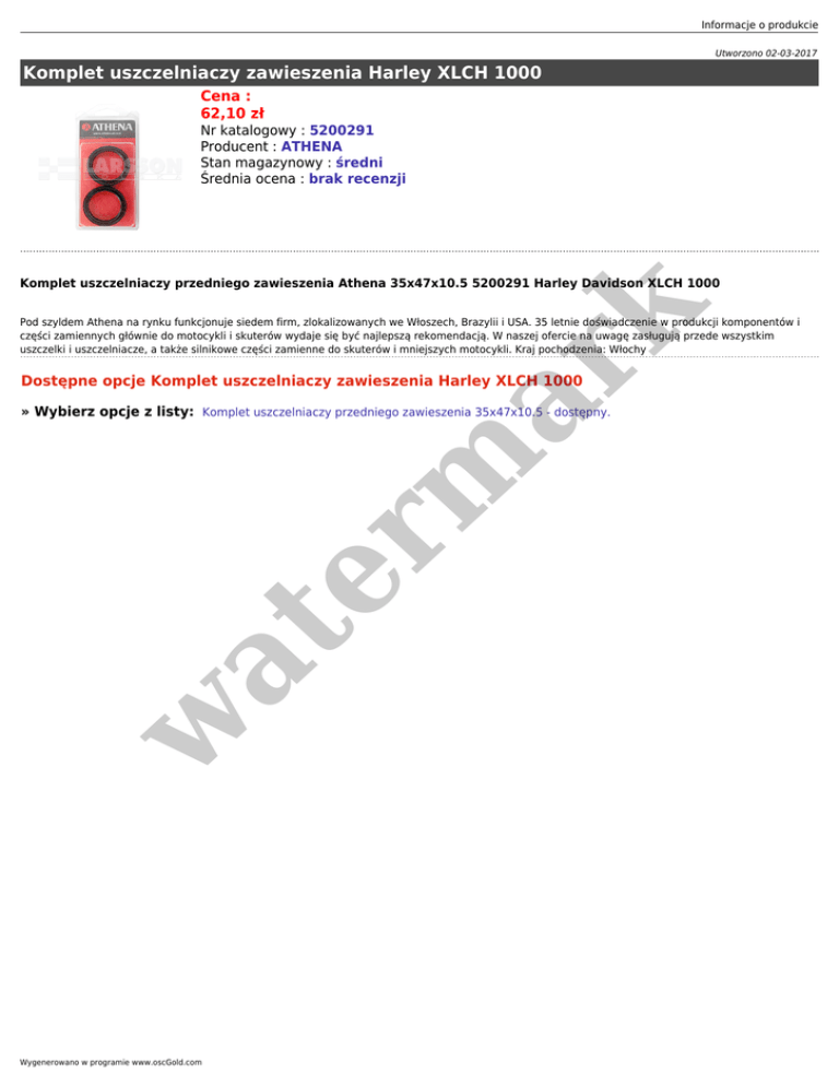 Informacje o produkcie Utworzono 02-03-2017 Komplet uszczelniaczy zawieszenia Harley XLCH 1000 Cena : 62,10 zł Nr katalogowy : 5200291 Producent : ATHENA Stan magazynowy : średni Średnia ocena : brak recenzji er m ar k Komplet uszczelniaczy przedniego zawieszenia Athena 35x47x10.5 5200291 Harley Davidson XLCH 1000 Pod szyldem Athena na rynku funkcjonuje siedem firm, zlokalizowanych we Włoszech, Brazylii i USA. 35 letnie doświadczenie w produkcji komponentów i części zamiennych głównie do motocykli i skuterów wydaje się być najlepszą rekomendacją. W naszej ofercie na uwagę zasługują przede wszystkim uszczelki i uszczelniacze, a także silnikowe części zamienne do skuterów i mniejszych motocykli. Kraj pochodzenia: Włochy Dostępne opcje Komplet uszczelniaczy zawieszenia Harley XLCH 1000 w at » Wybierz opcje z listy: Komplet uszczelniaczy przedniego zawieszenia 35x47x10.5 - dostępny. Wygenerowano w programie www.oscGold.com