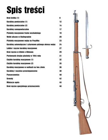 Spis treści Broń krótka (1) 8 Karabiny powtarzalne (1) 12 Karabiny powtarzalne (2) 14 Karabiny samopowtarzalne 17 Pistolety maszynowe frontu wschodniego 19 Walki uliczne w Stalingradzie 20 Pistolety maszynowe wojny na Pacyfiku 23 Karabiny automatyczne i szturmowe późnego okresu wojny 24 Lekkie i ręczne karabiny maszynowe 27 Broń ręczna w bitwie o Okinawę 29 Porównanie drużyn piechoty w 1944 roku 31 Ciężkie karabiny maszynowe (1) 32 Ciężkie karabiny maszynowe (2) 35 Karabiny maszynowe w walkach na Iwo Jimie 36 Karabiny i rusznice przeciwpancerne 38 Pancerzownice 40 Granaty 42 Miotacze ognia 45 Broń ręczna specjalnego przeznaczenia 46