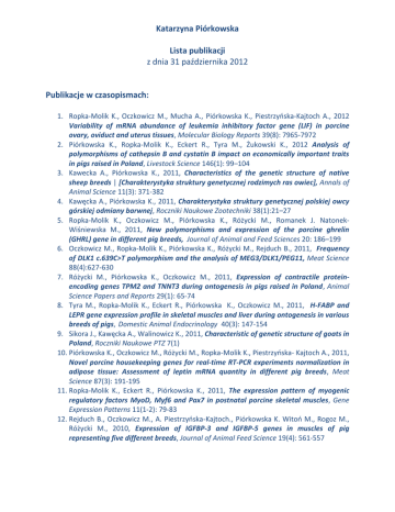 Katarzyna Piórkowska Lista publikacji z dnia 31 października 2012 Publikacje w czasopismach: 1. Ropka-Molik K., Oczkowicz M., Mucha A., Piórkowska K., Piestrzyńska-Kajtoch A., 2012 Variability of mRNA abundance of leukemia inhibitory factor gene (LIF) in porcine ovary, oviduct and uterus tissues, Molecular Biology Reports 39(8): 7965-7972 2. Piórkowska K., Ropka-Molik K., Eckert R., Tyra M., Żukowski K., 2012 Analysis of polymorphisms of cathepsin B and cystatin B impact on economically important traits in pigs raised in Poland, Livestock Science 146(1): 99–104 3. Kawecka A., Piórkowska K., 2011, Characteristics of the genetic structure of native sheep breeds | [Charakterystyka struktury genetycznej rodzimych ras owiec], Annals of Animal Science 11(3): 371-382 4. Kawęcka A., Piórkowska K., 2011, Charakterystyka struktury genetycznej polskiej owcy górskiej odmiany barwnej, Roczniki Naukowe Zootechniki 38(1):21–27 5. Ropka-Molik K., Oczkowicz M., Piórkowska K., Różycki M., Romanek J. NatonekWiśniewska M., 2011, New polymorphisms and expression of the porcine ghrelin (GHRL) gene in different pig breeds, Journal of Animal and Feed Sciences 20: 186–199 6. Oczkowicz M., Ropka-Molik K., Piórkowska K., Różycki M., Rejduch B., 2011, Frequency of DLK1 c.639C>T polymorphism and the analysis of MEG3/DLK1/PEG11, Meat Science 88(4):627-630 7. Różycki M., Piórkowska K., Oczkowicz M., 2011, Expression of contractile proteinencoding genes TPM2 and TNNT3 during ontogenesis in pigs raised in Poland, Animal Science Papers and Reports 29(1): 65-74 8. Tyra M., Ropka-Molik K., Eckert R., Piórkowska K., Oczkowicz M., 2011, H-FABP and LEPR gene expression profile in skeletal muscles and liver during ontogenesis in various breeds of pigs, Domestic Animal Endocrinology 40(3): 147-154 9. Sikora J., Kawęcka A., Walinowicz K., 2011, Characteristic of genetic structure of goats in Poland, Roczniki Naukowe PTZ 7(1) 10. Piórkowska K., Oczkowicz M., Różycki M., Ropka-Molik K., Piestrzyńska- Kajtoch A., 2011, Novel porcine housekeeping genes for real-time RT-PCR experiments normalization in adipose tissue: Assessment of leptin mRNA quantity in different pig breeds, Meat Science 87(3): 191-195 11. Ropka-Molik K., Eckert R., Piórkowska K., 2011, The expression pattern of myogenic regulatory factors MyoD, Myf6 and Pax7 in postnatal porcine skeletal muscles, Gene Expression Patterns 11(1-2): 79-83 12. Rejduch B., Oczkowicz M., A. Piestrzyńska-Kajtoch., Piórkowska K. Witoń M., Rogoz M., Różycki M., 2010, Expression of IGFBP-3 and IGFBP-5 genes in muscles of pig representing five different breeds, Journal of Animal Feed Science 19(4): 561-557 13. Oczkowicz M., Piestrzyńska-Kajtoch A., Piórkowska K., Rejduch B., Różycki M., 2010, Expression of DLK1 and MEG3 genes in porcine tissues during postnatal development, Genetics and Molecular Biology 33(4): 790-794 14. Rejduch B., Oczkowicz M., Piórkowska K., Piestrzyńska -Kajtoch A., Witoń M., Rogoz M., Różycki M., 2010, Expression of IGF1 and IGF2 genes in muscles during development of pigs representing five different breeds, Annals of Animal Science 10(3): 231-240 15. Oczkowicz M., Różycki M., Piórkowska K., Piestrzyńska – Kajtoch A., Rejduch B., 2010, A new set of endogenous reference genes for gene expression studies of porcine stomach, Journal of Animal Feed Science 19(4): 570-576 16. Piórkowska K., Tyra M., Rogoz M., Ropka-Molik K., Oczkowicz M. and Różycki M. 2010 Association of the melanocortin-4 receptor (MC4R) with feed intake, growth, fatness and carcass composition in pigs raised in Poland, Meat Science 85(2): 297-301 17. Szyndler-Nędza M., Tyra M., Blicharski T., Piórkowska K., 2010, Effect of mutation in MC4R gene on carcass quality in Puławska pig included in conservation breeding programme, Animal Science Paper and Reports 28(1): 37-45 18. Oczkowicz M., Tyra M., Walinowicz K., Różycki M., Rejduch B., 2009, Known mutation (A3072G) in intron 3 of the IGF2 gene is associated with growth and carcass composition in Polish pig breeds, Journal of Applied Genetics 50(3): 257-259 19. Sikora J., Kawęcka A., Walinowicz K., 2009, Sekwencje mikrosatelitarne w badaniach struktury genetycznej kóz, Roczniki Naukowe PTZ 4(3): 97-101 20. Walinowicz K., Rogoz M., Różycki M., Mucha A., Tyra M., 2008, Analiza struktury genetycznej wybranych ras świń hodowlanych w Polsce, Roczniki Naukowe Zootechniki 35(2): 109-117 21. Kawęcka A., Walinowicz K., 2007, Polymorphism of microsatellites DNA sequences in studies on the genetic structure of polish merino sheep, Annals Animal Science Suppl 1: 55-58 Prace pokonferencyjne i doniesienia zjazdowe: 1. Piórkowska K., Doktor J., Połtowicz K., 2012 Novel chicken housekeeping genes for normalization by real Time experiment in five tissues, XXV International Conference Genetic Days, Wroclaw, Poland 2. Piórkowska K., Mucha A., Ropka-Molik., 2012, Analysis of regulatory and structural sequences of Wnt7A HoxA10 and HoxA11 genes associated with reproductive traits in pigs, VI th International Scientific Symposium Application of scientific research in pig production improvement and their influence on rural areas development, BydgoszczToruń, Poland 3. Mucha A., Ropka-Molik K., Piórkowska K., Tyra M., Oczkowicz M., 2012, Effect of EGF, AREG and LIF gene polymorphism on litter size in pigs, EAAP 64th Bratislava Annual Meeting, Slovakia, ss 277 4. Mucha A., Tyra M., Piórkowska K., 2010, Wpływ polimorfizmu genu OPN na cechy związane z rozrodem świń, Mat. LXXV Zjazdu Nauk. PTZ: Nauka dla praktyki hodowlanej, Olsztyn, s. 94 5. Oczkowicz M., Ropka-Molik K., Piórkowska K., 2010, Frekwencja mutacji C/T w egzonie 5 genu DLK1 w rasach świń hodowanych w Polsce, oszacowana metodą REAL-TIME PCR, III Polski Kongres Genetyki Lublin, s. 149 6. Piórkowska K., Ropka-Molik K., Oczkowicz M., Różycki M., 2010, Oznaczenie frekwencji mutacji w loci genów receptora hormonu wzrostu (GHRH) i przysadkowo spe