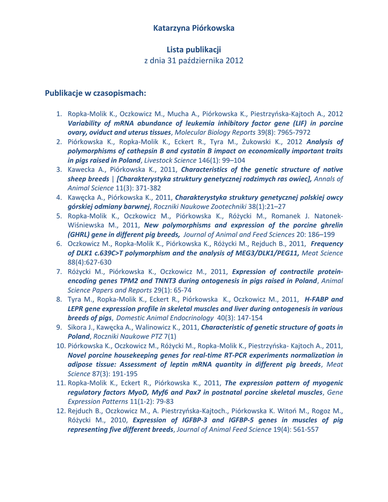 Katarzyna Piórkowska Lista publikacji z dnia 31 października 2012