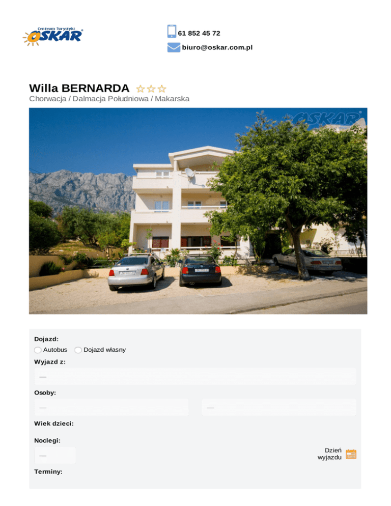 61 852 45 72 [email protected] Willa BERNARDA Chorwacja / Dalmacja Południowa / Makarska Dojazd: Autobus Dojazd własny Wyjazd z: Osoby: Wiek dzieci: Noclegi: Dzień wyjazdu Terminy: Pokój: Wyżywienie: Najtańsza oferta First Minute cena katalogowa do 5 marca 2017: 646,80 zł do 5 marca 2017: 646,80 zł do 31 marca 2017: 1509,20 zł do 31 marca 2017: 1509,20 zł Suma:2156,00 zł Suma: 2156,00 zł Opis oferty Miejscowość Atuty Wycieczki aneksy kuchenne we wszystkich studiach/apartamentach fakultatywne sympatyczni właściciele taras/balkon we wszystkich studiach/apartamentach Opinie 600 metrów do plaży przyjazny dla rodzin z dziećmi Położenie Kameralny pensjonat usytuowany w willowej dzielnicy Zelenka, oddalony około 600 m od morza. Sympatyczni właściciele tworzą rodzinną atmosferę podczas pobytu, która sprawia, że więzi kulturowe między Polską a Chorwacją zacieśniają się. Zakwaterowanie Studia dwuosobowe z łazienkami, składające się z sypialni oraz pokoju dziennego, w którym znajduje się TV, aneks kuchenny z lodówką. Studia trzyosobowe z łazienkami składają się z pokoju, połączonego z aneksem kuchennym z lodówką. W studio znajduję się TV. Studia posiadają na piętrze ogólnodostępny taras lub balkon, klimatyzacja - opcjonalna dopłata na miejscu w wysokości 8 euro/dzień/studio. Apartamenty w systemie 2+2, 2+3 lub 2+2+2 z łazienkami, składają się z dwóch oddzielnych sypialni oraz pokoju dziennego z aneksem kuchennym i lodówką. Oferta szczególnie polecana dla rodzin z dziećmi. Wszystkie apartamenty, poza jednym - usytuowanym na parterze budynku mają swój balkon lub taras. W każdym z apartamentów znajduje się TV, klimatyzacja - opcjonalna dopłata na miejscu w wysokości 8 euro/dzień/apartament. Brak możliwości dokwaterowania - rezerwacje dla jednej osoby wymagają wykupienia pokoju jednoosobowego. Dostępne opcje zakwaterowania studio 2 osobowe studio 3 osobowe aparatment 4 osobowy [2+2] apartament 4-6 osobowy [2+2+2] dokwaterowanie (brak możliwości) / studio 1 osobowe (dopłata) Dostępne opcje wyżywienia we własnym zakresie śniadania obiadokolacje śniadania i obiadokolacje możliwość wykupienia wyżywienie na miejscu u rezydenta w cenie 14 euro/dzień/os/pakiet HB minimalny pakiet na 6 dni Pakiet KOMFORT gwarancja wyboru miejsca w autokarze napoje w autokarze w cenie (6 x do wyboru: kawa, herbata, zimny napój 0,2l) cena: 50 zł/os Pakiet PRESTIGE gwarancja wyboru miejsca w autokarze napoje w autokarze w cenie (6 x do wyboru: kawa, herbata, zimny napój 0,2l) pierwszeństwo wejścia na pokład autokaru nadbagaż 5 kg w cenie suchy prowiant na drogę powrotną cena: 100 zł/os Warunki promocji FIRST MINUTE www.oskar.com.pl/zalaczniki/warunki_promocji Karta Dużej Rodziny Karta Dużej Rodziny www.oskar.com.pl/zalaczniki/karta_duzej_rodziny Opieka / Animacje dla dzieci Opieka nad dzieckiem połączona z animacją czasu wolnego prowadzona przez osobę posiadającą odpowiednie kwalifikacje oraz uprawnienia. Możliwość wykupienia na miejscu u rezydenta pakietów opieki / animacji dla dzieci wg wybranej opcji dla dzieci w wieku od 3 do 12 lat: - 3 dniowy pakiet dzienny w cenie 20 euro; zajęcia to plażowanie oraz gry zespołowe (siatkówka plażowa, piłka nożna plażowa, podchody itd.); obowiązuje w godz. 10:00 - 17:00; deklaracja u rezydenta na miejscu i rezerwacja 3 wybranych dni, którymi ma być objęty pakiet opiekuńczo/animacyjny - 1 dniowy pakiet wieczorny w cenie 15 euro; zajęcia dostosowywane do wieku i liczby osób; obowiązuje w godz. 20-00 - 24-00; deklaracja u rezydenta na miejscu i rezerwacja wybranego dnia oferta obowiązuje w miesiącach lipiec i sierpień Ubezpieczenie Warunki ubezpieczenia Bezpieczne Podróże Signal Iduna dokument do pobrania www.oskar.com.pl/zalaczniki/owu Warunki ubezpieczenia Kosztów Imprezy Turystycznej Signal Iduna dokument do pobrania www.oskar.com.pl/zalaczniki/owurg Turystyczny Fundusz Gwarancyjny W związku z powołaniem do życia w dniu 26.11.2016 Turystycznego Funduszu Gwarancyjnego każdy klient Biura Podróży Oskar zobowiązany jest do zapłaty kwoty w wysokości 10zł/os. przy każdorazowej rezerwacji imprezy turystycznej (obowiązuje od dnia 26.11.2016). Kwota przeznaczona na Turystyczny Fundusz Gwarancyjny zostanie automatycznie doliczona do wartości rezerwacji (w momencie jej dokonania). Wyjątkiem są imprezy turystyczne odbywające się w krajach posiadających granicę z Rzeczpospolitą Polską. Składka nie jest przychodem biura. Udogodnienia Klimatyzacja Animacje dla dzieci Regulowane fotele Tacki Nowoczesna flota Zawodowy kierowca Pasy bezpieczeństwa Toaleta w autokarze Podnóżki Dla rodzin z dziećmi Wi-Fi Lodówka AGD RTV Bez paszportu Spokojna okolica Region nadmorski Program ramowy Dzień 1 Wyjazd z Polski zgodnie z rozkładem jazdy autokarów. Przejazd przez Czechy, Słowację, Węgry. Dzień 2 Przyjazd do Makarskiej w godzinach przedpołudniowych. Czas wolny. Zakwaterowanie od godz. 12:00. Dzień 3-7 Pobyt na miejscu. Możliwość korzystania z dodatkowych wycieczek fakultatywnych, np. Dubrownik, Split i Trogir, Park Narodowy Krka, Jeziora Plitvickie, Medugorije + Mostar, Rejs statkiem na Hvar i Brac - Fish Picnic, Park Przyrody Biokovo. Dzień 8 Wykwaterowanie do godziny 09:00. Czas wolny. Wyjazd do Polski w godzinach popołudniowych (ok. godz. 15:00). Przejazd przez Węgry, Słowację, Czechy. Dzień 9 Przyjazd do Polski. Orientacyjne godziny powrotu do poszczególnych miast zgodnie z rozkładem jazdy autokarów. Cena obejmuje przejazd autokarem klasy LUX (klimatyzacja, cafe - bar, DVD, WC) zakwaterowanie: 6 noclegów opiekę pilota w czasie podróży opieka rezydenta na miejscu oferta obejmuje sprzątanie początkowe i końcowe; w czasie pobytu sprzątanie we własnym zakresie wyżywienie wg wybranej opcji ubezpieczenie KL 10000 euro, NNW 10000 zł, bagaż (utrata 500 zł) Cena nie obejmuje Dopłaty wymagane na miejscu opłata klimatyczna 7 eu