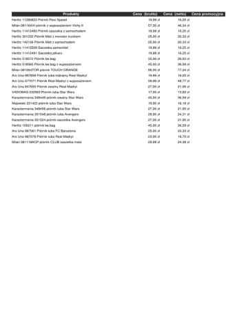 Produkty Cena (brutto) Cena (netto) Herlitz 11280823 Piórnik Flexi Speed 19,99 zł 16,25 zł Milan 081164VI piórnik z wyposażeniem Vichy II 57,00 zł 46,34 zł Herlitz 11412483 Piórnik saszetka z samochodem 19,99 zł 16,25 zł Herlitz 301232 Piórnik Midi z monster truckiem 25,00 zł 20,33 zł Herlitz 142128 Piórnik Midi z samochodem 25,00 zł 20,33 zł Herlitz 11412509 Saszetka samochód 19,99 zł 16,25 zł Herlitz 11412491 Saszetka piłkarz 19,99 zł 16,25 zł Herlitz 518572 Piórnik be.bag 33,00 zł 26,83 zł Herlitz 518565 Piórnik be.bag z wyposażeniem 45,00 zł 36,59 zł Milan 081264TOR piórnik TOUCH ORANGE 95,00 zł 77,24 zł Ars Una 997658 Piórnik tuba trójkątny Real Madryt 19,99 zł 16,25 zł Ars Una 577071 Piórnik Real Madryt z wyposażeniem 59,99 zł 48,77 zł Ars Una 847655 Piórnik owalny Real Madryt 27,00 zł 21,95 zł VADOBAG 232563 Piórnik tuba Star Wars 17,00 zł 13,82 zł Karactermania 348449 piórnik owalny Star Wars 45,00 zł 36,59 zł Majewski 221422 piórnik tuba Star Wars 19,90 zł 16,18 zł Karactermania 348456 piórnik tuba Star Wars 27,00 zł 21,95 zł Karactermania 351548 piórnik tuba Avengers 29,90 zł 24,31 zł Karactermania 351524 piórnik saszetka Avengers 27,00 zł 21,95 zł Herlitz 100211 piórnik be.bag 45,00 zł 36,59 zł Ars Una 987061 Piórnik tuba FC Barcelona 25,00 zł 20,33 zł Ars Una 987078 Piórnik tuba Real Madryt 23,00 zł 18,70 zł Milan 081118ACP piórnik CLUB saszetka mała 29,99 zł 24,38 zł Cena promocyjna