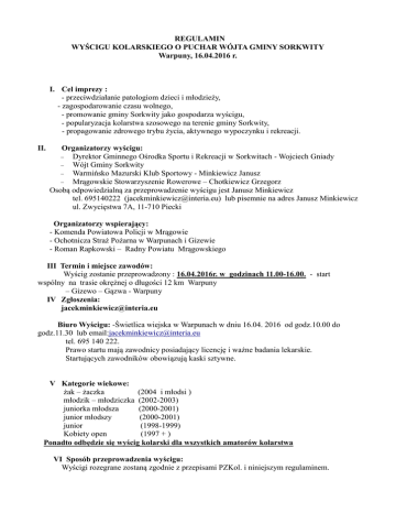 REGULAMIN WYŚCIGU KOLARSKIEGO O PUCHAR WÓJTA GMINY SORKWITY Warpuny, 16.04.2016 r. I. Cel imprezy : - przeciwdziałanie patologiom dzieci i młodzieży, - zagospodarowanie czasu wolnego, - promowanie gminy Sorkwity jako gospodarza wyścigu, - popularyzacja kolarstwa szosowego na terenie gminy Sorkwity, - propagowanie zdrowego trybu życia, aktywnego wypoczynku i rekreacji. II. Organizatorzy wyścigu: Dyrektor Gminnego Ośrodka Sportu i Rekreacji w Sorkwitach - Wojciech Gniady Wójt Gminy Sorkwity Warmińsko Mazurski Klub Sportowy - Minkiewicz Janusz Mrągowskie Stowarzyszenie Rowerowe – Chotkiewicz Grzegorz Osobą odpowiedzialną za przeprowadzenie wyścigu jest Janusz Minkiewicz tel. 695140222 ([email protected]) lub pisemnie na adres Janusz Minkiewicz ul. Zwycięstwa 7A, 11-710 Piecki Organizatorzy wspierający: - Komenda Powiatowa Policji w Mrągowie - Ochotnicza Straż Pożarna w Warpunach i Gizewie - Roman Rapkowski – Radny Powiatu Mrągowskiego III Termin i miejsce zawodów: Wyścig zostanie przeprowadzony : 16.04.2016r. w godzinach 11.00-16.00. - start wspólny na trasie okrężnej o długości 12 km Warpuny – Gizewo – Gązwa - Warpuny IV Zgłoszenia: [email protected] Biuro Wyścigu: -Świetlica wiejska w Warpunach w dniu 16.04. 2016 od godz.10.00 do godz.11.30 lub email:[email protected] tel. 695 140 222. Prawo startu mają zawodnicy posiadający licencję i ważne badania lekarskie. Startujących zawodników obowiązują kaski sztywne. V Kategorie wiekowe: żak – żaczka (2004 i młodsi ) młodzik – młodziczka (2002-2003) juniorka młodsza (2000-2001) junior młodszy (2000-2001) junior (1998-1999) Kobiety open (1997 + ) Ponadto odbędzie się wyścig kolarski dla wszystkich amatorów kolarstwa VI Sposób przeprowadzenia wyścigu: Wyścigi rozegrane zostaną zgodnie z przepisami PZKol. i niniejszym regulaminem. VII Program minutowy: 09.00 – 10.30 zapisy uczestników na listy startowe 10.45 – prezentacja ekip biorących udział w zawodach kolarskich 11.00 – odprawa techniczna i otwarcie zawodów 12.0 – 12.15 – start pierwszej grupy zawodników. VIII Zasady finansowania: Koszty organizacyjne wyścigu pokrywają organizatorzy. Opłaty startowe zgodnie z przepisami PZKol. IX Nagrody: I – III m-ce w każdej kategorii wiekowej dyplom i nagroda rzeczowa. Wyścig ze startu wspólnego rozegrany zostanie na trasie okrężnej przy częściowo zamkniętym ruchu drogowym dla zasadniczej grupy. Obowiązuje uczestników ruch tylko i wyłącznie prawostronny – pozostali kolarze zobowiązani są do przestrzegania przepisów ruchu drogowego. Każdy uczestnik ubezpiecza się od następstw nieszczęśliwych wypadków we własnym zakresie (OC i NW) i uczestniczy w wyścigu na własną odpowiedzialność. Organizator nie odpowiada za szkody wyrządzone przez lub na rzecz uczestników wyścigów i osób towarzyszących. Komisja sędziowska zostaje powołana spośród sędziów WMZKol. Organizator zastrzega sobie prawo do interpretacji niniejszego regulaminu w porozumieniu z Sędzią Głównym wyścigu. Wyścig ze startu wspólnego rozegrany zostanie na trasie okrężnej przy zamkniętym ruchu drogowym dla zasadniczej grupy. Obowiązuje uczestników ruch tylko i wyłącznie prawostronny – pozostali kolarze zobowiązani są do przestrzegania przepisów ruchu drogowego. Adres szpitala : Szpital Miejski w Mrągowie ul. Wolności 3. tel. 89 7419400 lub 112 Regulamin zatwierdzony przez WMZKol.