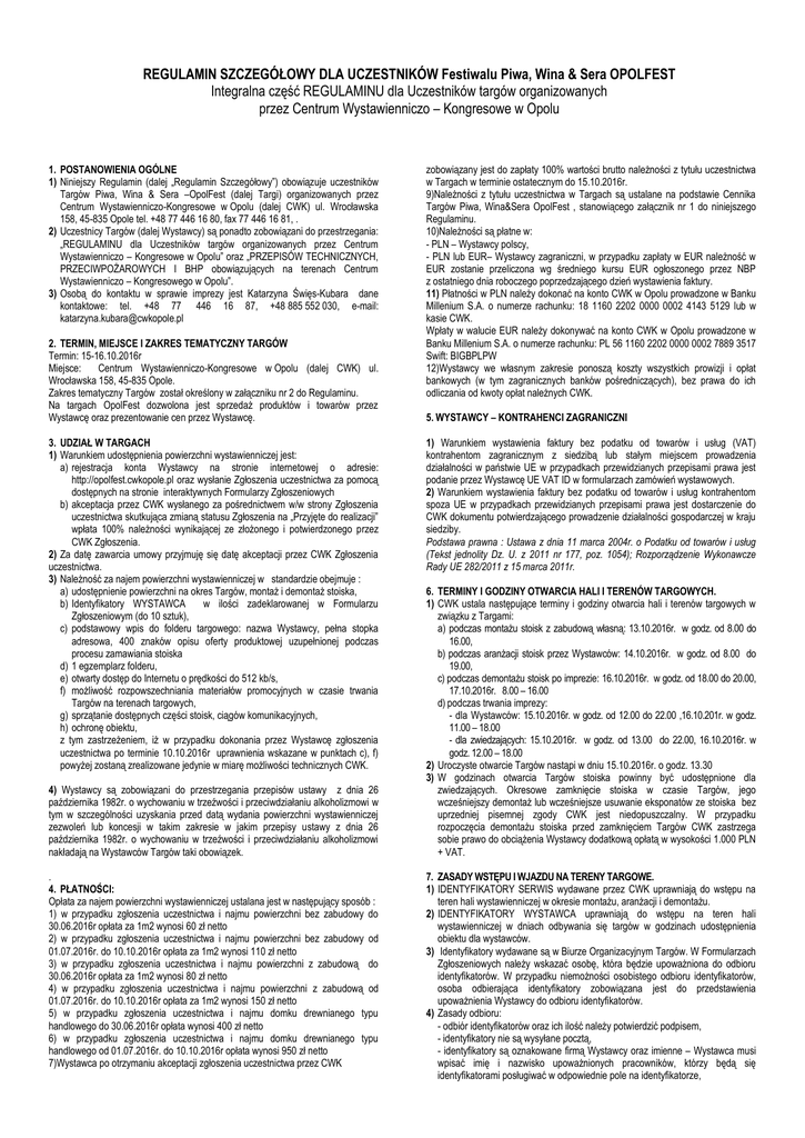REGULAMIN SZCZEGÓŁOWY DLA UCZESTNIKÓW Festiwalu Piwa, Wina & Sera OPOLFEST Integralna część REGULAMINU dla Uczestników targów organizowanych przez Centrum Wystawienniczo – Kongresowe w Opolu 1. POSTANOWIENIA OGÓLNE 1) Niniejszy Regulamin (dalej „Regulamin Szczegółowy”) obowiązuje uczestników Targów Piwa, Wina & Sera –OpolFest (dalej Targi) organizowanych przez Centrum Wystawienniczo-Kongresowe w Opolu (dalej CWK) ul. Wrocławska 158, 45-835 Opole tel. +48 77 446 16 80, fax 77 446 16 81, . 2) Uczestnicy Targów (dalej Wystawcy) są ponadto zobowiązani do przestrzegania: „REGULAMINU dla Uczestników targów organizowanych przez Centrum Wystawienniczo – Kongresowe w Opolu” oraz „PRZEPISÓW TECHNICZNYCH, PRZECIWPOŻAROWYCH I BHP obowiązujących na terenach Centrum Wystawienniczo – Kongresowego w Opolu”. 3) Osobą do kontaktu w sprawie imprezy jest Katarzyna Święs-Kubara dane kontaktowe: tel. +48 77 446 16 87, +48 885 552 030, e-mail: [email protected] 2. TERMIN, MIEJSCE I ZAKRES TEMATYCZNY TARGÓW Termin: 15-16.10.2016r Miejsce: Centrum Wystawienniczo-Kongresowe w Opolu (dalej CWK) ul. Wrocławska 158, 45-835 Opole. Zakres tematyczny Targów został określony w załączniku nr 2 do Regulaminu. Na targach OpolFest dozwolona jest sprzedaż produktów i towarów przez Wystawcę oraz prezentowanie cen przez Wystawcę. 3. UDZIAŁ W TARGACH 1) Warunkiem udostępnienia powierzchni wystawienniczej jest: a) rejestracja konta Wystawcy na stronie internetowej o adresie: http://opolfest.cwkopole.pl oraz wysłanie Zgłoszenia uczestnictwa za pomocą dostępnych na stronie interaktywnych Formularzy Zgłoszeniowych b) akceptacja przez CWK wysłanego za pośrednictwem w/w strony Zgłoszenia uczestnictwa skutkująca zmianą statusu Zgłoszenia na „Przyjęte do realizacji” wpłata 100% należności wynikającej ze złożonego i potwierdzonego przez CWK Zgłoszenia. 2) Za datę zawarcia umowy przyjmuję się datę akceptacji przez CWK Zgłoszenia uczestnictwa. 3) Należność za najem powierzchni wystawienniczej w standardzie obejmuje : a) udostępnienie powierzchni na okres Targów, montaż i demontaż stoiska, b) Identyfikatory WYSTAWCA w ilości zadeklarowanej w Formularzu Zgłoszeniowym (do 10 sztuk), c) podstawowy wpis do folderu targowego: nazwa Wystawcy, pełna stopka adresowa, 400 znaków opisu oferty produktowej uzupełnionej podczas procesu zamawiania stoiska d) 1 egzemplarz folderu, e) otwarty dostęp do Internetu o prędkości do 512 kb/s, f) możliwość rozpowszechniania materiałów promocyjnych w czasie trwania Targów na terenach targowych, g) sprzątanie dostępnych części stoisk, ciągów komunikacyjnych, h) ochronę obiektu, z tym zastrzeżeniem, iż w przypadku dokonania przez Wystawcę zgłoszenia uczestnictwa po terminie 10.10.2016r uprawnienia wskazane w punktach c), f) powyżej zostaną zrealizowane jedynie w miarę możliwości technicznych CWK. 4) Wystawcy są zobowiązani do przestrzegania przepisów ustawy z dnia 26 października 1982r. o wychowaniu w trzeźwości i przeciwdziałaniu alkoholizmowi w tym w szczególności uzyskania przed datą wydania powierzchni wystawienniczej zezwoleń lub koncesji w takim zakresie w jakim przepisy ustawy z dnia 26 października 1982r. o wychowaniu w trzeźwości i przeciwdziałaniu alkoholizmowi nakładają na Wystawców Targów taki obowiązek. . 4. PŁATNOŚCI: Opłata za najem powierzchni wystawienniczej ustalana jest w następujący sposób : 1) w przypadku zgłoszenia uczestnictwa i najmu powierzchni bez zabudowy do 30.06.2016r opłata za 1m2 wynosi 60 zł netto 2) w przypadku zgłoszenia uczestnictwa i najmu powierzchni bez zabudowy od 01.07.2016r. do 10.10.2016r opłata za 1m2 wynosi 110 zł netto 3) w przypadku zgłoszenia uczestnictwa i najmu powierzchni z zabudową do 30.06.2016r opłata za 1m2 wynosi 80 zł netto 4) w przypadku zgłoszenia uczestnictwa i najmu powierzchni z zabudową od 01.07.2016r. do 10.10.2016r opłata za 1m2 wynosi 150 zł netto 5) w przypadku zgłoszenia uczestnictwa i najmu domku drewnianego typu handlowego do 30.06.2016r opłata wynosi 400 zł netto 6) w przypadku zgłoszenia uczestnictwa i najmu domku drewnianego typu handlowego od 01.07.2016r. do 10.10.2016r opłata wynosi 950 zł netto 7)Wystawca po otrzymaniu akceptacji zgłoszenia uczestnictwa przez CWK zobowiązany jest do zapłaty 100% wartości brutto należności z tytułu uczestnictwa w Targach w terminie ostatecznym do 15.10.2016r. 9)Należności z tytułu uczestnictwa w Targach są ustalane na podstawie Cennika Targów Piwa, Wina&Sera OpolFest , stanowiącego załącznik nr 1 do niniejszego Regulaminu. 10)Należności są płatne w: - PLN – Wystawcy polscy, - PLN lub EUR– Wystawcy zagraniczni, w przypadku zapłaty w EUR należność w EUR zostanie przeliczona wg średniego kursu EUR ogłoszonego przez NBP z ostatniego dnia roboczego poprzedzającego dzień wystawienia faktury. 11) Płatności w PLN należy dokonać na konto CWK w Opolu prowadzone w Banku Millenium S.A. o numerze rachunku: 18 1160 2202 0000 0002 4143 5129 lub w kasie CWK. Wpłaty w walucie EUR należy dokonywać na konto CWK w Opolu prowadzone w Banku Millenium S.A. o numerze rachunku: PL 56 1160 2202 0000 0002 7889 3517 Swift: BIGBPLPW 12)Wystawcy we własnym zakresie ponoszą koszty wszystkich prowizji i opłat bankowych (w tym zagranicznych banków pośredniczących), bez prawa do ich odliczania od kwoty opłat należnych CWK. 5. WYSTAWCY – KONTRAHENCI ZAGRANICZNI 1) Warunkiem wystawienia faktury bez podatku od towarów i usług (VAT) kontrahentom zagranicznym z siedzibą lub stałym miejscem prowadzenia działalności w państwie UE w przypadkach przewidzianych przepisami prawa jest podanie przez Wystawcę UE VAT ID w formularzach zamówień wystawowych. 2) Warunkiem wystawienia faktury bez podatku od towarów i usług kontrahentom spoza UE w przypadkach przewidzianych przepisami prawa jest dostarczenie do CWK dokumentu potwierdz