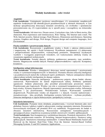 Moduły kształcenia – cele i treści Angielski Cele kształcenia: Umiejętności językowe umożliwiające: (1) zrozumienie zasadniczych aspektów konkretnych lub abstrakcyjnych przedstawionych w tekstach złożonych, w tym dyskusji specjalistycznej dotyczącej tematyki zawodowej, (2) swobodne i spontaniczne porozumiewanie się, (3) wypowiadanie się w sposób jasny i szczegółowy na różnorodne tematy Treści kształcenia: Job interview, Dream career, Curriculum vitae, Jobs in Short stories, film characters, Past experiences and reminiscences, Risk Taking, The Internet and e-mail, The Web, Internet security, Optical storage, Flash Memory, Dimensions and distances, Operating systems, Graphics and design, Web design, Program design and computer languages, Java Environment Fizyka nośników i przetwarzania danych Cele kształcenia: Rozszerzenie i pogłębienie wiedzy z fizyki z zakresu elektryczności i magnetyzmu, fal, optyki i fizyki kwantowej. Wyrobienie umiejętności: (1) planowania i przeprowadzania eksperymentów, wykonywania pomiarów, interpretacji uzyskanych wyników i wyciągania poprawnych wniosków, (2) wykorzystania zdobytej wiedzy do rozumienia zagadnień technicznych. Treści kształcenia: Nośniki danych: definicja, podstawowe parametry, typy nośników, historia. Magnetyczne nośniki danych. Pamięci półprzewodnikowe i optyczne. Komputery kwantowe. Inteligentne usługi informacyjne Cele kształcenia: Wiedza i umiejętności dotyczące metod reprezentacji i przetwarzania wiedzy w systemach komputerowych i w Internecie. Poznanie obszaru sztucznej inteligencji i jej podstawowych metod dla wybranych typów problemów. Nabycie umiejętności doboru odpowiedniej techniki inteligentnej do danego zadania. Treści kształcenia: Sztuczna inteligencja – podstawowe pojęcia, obszar badań, obszary zastosowań. Wprowadzenie do metod inspirowanych naturą. Problemy spełniania ograniczeń. Zadanie planowania jako przykład przeszukiwania przestrzeni stanów. Projektowanie gier logicznych. Wiedza i jej rola w systemach komputerowych. Systemy z bazą wiedzy. Systemy ekspertowe. Metody reprezentacji i przetwarzania wiedzy. Informacja niepewna i jej przetwarzanie. Wnioskowanie rozmyte. Wytwarzanie systemów ekspertowych. Pozyskiwanie wiedzy od ekspertów i z danych. Uczenie nadzorowane i nienadzorowane – idea, przykłady. Inteligentne systemy hybrydowe – wybrane przykłady. Sztuczna inteligencja w ujęciu historycznym i perspektywy rozwoju. Inżynieria internetowa Cele kształcenia: Poznanie istoty działania, projektowania, i wyzwań Internetu jako sieci globalnej. Szerszy i głębszy wgląd w adresowanie, routing i parametry internetu. Rozumienie nowoczesnych rozwiązań, jak protokół IPv6 czy mobilność. Przygotowanie do badań w obszarze inżynierii internetowej. Rozszerzenie umiejętności komunikacyjnych i sprzyjających pracy zespołowej za pomocą technik sieciowych i trendów aplikacyjnych. Treści kształcenia: Sieci komputerowe i architektura Internetu. Protokoły internetowe, IPv6. Routing, projektowanie routerów. IP Switching. Internet bezprzewodowy. Dostawcy usług aplikacyjnych. Internetowa transmisja mutimediów. Content-Based Multimedia Search and Retrieval on the Internet. Real-Time Video Over the Internet. Internet-Based Unified Messaging Systems. E-and M-Commerce Applications. Komputerowe systemy sterowania Cele kształcenia: Poznanie budowy i zasady działania komputerowych przemysłowych systemów sterowania. Nabycie umiejętności: (1) obsługiwania podstawowych przemysłowych standardów komunikacyjnych, (2) projektowania komputerowych systemów sterowania. Treści kształcenia: Struktura i zasada pracy przemysłowych cyfrowych systemów sterowania. Warunki sprzętowe i programowe. System operacyjny czasu rzeczywistego. Współpraca systemu komputerowego z urządzeniami zewnętrznymi za pośrednictwem magistrali systemowej i standardowych interfejsów komunikacyjnych. Struktura komputerowej karty rozszerzeń do zastosowań przemysłowych. Przegląd rozwiązań dostępnych na rynku. Programowa obsługa kart rozszerzeń. Współpraca systemu komputerowego ze sterownikami przemysłowymi. Przegląd podstawowych przemysłowych interfejsów komunikacyjnych. Systemy SCADA nadzoru procesu produkcyjnego . Komputerowo wspomagane projektowanie i wizualizacja Cele kształcenia: Poznanie systemów projektowania i wizualizacji na przykładzie oprogramowań AutoCad i InTouch Wonderware. Nabycie podstawowych umiejętności stosowania tych oprogramowań w kontekście użytkownika. Treści kształcenia: AutoCAD: Cechy i właściwości środowiska. Biblioteki, ich edycja i wykorzystanie edycja. Tworzenie bloków i własnych bibliotek symboli stosowanych w schematach technicznych. Opis, skalowanie i przygotowanie dokumentacji technicznej do wydruku. In Touch: Edytor graficzny, tworzenie okien, zmiennych, połączeń animacyjnych oraz skryptów; tworzenie: alarmów, raportów, trendów, zmiennych pośrednich. Komunikacja z innymi aplikacjami Windows i ze sterownikiem. Zbieranie i archiwizowanie danych, raportowanie, receptury, rozproszone alarmy i rozproszone zbieranie danych. Komunikacja między aplikacjami In Touch. Komunikacja interpersonalna Cele kształcenia: Poszerzenie wiedzy niezbędnej w codziennej pracy w zespole. Nabycie praktycznych umiejętności związanych z procesem komunikacji interpersonalnej i rozwiązywaniem konfliktów. Poznanie znaczenia kompetencji społecznych i osobistych niezbędnych do współpracy. Treści kształcenia: Teoretyczne podstawy umiejętności interpersonalnych: funkcje procesu komunikacji w pracy zespołowej, zasady skutecznej komunikacji, zakłócenia i ograniczenia w procesie porozumiewania się oraz sposoby radzenia sobie z nimi. Konflikty i ich rozwiązywanie: istota i podłoże konfliktów, nowoczesne podejście do konfliktów, sposoby rozwiązywania konfliktów, skutki pozytywne i negatywne konfliktów, specyfika negocjacji